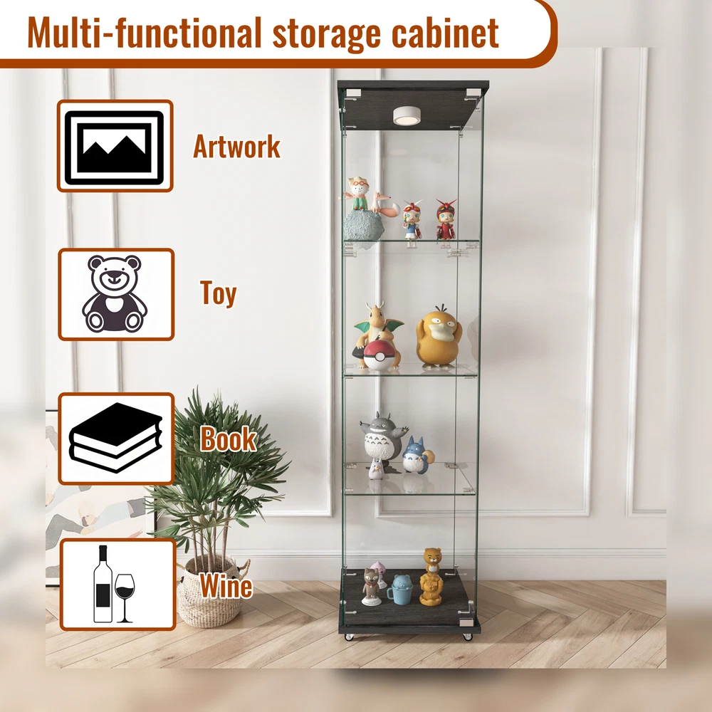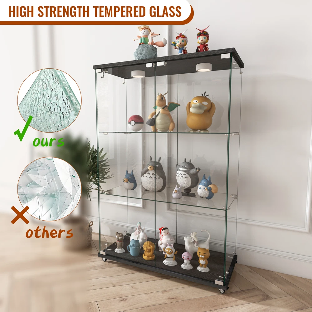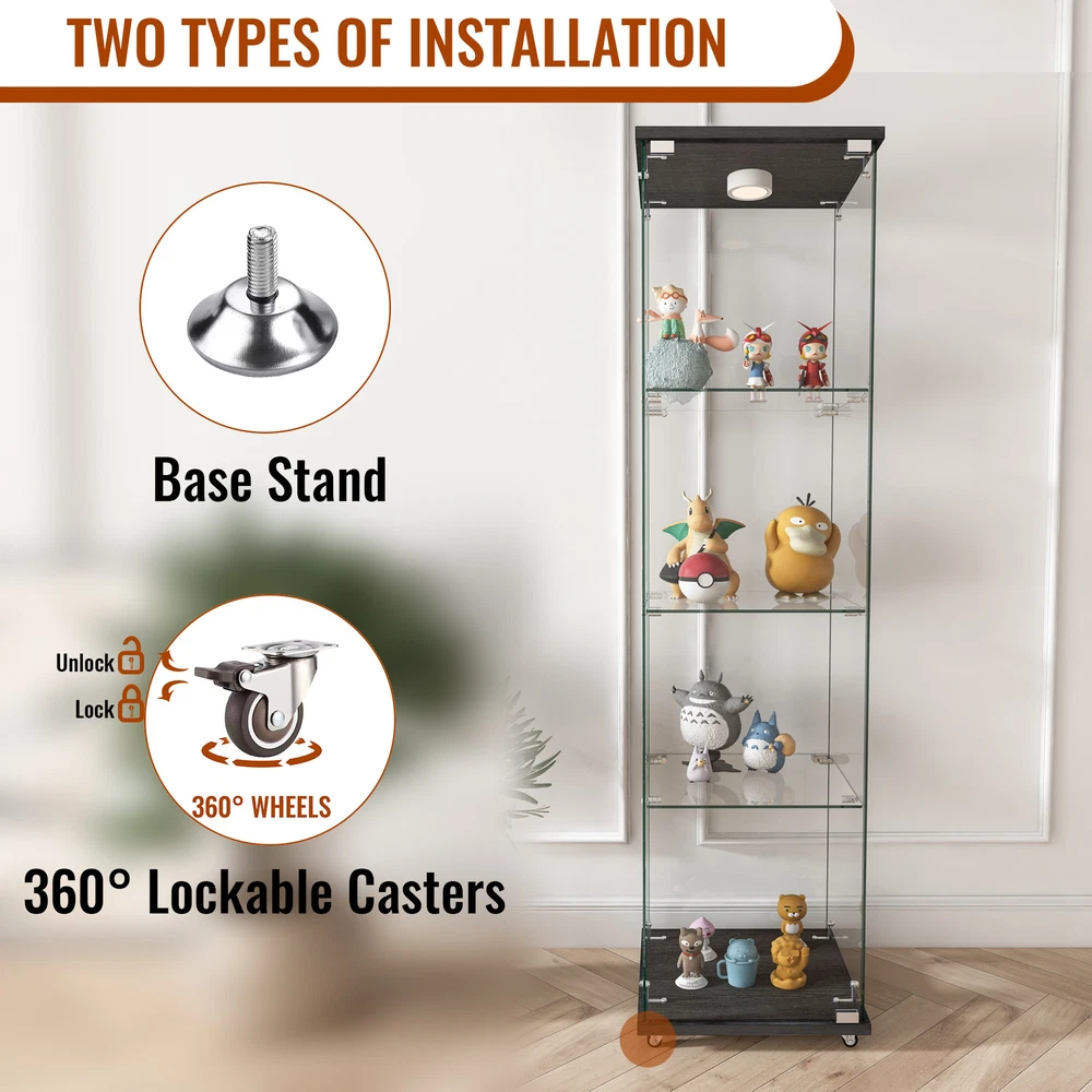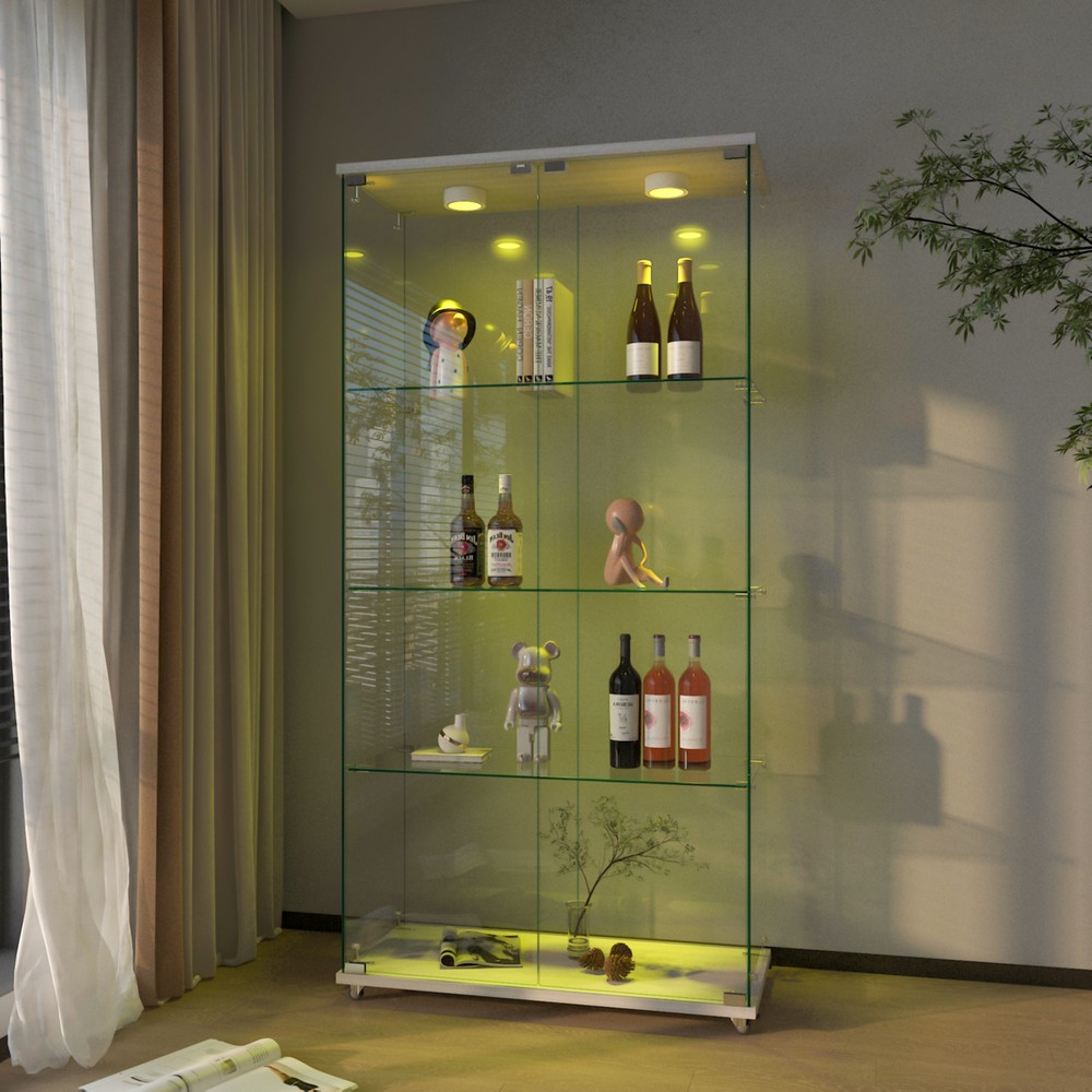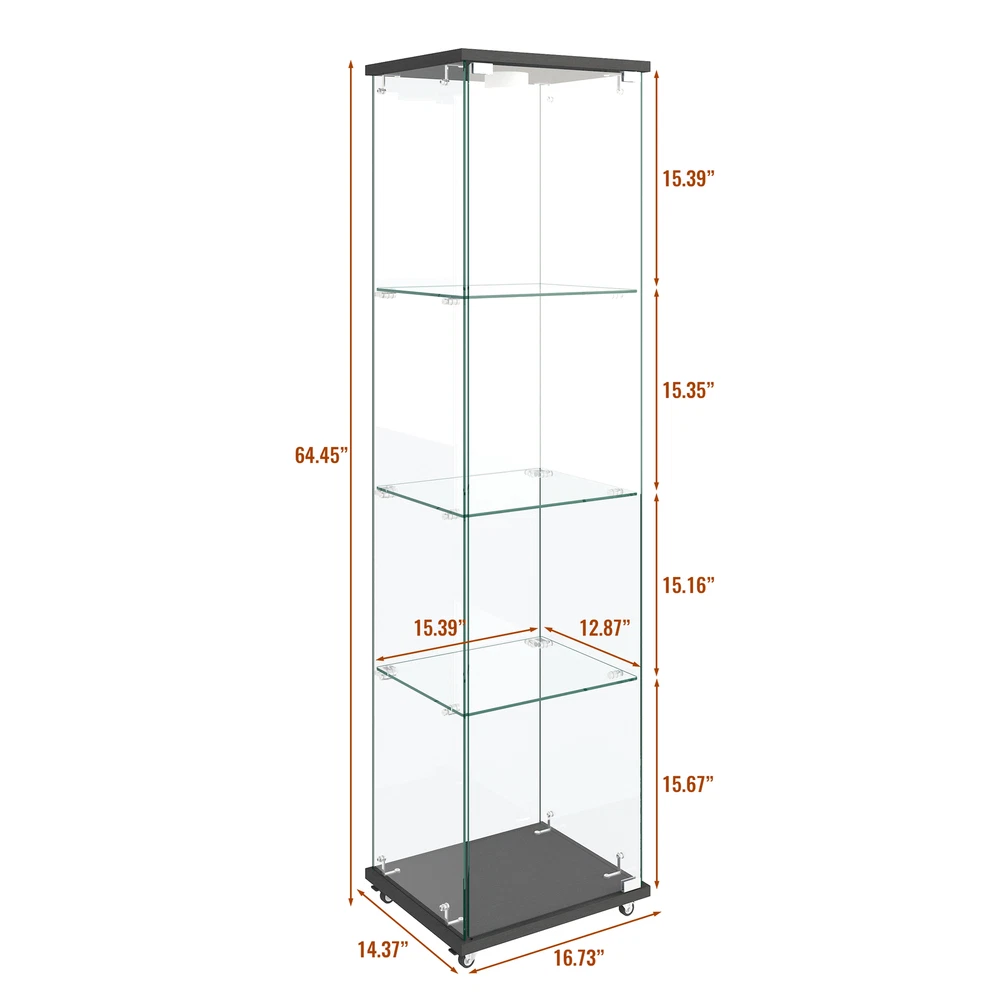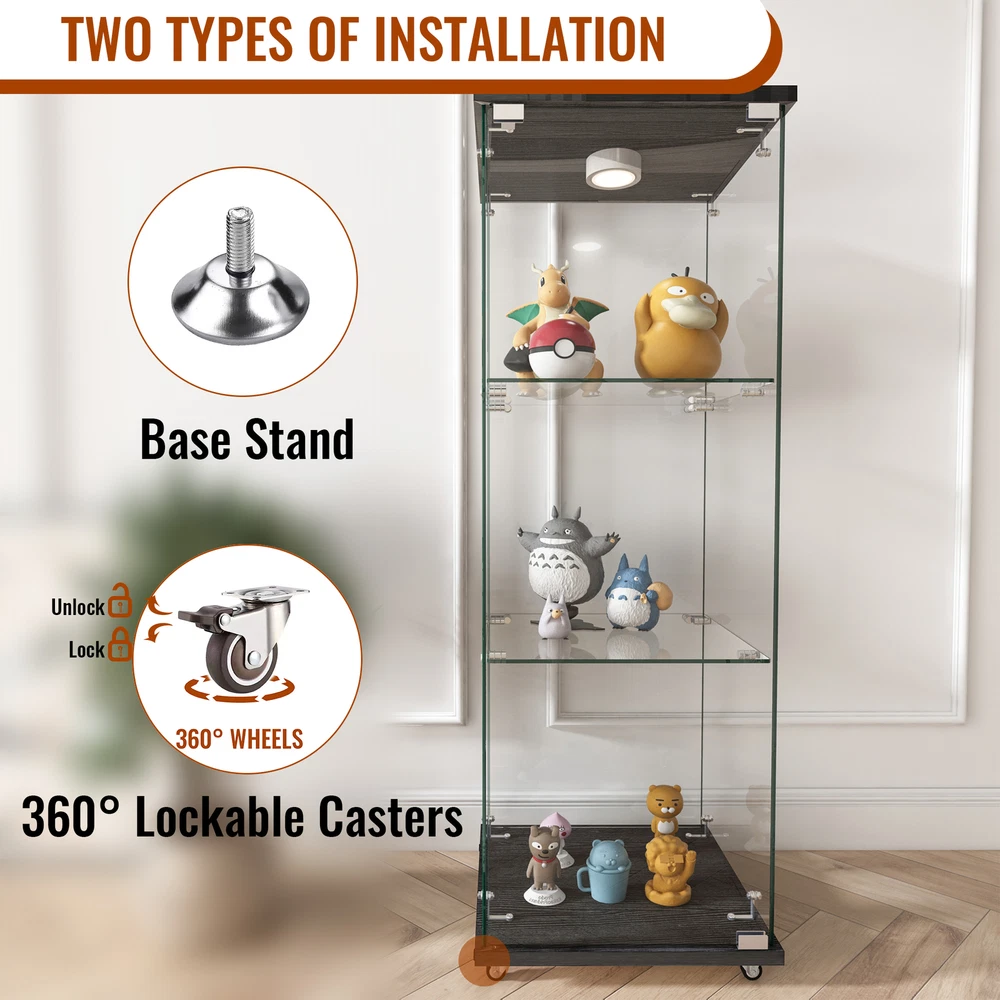 Glass Display Cabinet with LED Lights Modern Collectibles Toy Organizers Rack Features 1.Glass Display Cabinet: Size 64.25"(H) x 32.09"(L) x 14.37"(W) inches, each tempered glass is 5mm thick. The 4-layer shelf is designed to be sturdy and stylish. The glass doors are easy to open and close. It is equipped with 4 caster wheels with brakes. 2.load-bearing: Each layer of the glass shelf can bear a maximum weight of 45 pounds. 3.Enhanced Protection: Made of tough tempered glass and MDF top and bottom panels. There are fixed accessories to connect the side glass and the glass shelves, which can ensure maximum stability. It is durable and practical, suitable for daily use. 4.Store all kinds of items in this glass cabinet. The glass doors help to keep out dust and protect your collections well. 5.It is highly suitable for displaying models, photos, medals, action figures, wine bottles, toys, works of art and ornaments. The transparent glass is an ideal choice for showcasing personal collections and items of commemorative significance. 6.Customizable Lighting: This display cabinet is equipped with 2 colorful lights and a remote control with adjustable colors, allowing you to create the perfect atmosphere for any occasion. There are 12 adjustable colors to choose from, and you can freely adjust the brightness to easily set the atmosphere that suits your preferences or the theme of the event. 7.Easy to clean: The glass material is easy to clean, which can save you a lot of time. 8.Aesthetic Appeal: With its simple design that is both Stylish and Attractive, it seamlessly blends into various modern home environments, suitable for homes, bedrooms, living rooms, offices, shopping centers, and more. 9.Quick Installation: This glass display cabinet is designed for convenience and can be easily assembled through a quick installation process. Just peel off the double-sided tape and stick the light strips on the top of the cabinet. There is no need for complicated wiring or tools, making the installation effortless and worry-free.