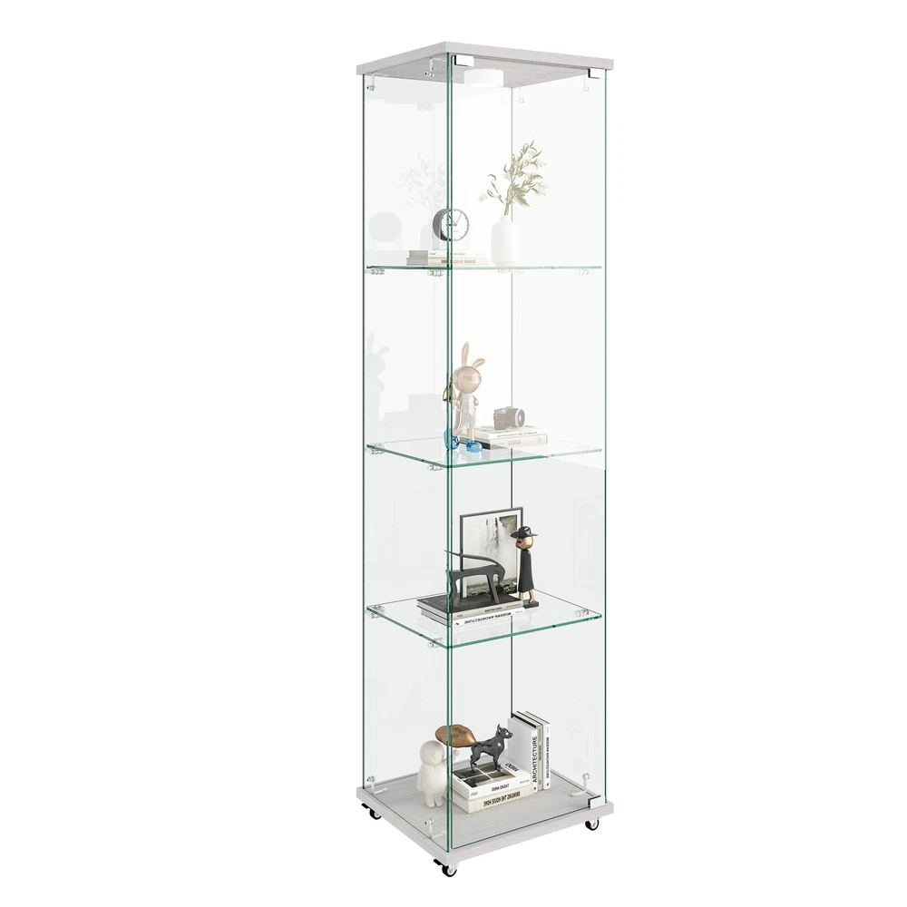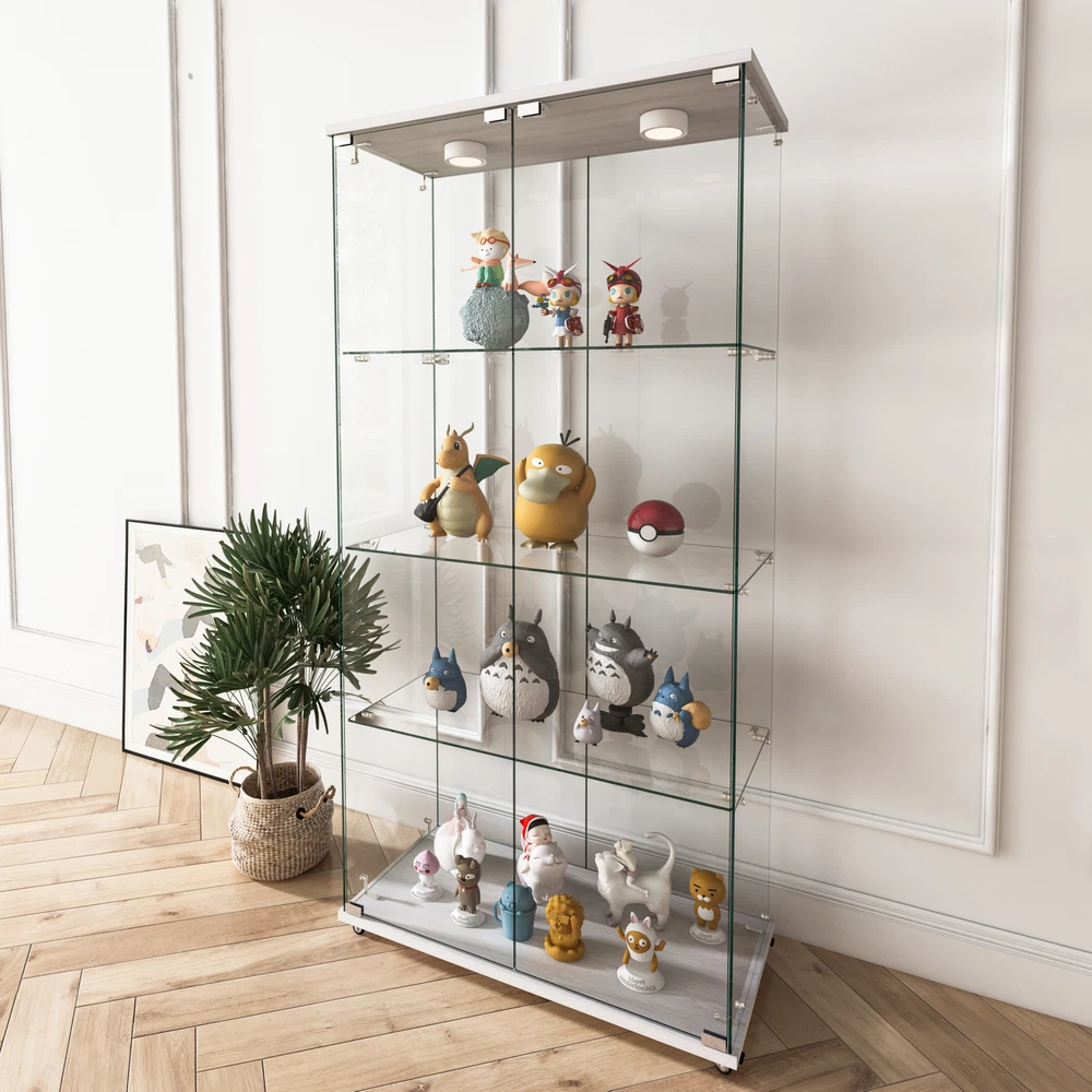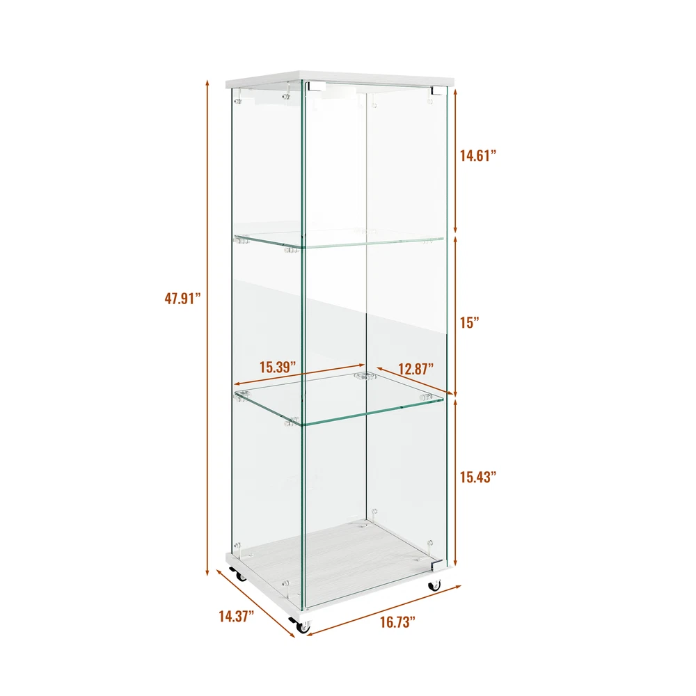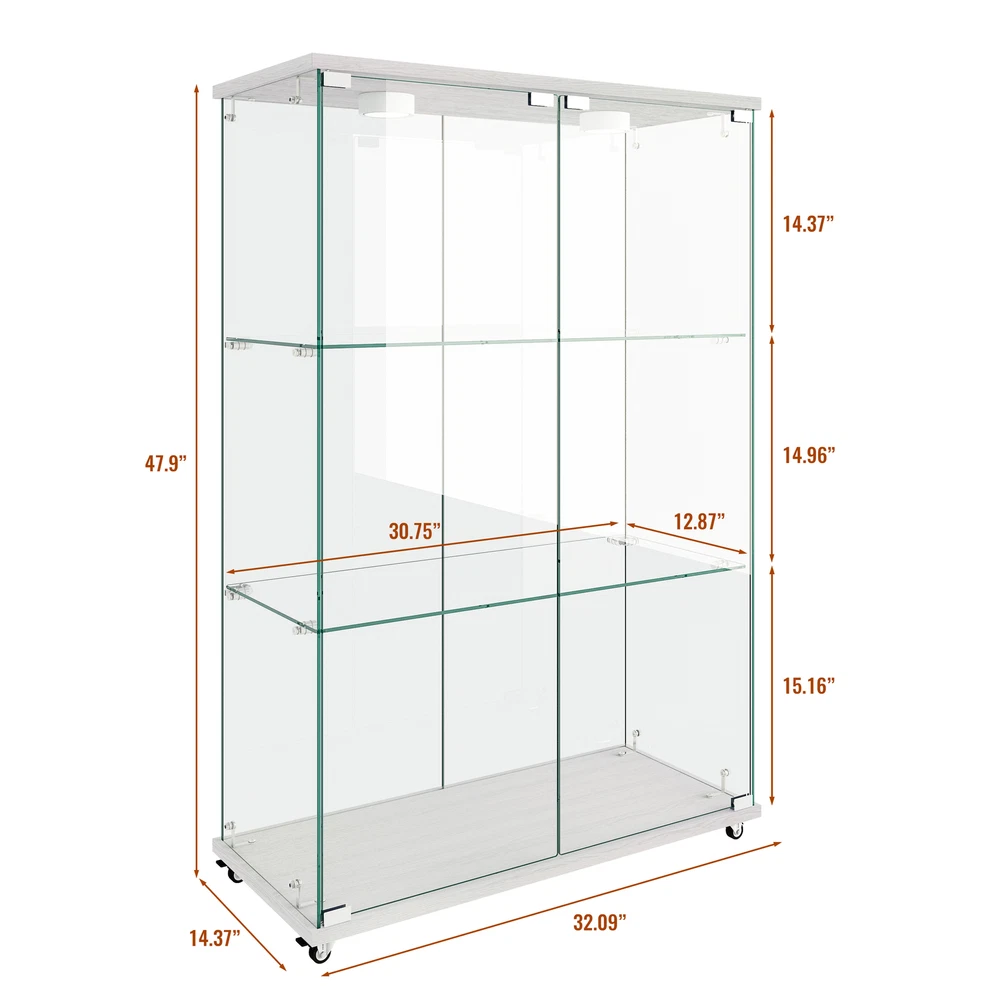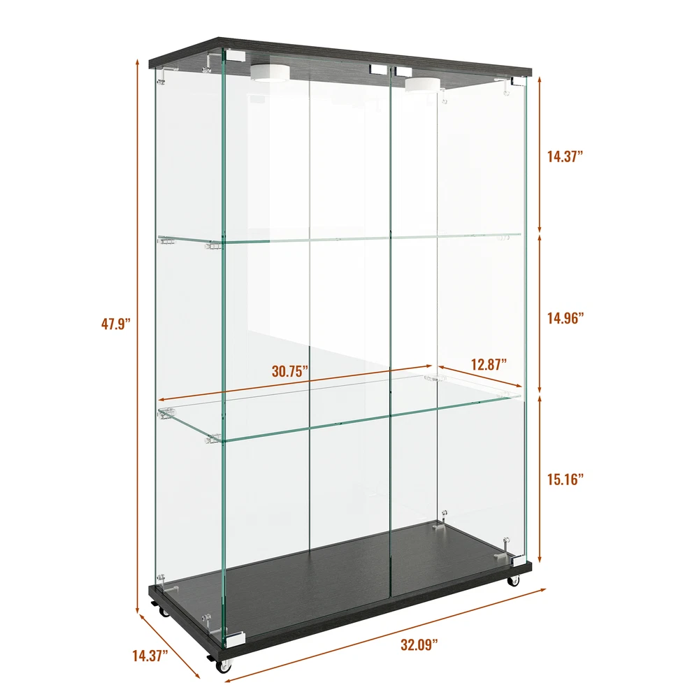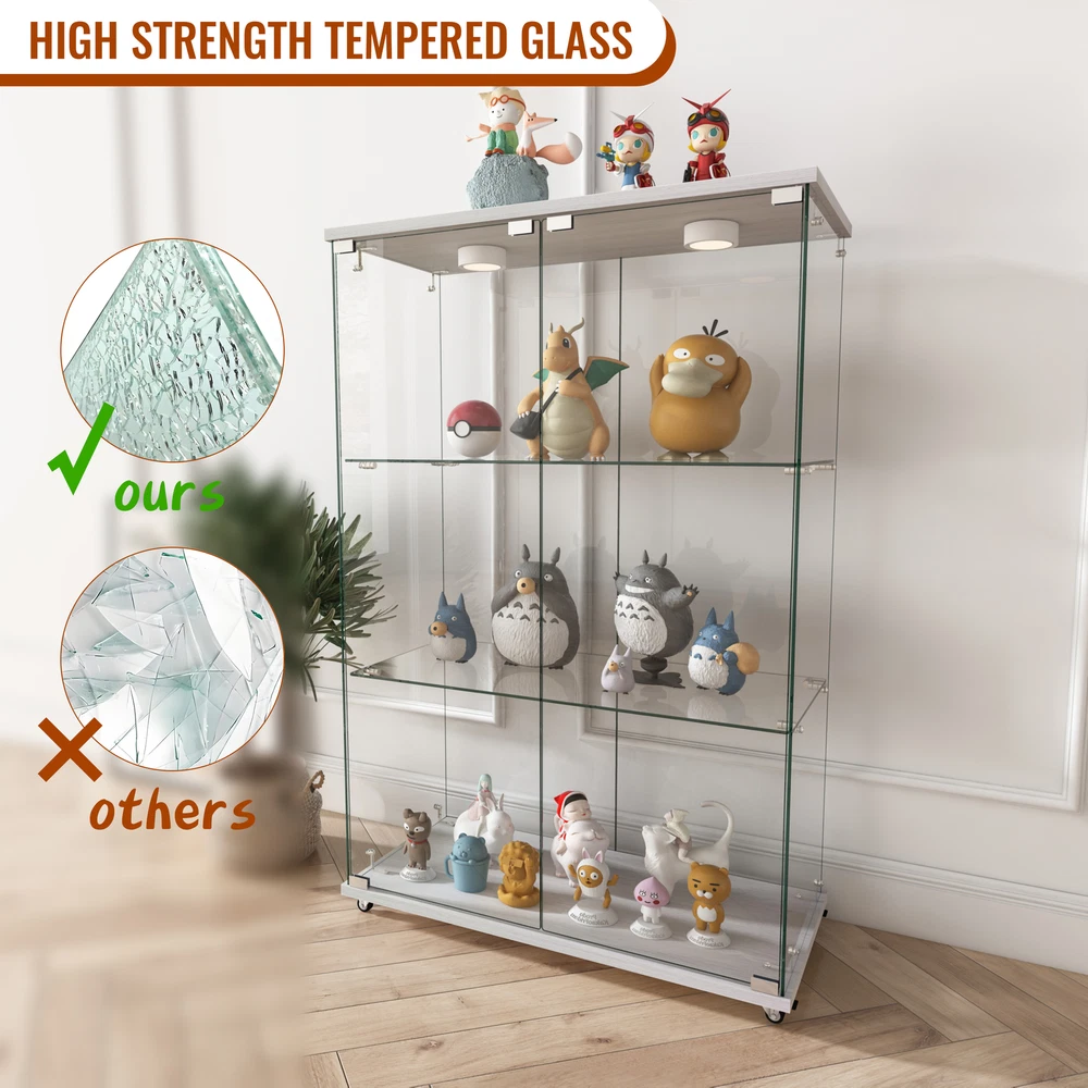 Glass Display Cabinet with LED Lights Modern Collectibles Toy Organizers Rack Features 1.Glass Display Cabinet: Size 64.25"(H) x 32.09"(L) x 14.37"(W) inches, each tempered glass is 5mm thick. The 4-layer shelf is designed to be sturdy and stylish. The glass doors are easy to open and close. It is equipped with 4 caster wheels with brakes. 2.load-bearing: Each layer of the glass shelf can bear a maximum weight of 45 pounds. 3.Enhanced Protection: Made of tough tempered glass and MDF top and bottom panels. There are fixed accessories to connect the side glass and the glass shelves, which can ensure maximum stability. It is durable and practical, suitable for daily use. 4.Store all kinds of items in this glass cabinet. The glass doors help to keep out dust and protect your collections well. 5.It is highly suitable for displaying models, photos, medals, action figures, wine bottles, toys, works of art and ornaments. The transparent glass is an ideal choice for showcasing personal collections and items of commemorative significance. 6.Customizable Lighting: This display cabinet is equipped with 2 colorful lights and a remote control with adjustable colors, allowing you to create the perfect atmosphere for any occasion. There are 12 adjustable colors to choose from, and you can freely adjust the brightness to easily set the atmosphere that suits your preferences or the theme of the event. 7.Easy to clean: The glass material is easy to clean, which can save you a lot of time. 8.Aesthetic Appeal: With its simple design that is both Stylish and Attractive, it seamlessly blends into various modern home environments, suitable for homes, bedrooms, living rooms, offices, shopping centers, and more. 9.Quick Installation: This glass display cabinet is designed for convenience and can be easily assembled through a quick installation process. Just peel off the double-sided tape and stick the light strips on the top of the cabinet. There is no need for complicated wiring or tools, making the installation effortless and worry-free.