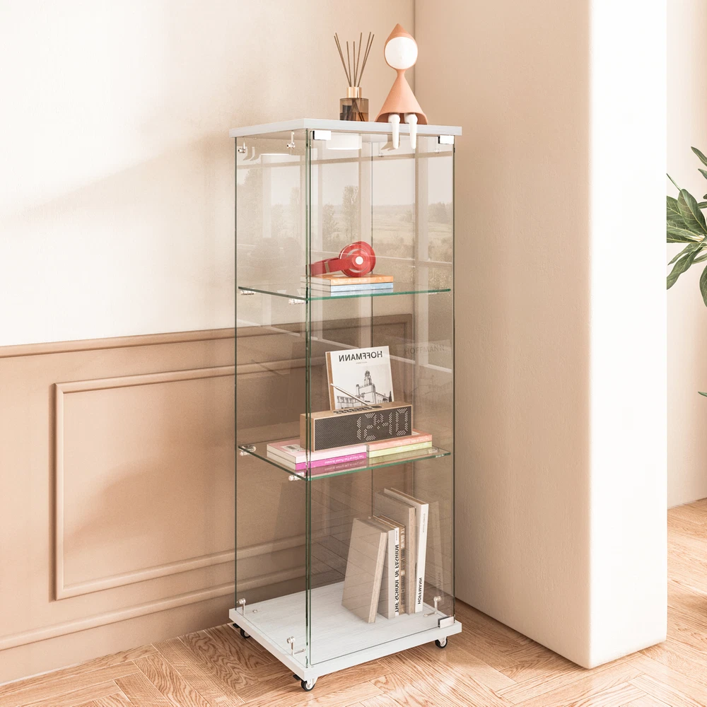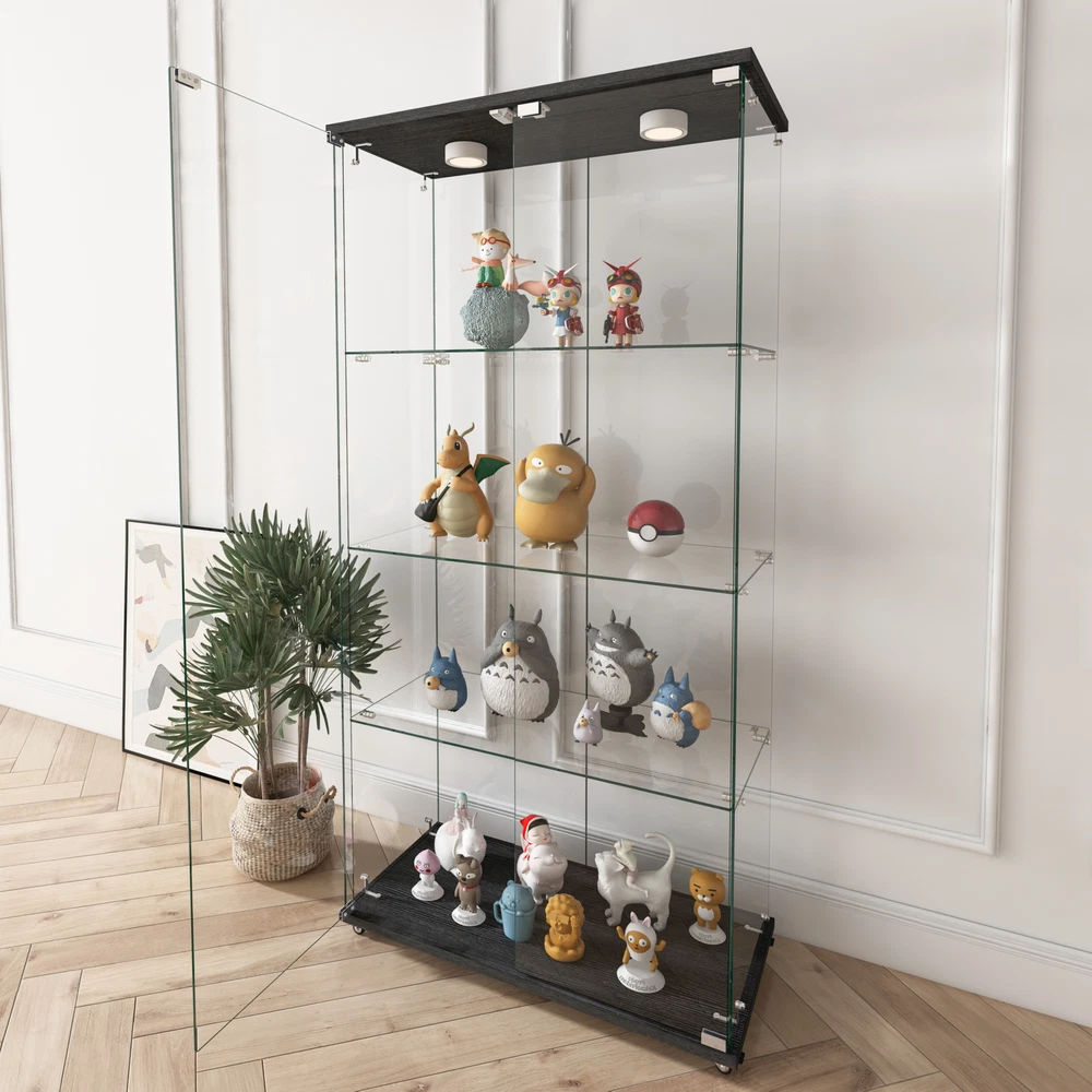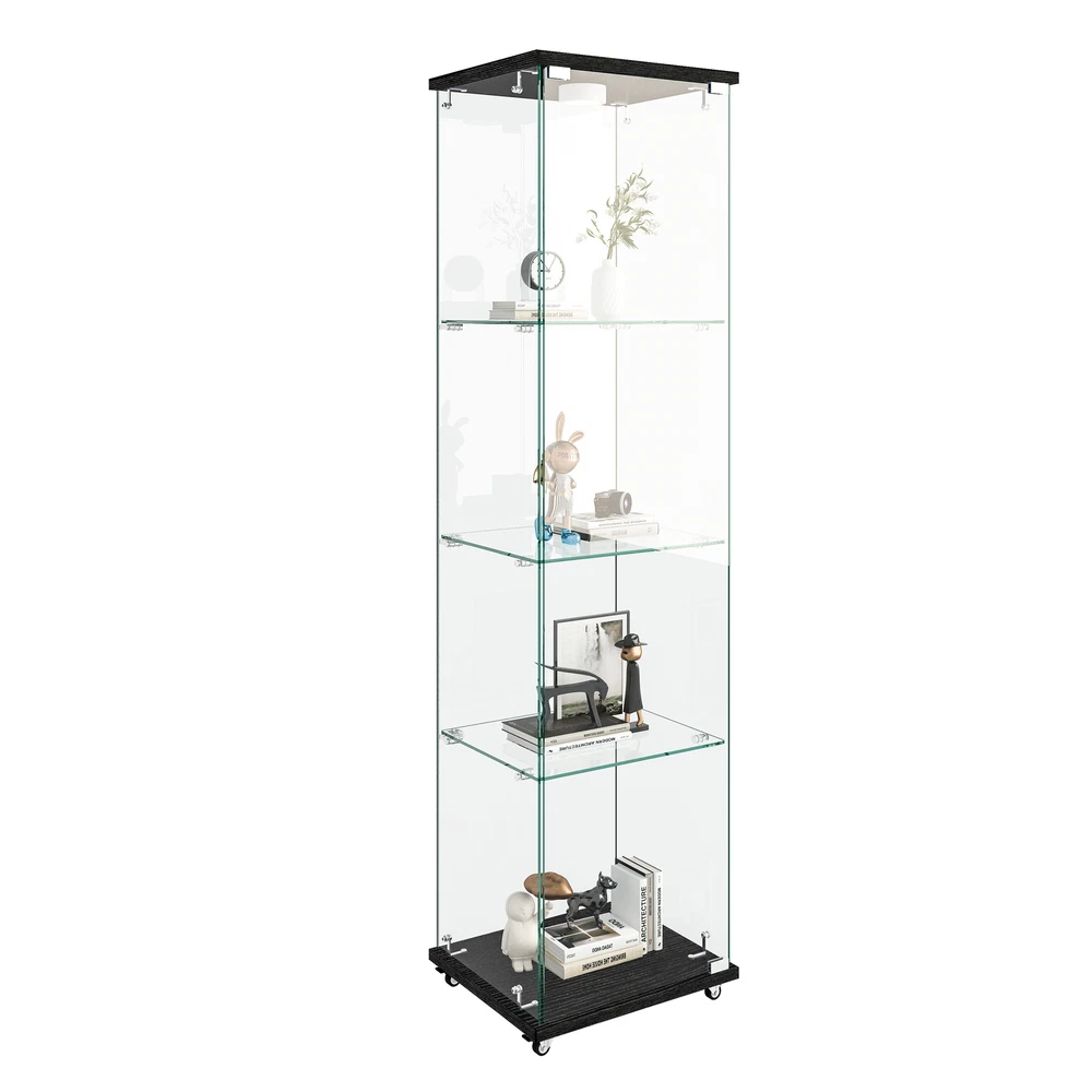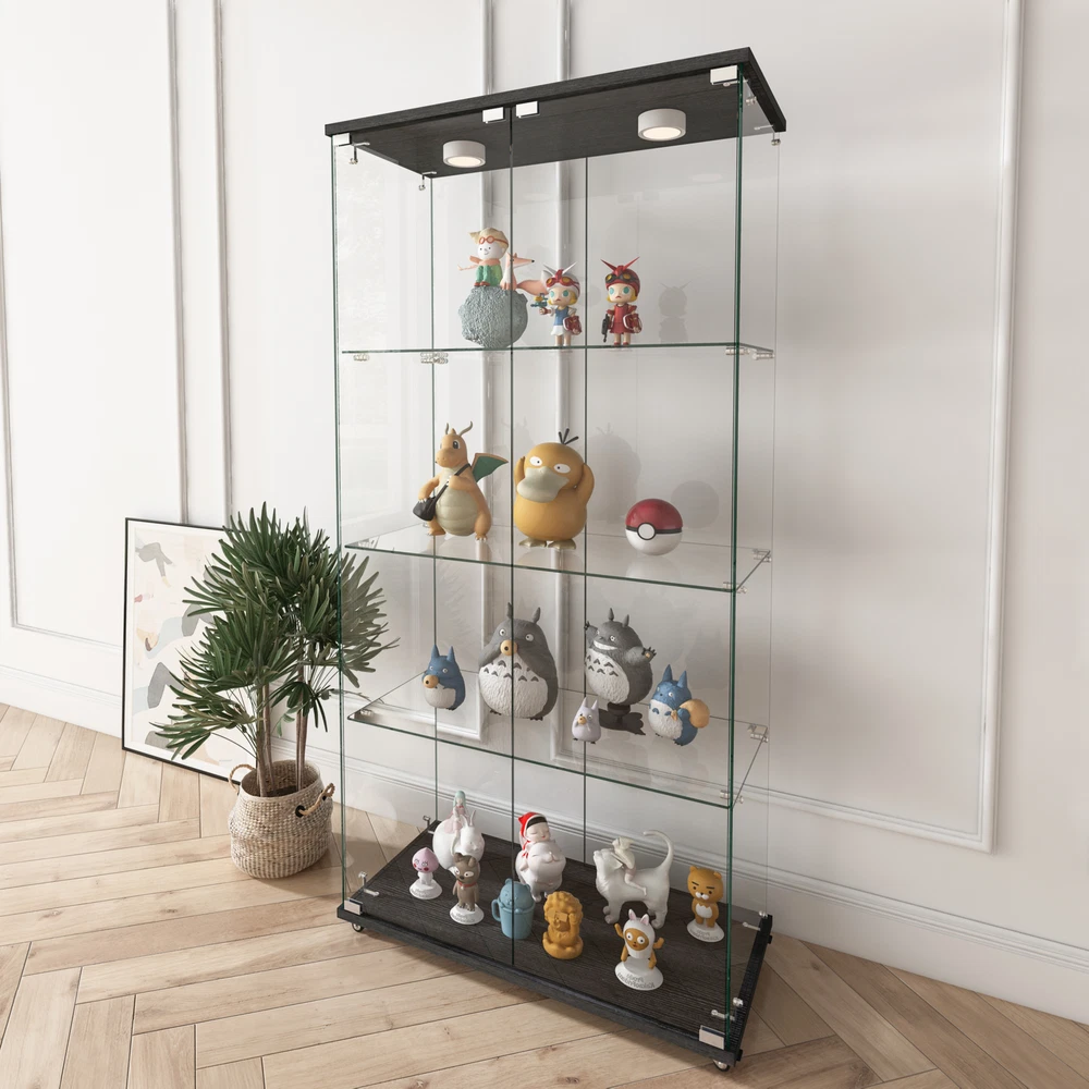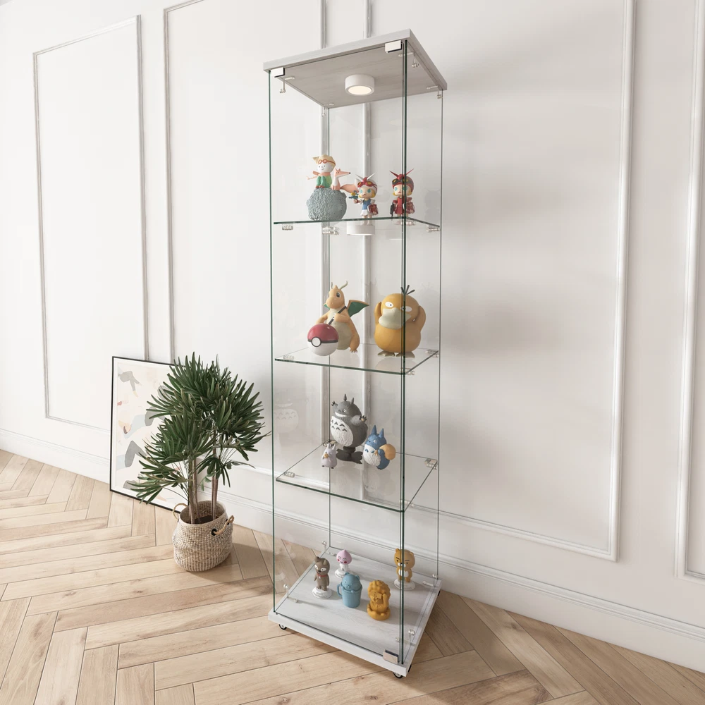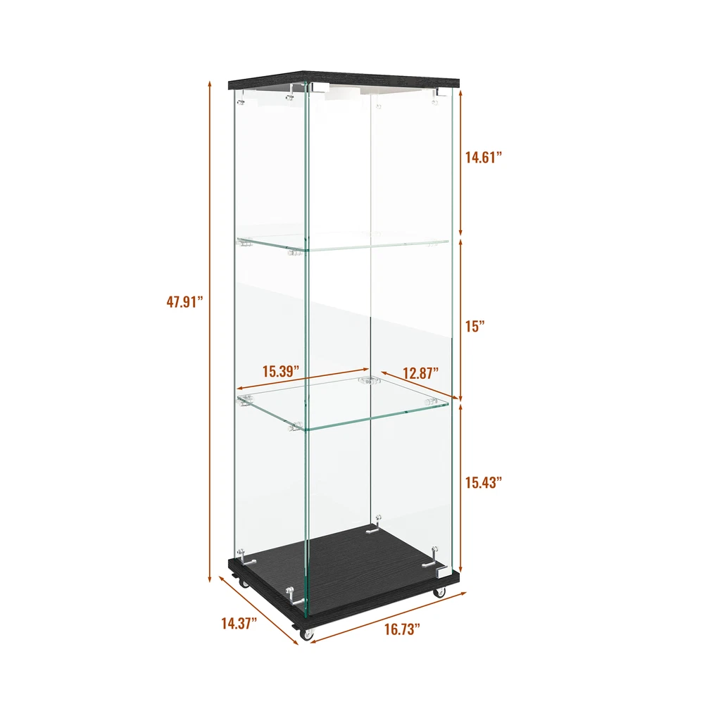 Glass Display Cabinet with LED Lights Modern Collectibles Toy Organizers Rack Features 1.Glass Display Cabinet: Size 64.25"(H) x 32.09"(L) x 14.37"(W) inches, each tempered glass is 5mm thick. The 4-layer shelf is designed to be sturdy and stylish. The glass doors are easy to open and close. It is equipped with 4 caster wheels with brakes. 2.load-bearing: Each layer of the glass shelf can bear a maximum weight of 45 pounds. 3.Enhanced Protection: Made of tough tempered glass and MDF top and bottom panels. There are fixed accessories to connect the side glass and the glass shelves, which can ensure maximum stability. It is durable and practical, suitable for daily use. 4.Store all kinds of items in this glass cabinet. The glass doors help to keep out dust and protect your collections well. 5.It is highly suitable for displaying models, photos, medals, action figures, wine bottles, toys, works of art and ornaments. The transparent glass is an ideal choice for showcasing personal collections and items of commemorative significance. 6.Customizable Lighting: This display cabinet is equipped with 2 colorful lights and a remote control with adjustable colors, allowing you to create the perfect atmosphere for any occasion. There are 12 adjustable colors to choose from, and you can freely adjust the brightness to easily set the atmosphere that suits your preferences or the theme of the event. 7.Easy to clean: The glass material is easy to clean, which can save you a lot of time. 8.Aesthetic Appeal: With its simple design that is both Stylish and Attractive, it seamlessly blends into various modern home environments, suitable for homes, bedrooms, living rooms, offices, shopping centers, and more. 9.Quick Installation: This glass display cabinet is designed for convenience and can be easily assembled through a quick installation process. Just peel off the double-sided tape and stick the light strips on the top of the cabinet. There is no need for complicated wiring or tools, making the installation effortless and worry-free.