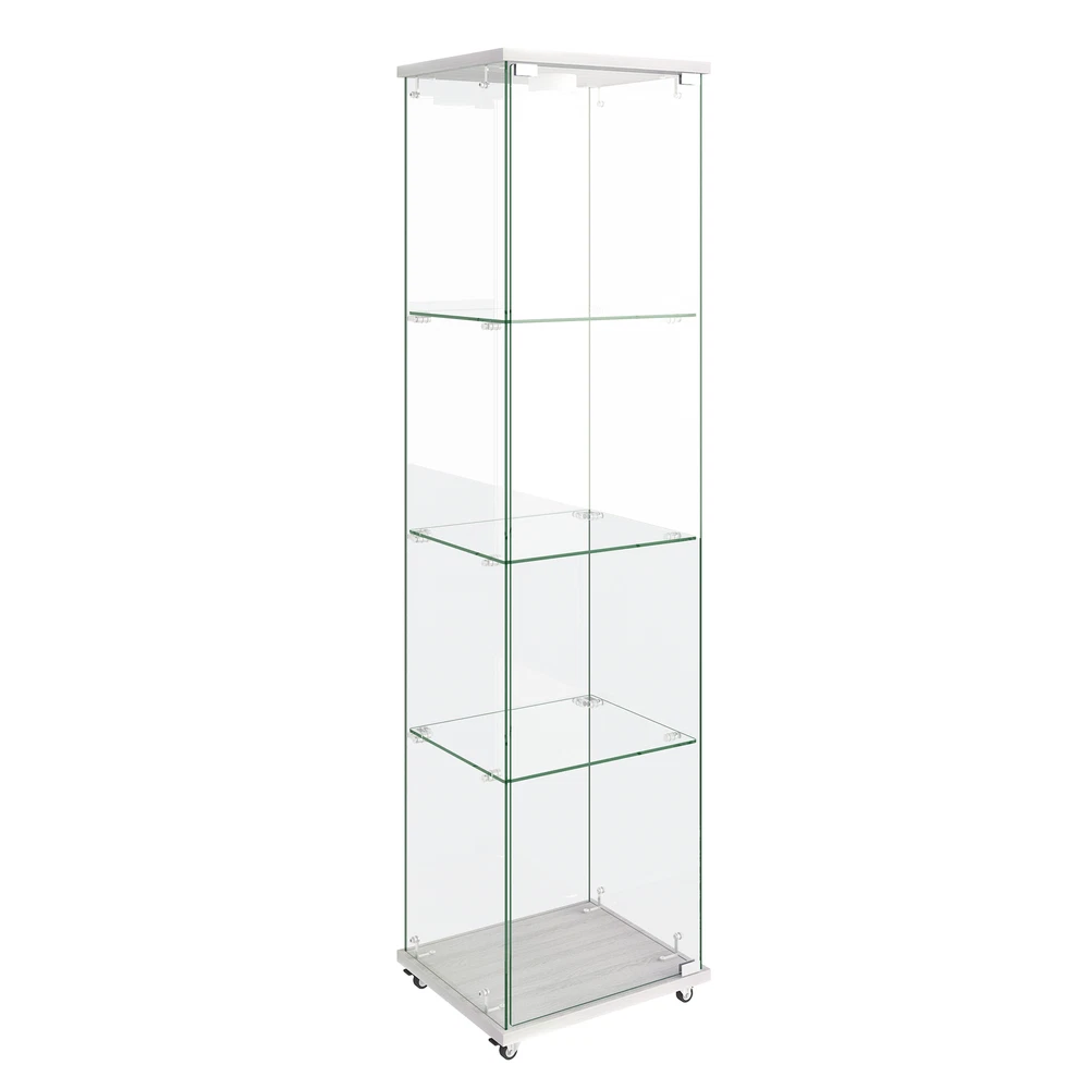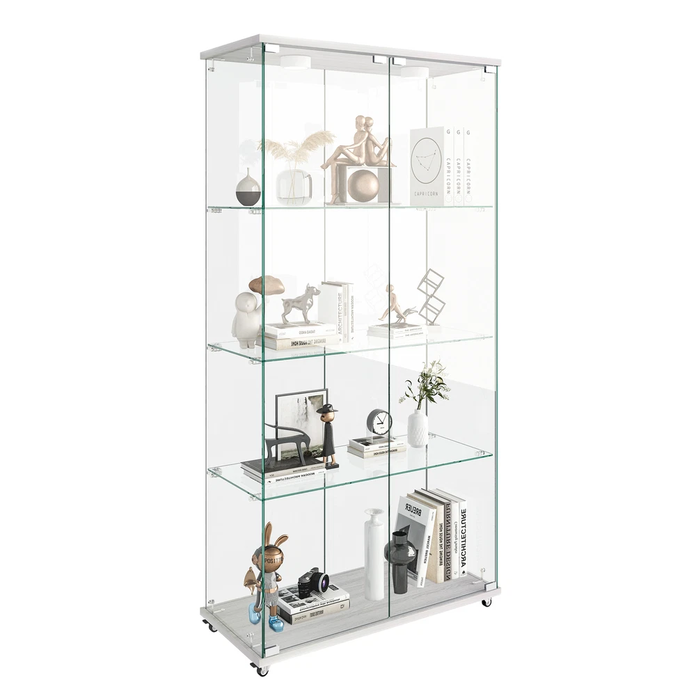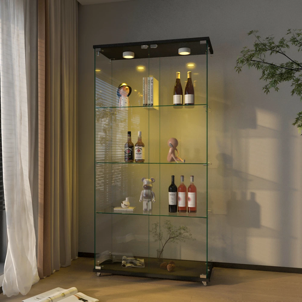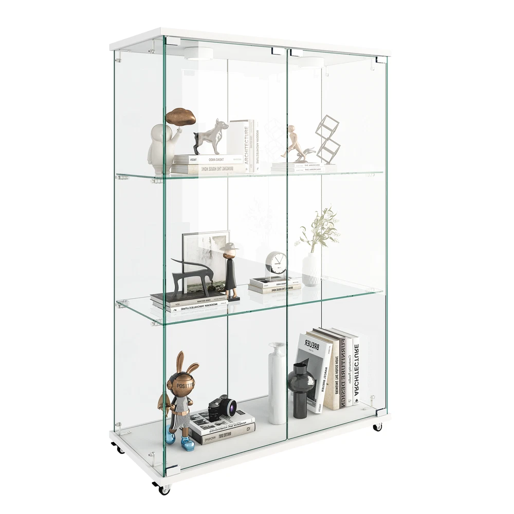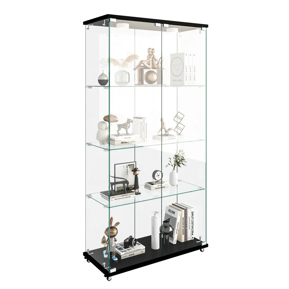 Glass Display Cabinet with LED Lights Modern Collectibles Toy Organizers Rack Features 1.Glass Display Cabinet: Size 64.25"(H) x 32.09"(L) x 14.37"(W) inches, each tempered glass is 5mm thick. The 4-layer shelf is designed to be sturdy and stylish. The glass doors are easy to open and close. It is equipped with 4 caster wheels with brakes. 2.load-bearing: Each layer of the glass shelf can bear a maximum weight of 45 pounds. 3.Enhanced Protection: Made of tough tempered glass and MDF top and bottom panels. There are fixed accessories to connect the side glass and the glass shelves, which can ensure maximum stability. It is durable and practical, suitable for daily use. 4.Store all kinds of items in this glass cabinet. The glass doors help to keep out dust and protect your collections well. 5.It is highly suitable for displaying models, photos, medals, action figures, wine bottles, toys, works of art and ornaments. The transparent glass is an ideal choice for showcasing personal collections and items of commemorative significance. 6.Customizable Lighting: This display cabinet is equipped with 2 colorful lights and a remote control with adjustable colors, allowing you to create the perfect atmosphere for any occasion. There are 12 adjustable colors to choose from, and you can freely adjust the brightness to easily set the atmosphere that suits your preferences or the theme of the event. 7.Easy to clean: The glass material is easy to clean, which can save you a lot of time. 8.Aesthetic Appeal: With its simple design that is both Stylish and Attractive, it seamlessly blends into various modern home environments, suitable for homes, bedrooms, living rooms, offices, shopping centers, and more. 9.Quick Installation: This glass display cabinet is designed for convenience and can be easily assembled through a quick installation process. Just peel off the double-sided tape and stick the light strips on the top of the cabinet. There is no need for complicated wiring or tools, making the installation effortless and worry-free.
