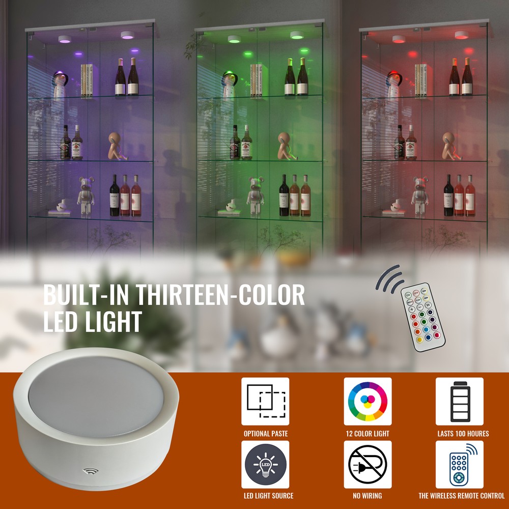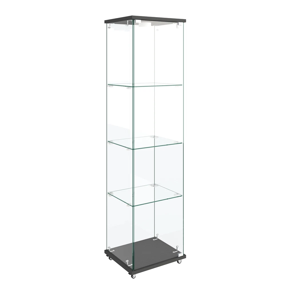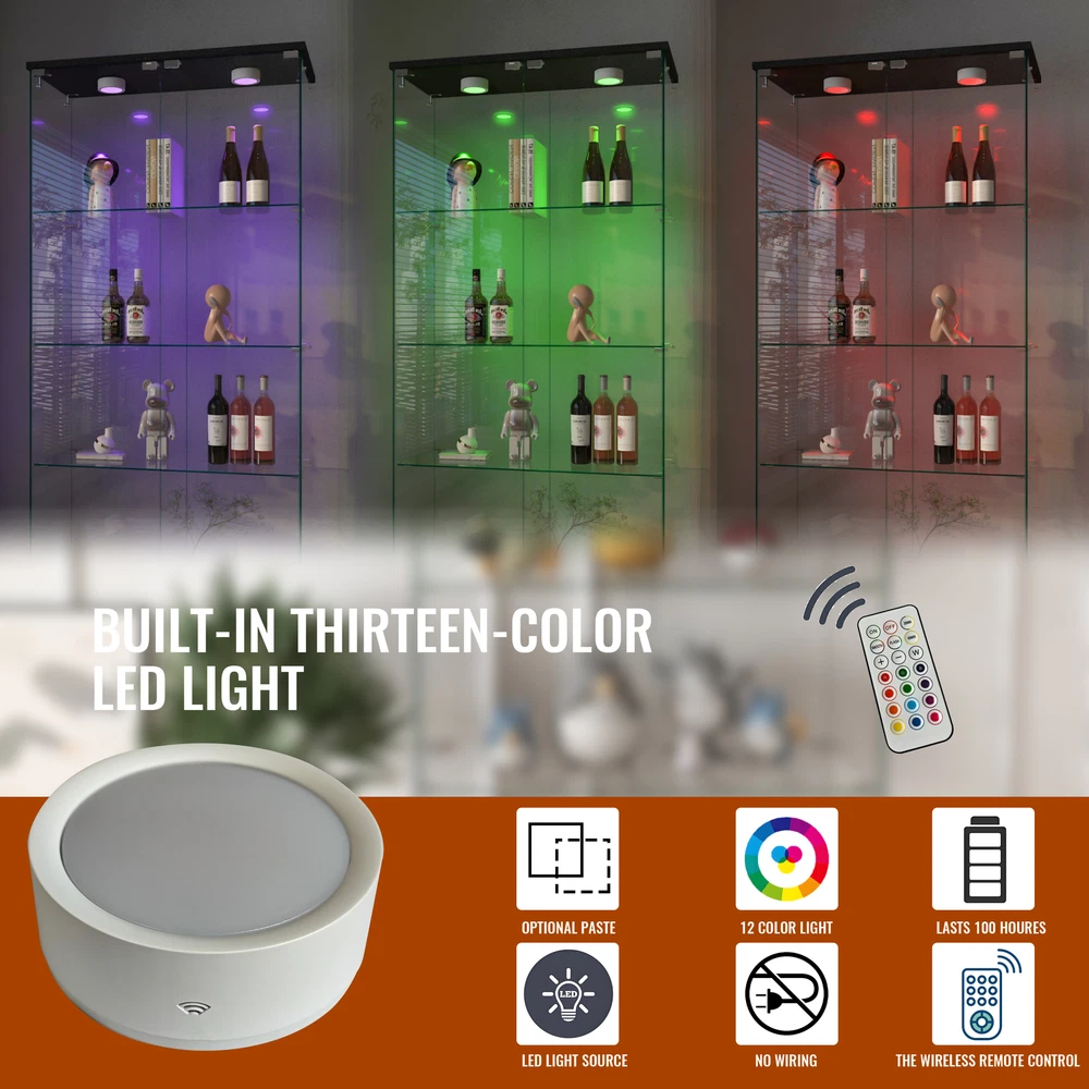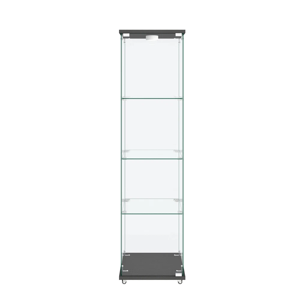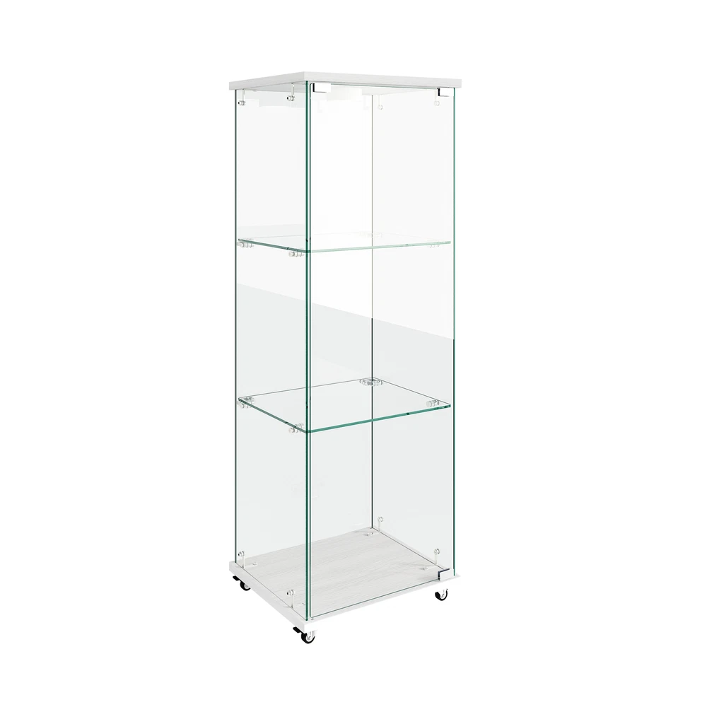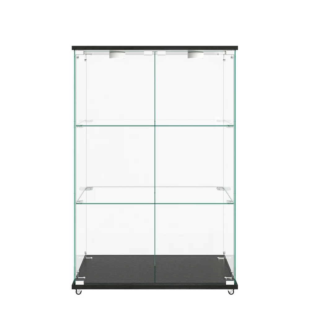Glass Display Cabinet with LED Lights Modern Collectibles Toy Organizers Rack Features 1.Glass Display Cabinet: Size 64.25"(H) x 32.09"(L) x 14.37"(W) inches, each tempered glass is 5mm thick. The 4-layer shelf is designed to be sturdy and stylish. The glass doors are easy to open and close. It is equipped with 4 caster wheels with brakes. 2.load-bearing: Each layer of the glass shelf can bear a maximum weight of 45 pounds. 3.Enhanced Protection: Made of tough tempered glass and MDF top and bottom panels. There are fixed accessories to connect the side glass and the glass shelves, which can ensure maximum stability. It is durable and practical, suitable for daily use. 4.Store all kinds of items in this glass cabinet. The glass doors help to keep out dust and protect your collections well. 5.It is highly suitable for displaying models, photos, medals, action figures, wine bottles, toys, works of art and ornaments. The transparent glass is an ideal choice for showcasing personal collections and items of commemorative significance. 6.Customizable Lighting: This display cabinet is equipped with 2 colorful lights and a remote control with adjustable colors, allowing you to create the perfect atmosphere for any occasion. There are 12 adjustable colors to choose from, and you can freely adjust the brightness to easily set the atmosphere that suits your preferences or the theme of the event. 7.Easy to clean: The glass material is easy to clean, which can save you a lot of time. 8.Aesthetic Appeal: With its simple design that is both Stylish and Attractive, it seamlessly blends into various modern home environments, suitable for homes, bedrooms, living rooms, offices, shopping centers, and more. 9.Quick Installation: This glass display cabinet is designed for convenience and can be easily assembled through a quick installation process. Just peel off the double-sided tape and stick the light strips on the top of the cabinet. There is no need for complicated wiring or tools, making the installation effortless and worry-free.