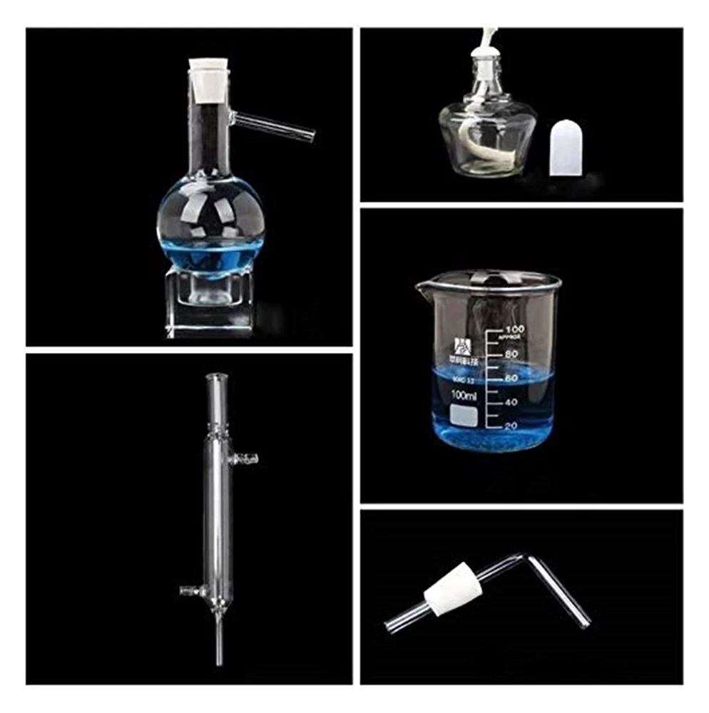 13pcs Glass Distillation Apparatus, Vacuum Distillation Equipment, Chemistry Lab Glassware Kit Glassware Kit Glass Distillation Industrial Science Distiller Pure Dew Purification Making Essential Oils Distilled Water Filter  Product Name: Distiller.  Product List:  Miniature iron stand *1 Distillation flask *1 Straight condensing tube *1 Alcohol lamp *1 Glass beaker *1 Essential oil bottle *1 dropper *1 Flask brush *1 Latex tube *1 Waterstop clip *1 Perforated rubber plug *2 Cotton wick *10 Plastic funnel *1  Note: For the safety of logistics and transportation, the product list does not include , please purchase it yourself. Large Capacity Essential Oil Distillation Kit: Featuring a large capacity flask, our distillation apparatus facilitates batch production of essential oils, increasing extraction rates and yielding purer materials than conventional methods. 3.3 Borosilicate Glass: Upgraded to 3.3 borosilicate glass, our lab glassware withstands high temperatures and corrosive reagents. The low linear expansion coefficient of the glass effectively prevents product breakage due to high temperatures. Laboratory distillation set can be used for small flasks to refine essential oils distilled water purification straight condenser.It is the perfect set for organic chemistry experiments, distillation, fractionation, separation, purification and synthesis. Professional Accessories: Equipped with accessories such as conical flasks, beakers, brushes, etc., facilitating users in collecting and processing experimental products, and providing comprehensive support. This excellent distillation and purification equipment empowers the DIY essential oil you like. Standard & Frosted Joints: Joints are all standard size; it is easy to install and replace. All joints are frosted for high air-sealed and no air leakage, ensuring distillation purity. The high distillation rate saves you money.