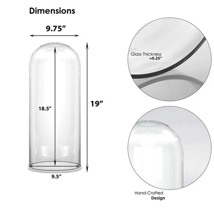 Dimensions - Outer Dimensions- H:19" D:9.75" | Inner Dimension(Inside The glass)- H:18.5" D:9.5" | Glass Thickness ≈ 0.25" Package Quantity Options - Pack of 2 pcs Quality - Hand-blown crystal clear glass not machine made. Hand Crafted with thick walled glass for the perfect Dome Cloche. (Minor imperfections may exist due the product being handmade) Dimension Deviation ≈ 0.1"-0.25" Uses - Due to its unique design, the dome cloche serves as the perfect display showcase. It serves to not only display but to protect from the dust and other factors from your treasured item that lies within. Occasions - Domes give a powerful display presence. It attracts attention due to the unique characteristics of the item. They make perfect centerpieces as well on any event or home decoration. One may incorporate this cloche with a tree bark disc as the tray for rustic chic or farmhouse wedding themes. More and more wedding centerpieces are seen using cloche covers as part of the table setting decor. This clear glass cloche is the perfect pick to pair with different types of cake stands or trays. Dimension: Total Height: 18.5" | Interior Height: 18" | Diameter: 10" Color: Clear Packing: Pack of 2 pcs Material: Glass Style: Classic Glass cloches are also known as glass domes, which were originally created to protect seedlings or delicate flowers from adverse elements. They have since been widely used as plant terrarium containers or as decadent dessert display covers. The tray is not included. - Wide surface area for etching or engraving - Total height is measured from the top of the lid to the base - Tips: take note of the lid's diameter and height to determine what you can fit inside the cover without touching its sides