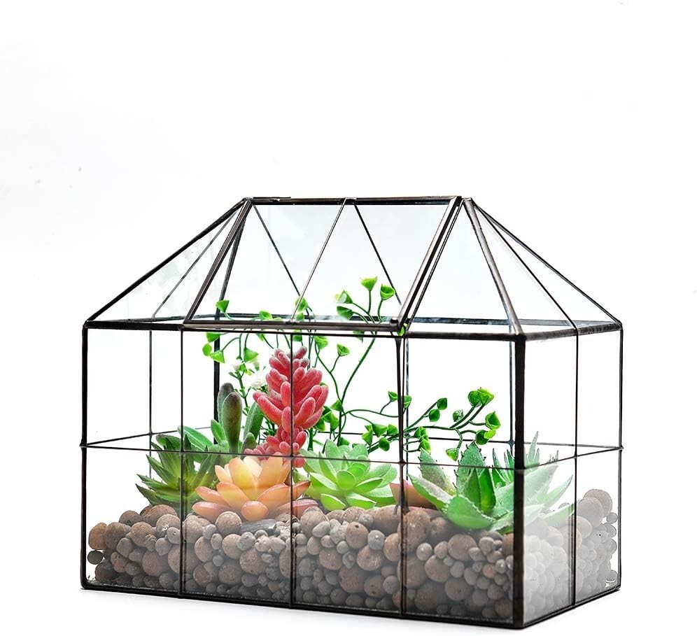 Large House-Shaped Glass Terrarium – Swing Lid, Sturdy Design For Plants & Decor This large glass terrarium is a house shape plant terrarium with swing lid, have beautiful black accent and ventilation. Glass greenhouse terrarium great for raising succulent, moss, fern, cacti, venus fly trap. Large plant terrarium motivate your imagination to create a dreamy world at home. Made of reinforced glass, super sturdy, clear glass terrarium tabletop planter Size: 9.8""X7.9""X5.9"" inches, great decor for office desk, window, balcony. as a housewarming gift Product Description Exquisite Glass Plant Terrarium create a fashion life atmosphere, make your life more poetic and relaxing. This Exquisite Sealed house shape glass terrariumis just like a piece of art with its modern style and sleek design, The craftsmen carefully welded the brass frame of this tiny glass greenhouse by hand, and put the full transparent glass into the frame, forming a exquisite handicraft glass terrarium. Different from other glass terrarium, the glass panels of this house terrarium are sealed, It can almost water proof, great for growing succulent, orchid, moss, fern, cacti, venus fly trap. Made of framed transparent glass with copper frame, super sturdy, create a separate environment inside for your lovely plants and keep your plant and pets get along very well together at home. Great Housewarming Gift Glass terrarium is a decent way to raise plants and watch them, without dirting your room. Plant terrarium with Modern design greatly adding visual interest and artistic value to any space. It is also ideal for holding wedding card or gift card. Great housewarming gift for your family and friends. Perfect centre display box for weddings, holidays, parties, offices, and home decor. Beautiful plant terrarium with swing lip on the top This large glass terrarium is a house shape plant terrarium with swing lid, have beautiful black accent and ventilation, easy to keep plant in/out. Best choose as a new home for your snail and other small pets. Glass terrarium is a decent way to raise plants and watch them, without dirtying your room. A perfect addition to home or garden, create a great focal point and decorative piece. Large plant terrarium motivate your imagination to create a dreamy world at home. Perfect unique design make this Glass Terrarium nice for eye-catching, with your small potted plants Creates a Relaxing and Poetic Environment. Made of reinforced glass, super sturdy. Modern style and classic elegance.