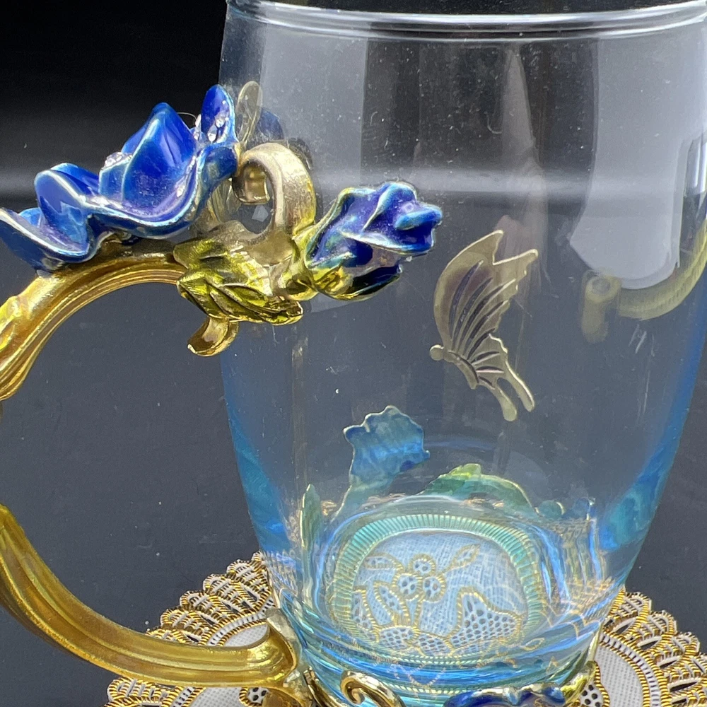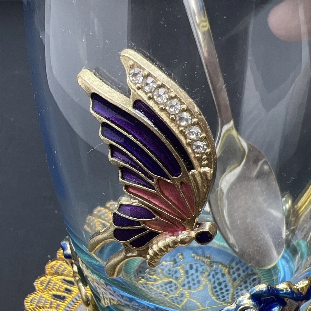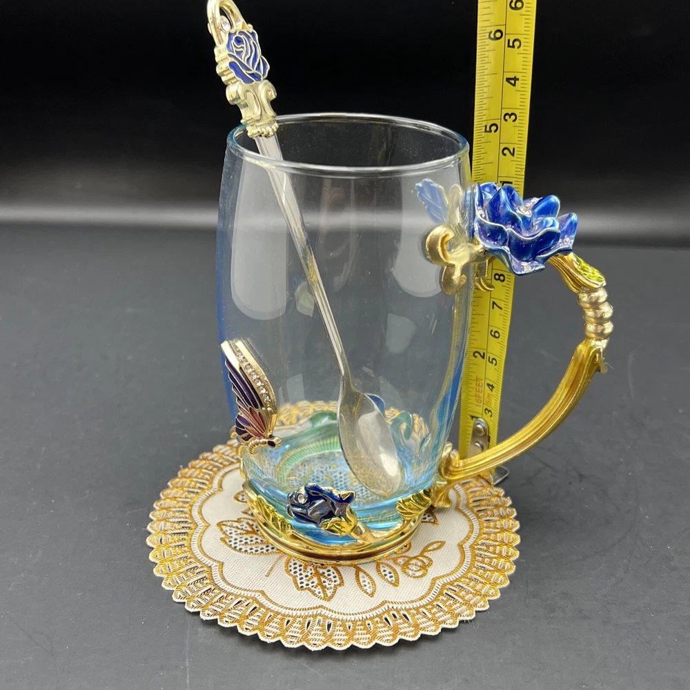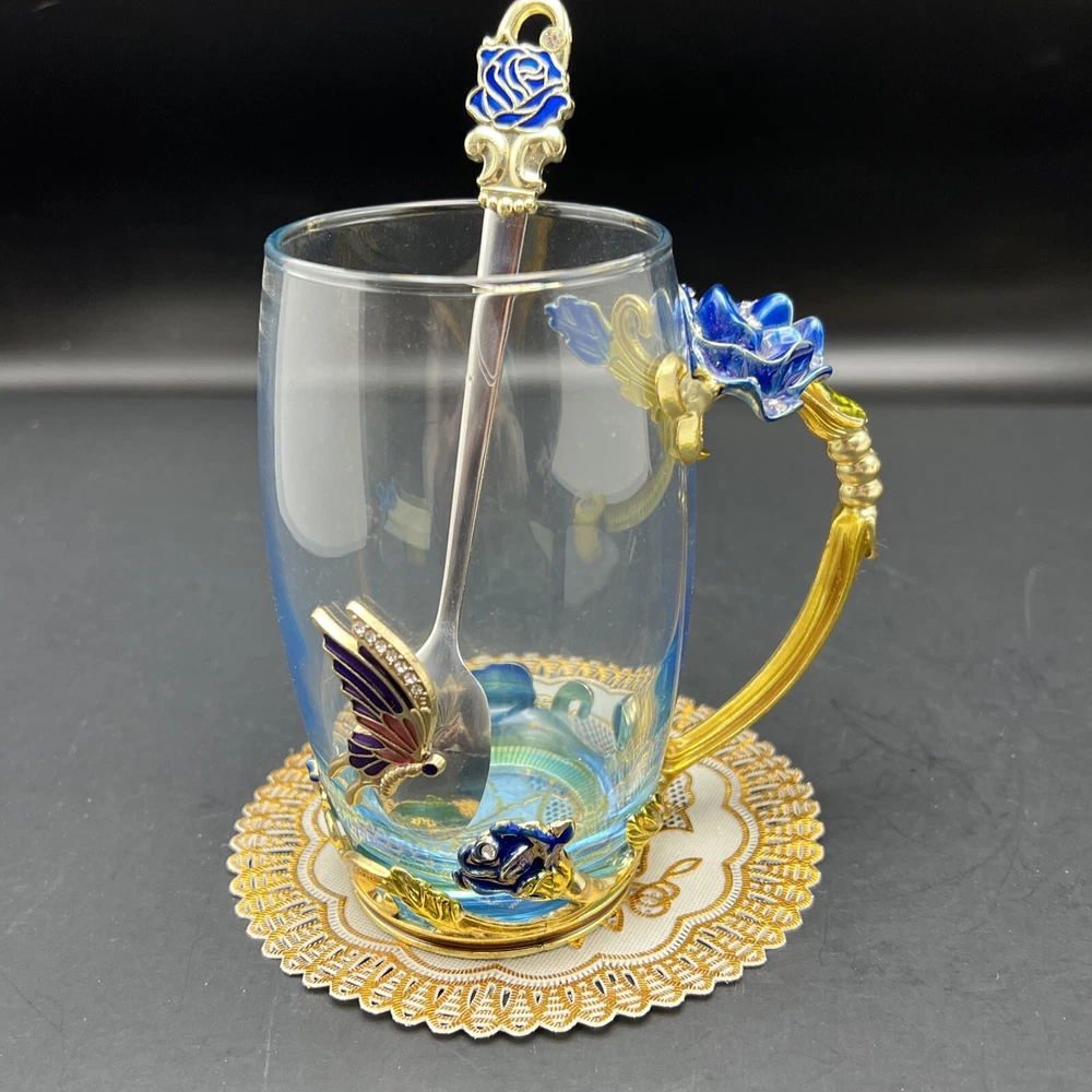 Elevate your tea-drinking experience with this stunning Glass Jeweled Enamel Tea Cup & Spoon Set. Handmade with intricate attention to detail, this set features a beautiful rose, flower, and butterfly design that will add a touch of elegance to any occasion. Crafted from high-quality glass and enamel, this set includes a tea glass with sparkling jewels and a decorated spoon . Perfect for all occasions, this set is not only functional but also a work of art. The butterfly theme make it a unique addition to your collection. Impress your guests or simply enjoy a cup of tea in style with this must-have set. I will pack with care and get it to you ASAP Thanks for looking !