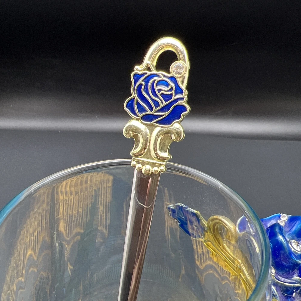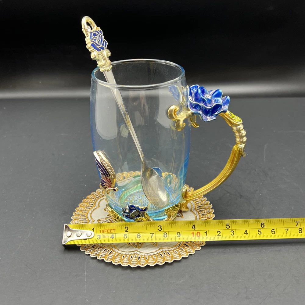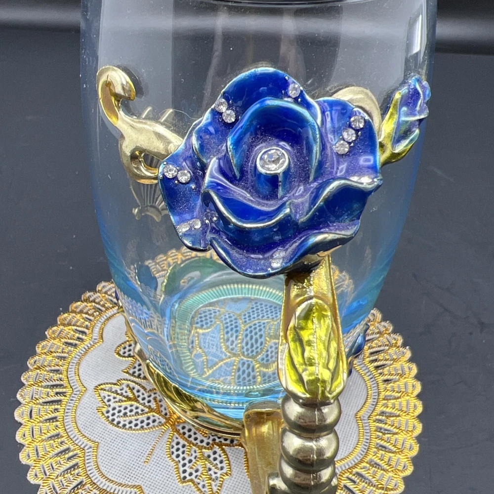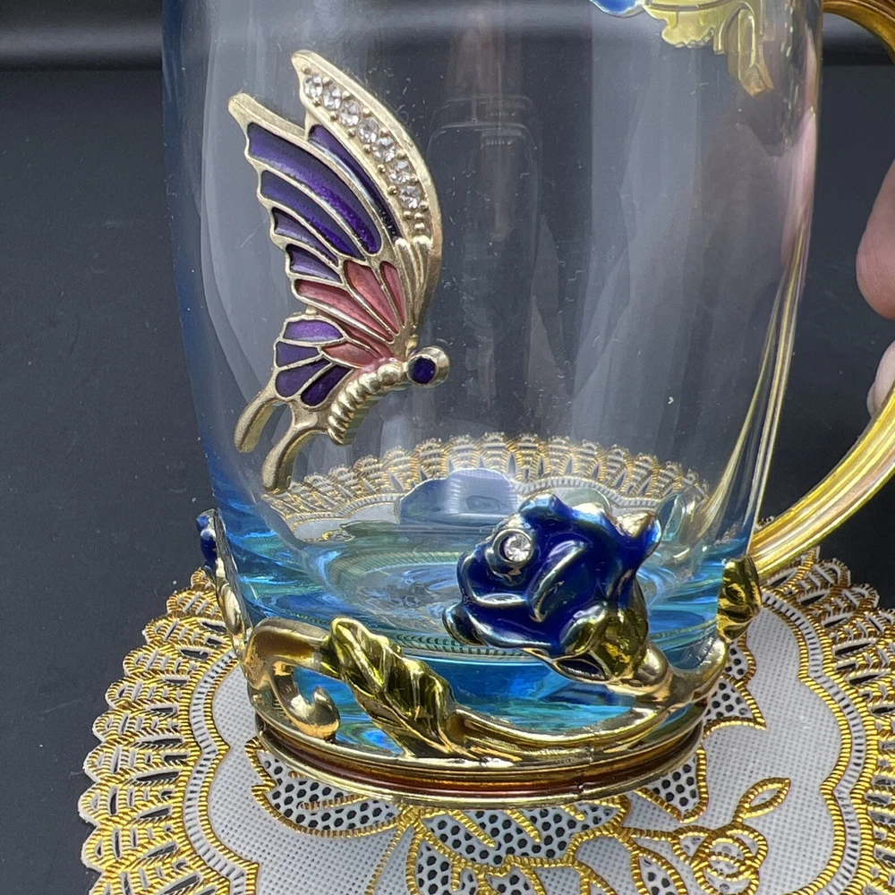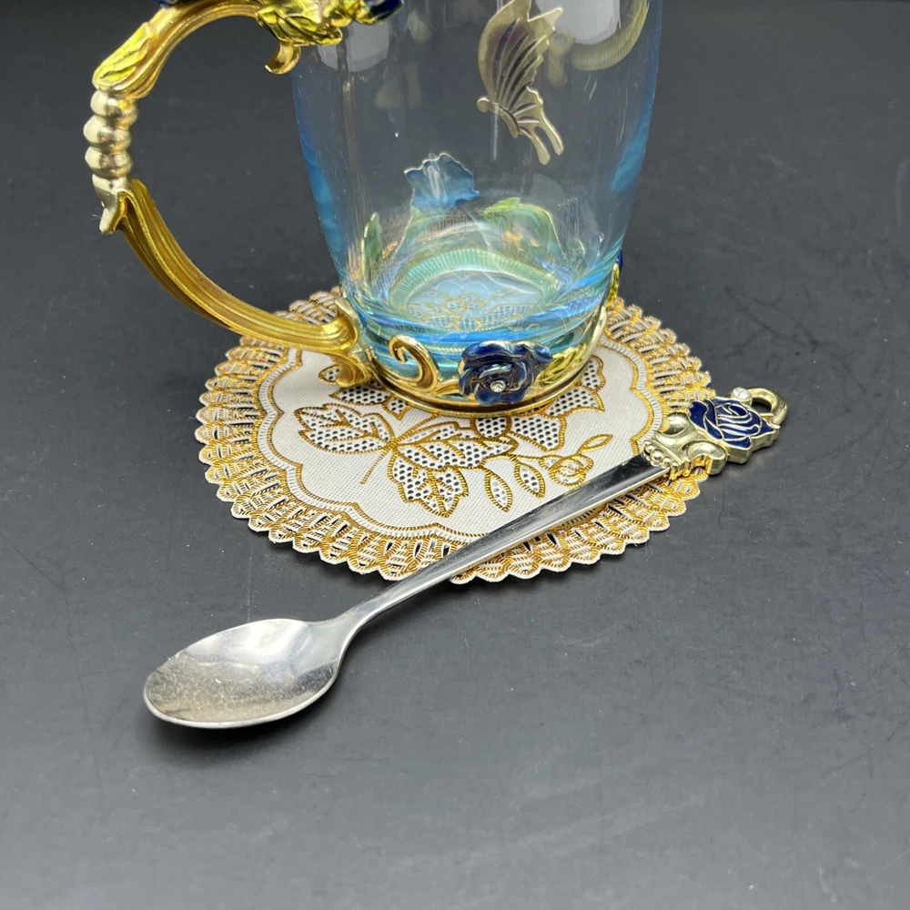 Elevate your tea-drinking experience with this stunning Glass Jeweled Enamel Tea Cup & Spoon Set. Handmade with intricate attention to detail, this set features a beautiful rose, flower, and butterfly design that will add a touch of elegance to any occasion. Crafted from high-quality glass and enamel, this set includes a tea glass with sparkling jewels and a decorated spoon . Perfect for all occasions, this set is not only functional but also a work of art. The butterfly theme make it a unique addition to your collection. Impress your guests or simply enjoy a cup of tea in style with this must-have set. I will pack with care and get it to you ASAP Thanks for looking !