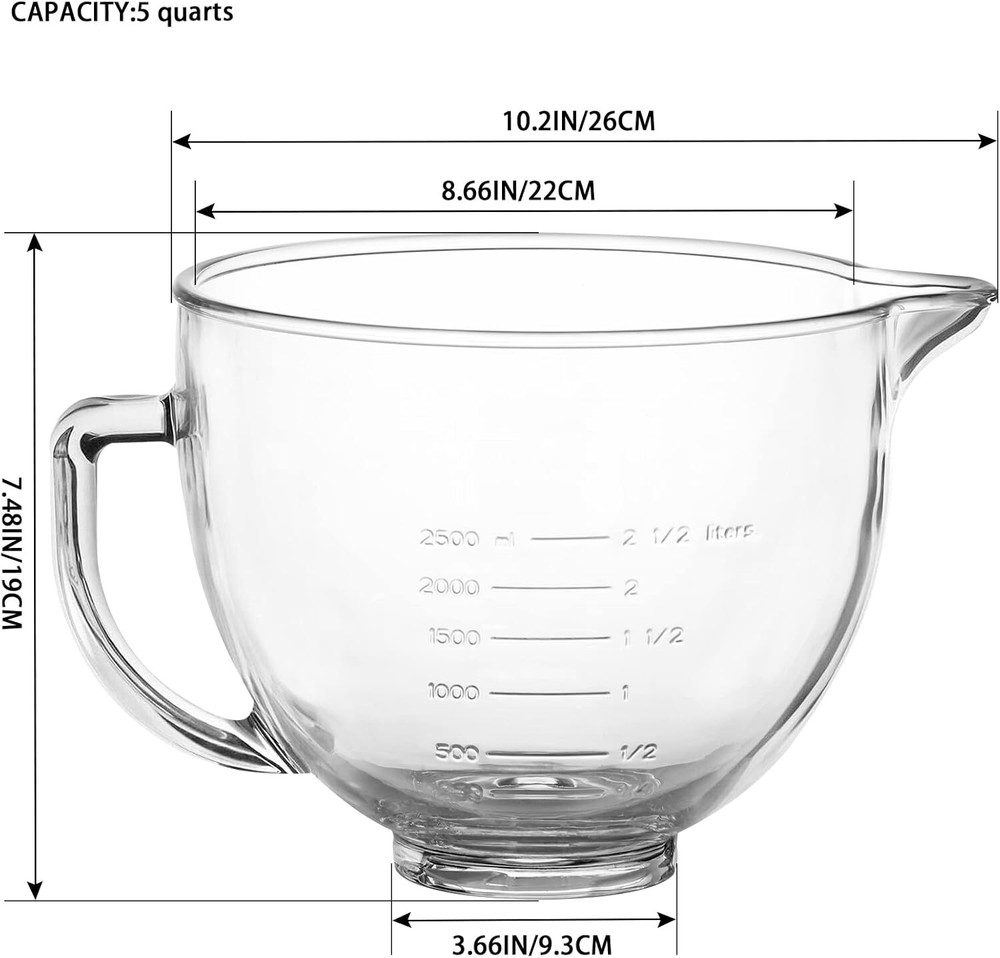 Water Cooler Dispenser Base Pedestal Height Extender Bottom Loading/Bottleless 72.38 USD 76.19 USD Free shipping 5% off 4 Wheel Rollator Walker Seat Steel Rolling Walker Height Adjustable 7.5" Wheels 92.16 USD 97.01 USD Free shipping 5% off Rifle Shooting Rest Tripod with V Yoke Bracket V Shaped Gun Rack for Hunting 50.03 USD Free shipping 58.3"Wheel Rotary Edger Rotary Shear Sidewalk Manual Lawn Edger Strong 3 Section 39.24 USD 41.31 USD Free shipping 5% off 16 inch 3 Speed Oscillating Wall Mount Fan w/Remote Control Timer Auto Shut Off 44.21 USD 46.54 USD Free shipping 5% off 2-Pcs 15x6.00-6 Tire Wheel Assembly Pneumatic Replacement Lawn Mower Front Tires 69.8 USD 73.47 USD Free shipping 5% off Dog Bark Deterrent Device Stops Bad Behavior Long-range Ultrasonic Shock Collar 39.34 USD 41.41 USD Free shipping 5% off Smart Automatic Cat Feeders for 2 Cats 7L Cat Food Dispenser with Double Bowls 47.62 USD 50.13 USD Free shipping 5% off 15PC Glass Food Storage Containers Meal Prep Containers Airtight Glass Bento Box 38.73 USD 40.77 USD Free shipping 5% off 5PC 72 oz 9 Cup Large Glass Airtight Food Storage Containers with Lids Oven Safe 38.3 USD 40.32 USD Free shipping 5% off Compact Corner Tool Rack Holds Up to 25 Tools Easy to Assemble for Home US 41.6 USD 43.79 USD Free shipping 5% off 21V Cordless Angle Grinder Kit with 10000 RPM Brushless Electric Motor NEW US 59.37 USD 62.49 USD Free shipping 5% off Bowl Material Glass Number of Pieces 1 Style Classic Special Feature Sturdy About this item QUALITY MATERIAL: Made of thick glass, easy to clean, dishwasher-, microwave- and refrigerator-safe SIZE: Bottom diameter is 3.66", mouth diameter is 10.2", total height is 7.48", capacity is 5 quart CLEAR MIXING BOWL: Being able to see the bottom of the bowl from the outside, so you can know everything's all mixed well, makes baking more of a joy THOUGHTFUL DESIGN: Embossed measu rement markings on the side of the bowl is easy to read, handle helps grip, and the pouring spout makes it easier to pour the contents, handy for use COMPATIBLE WITH KITCHEN AID TILT-HEAD STAND MIXER: Compatible with Artisan KSM75, KSM90, KSM95, KSM100, KSM103, KSM110, KSM150, 5KSM125, 5KSM150, 5KSM175, 5KSM7580, RRK150, K45, K45SS and more models You may also like 1 Gal Water Based Oil-Modified Polyurethane Gloss Clear Protective Poly Coating 65.0 USD Free shipping 1HP 3434 GPH Sump Pump Submersible Clean/Dirty Water Pump Portable Utility Pump 47.29 USD Free shipping Cast Iron Griddle Press w/Handle Bacon Press Grill Press Burger Press Meat Press 24.17 USD Free shipping 3 Drawer Chest Wood Bedroom Furniture Storage of Drawers for Small Space Home 88.4 USD Free shipping Portable Air Conditioner 5-In-1 AC Evaporative Air Cooler Air Cooling Fan Black 41.78 USD Free shipping Werewolf Animatronic with Lights and Scary Sound Scarecrow Outdoor Prop NEW US 105.65 USD Free shipping Waterproofing Spra+Stain Repellent UV Protection for Boat Covers Car Covers US 57.65 USD Free shipping 0.68-In Horizontal Mattress Support Wooden Bunkie Board/Bed Slats Twin Size 39" 42.75 USD Free shipping Heavy Duty 50lb Push Broadcast Spreader w/8-in Poly Wheels Garden Seed Spreading 67.96 USD Free shipping 26" Whirlwind Women's Mountain Bike Lightweight Aluminum 21-speed Bicycle Gray 153.4 USD Free shipping Porch & Floor 1 gal. Light Gray Satin Interior / Exterior Paint with Primer 39.57 USD Free shipping Select Perforated Kitchen Roll Towels 2-Ply 8"x11" White 70/Roll 30 Rolls/Carton 42.15 USD Free shipping