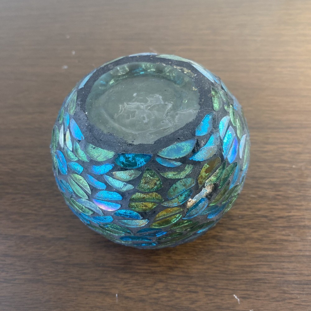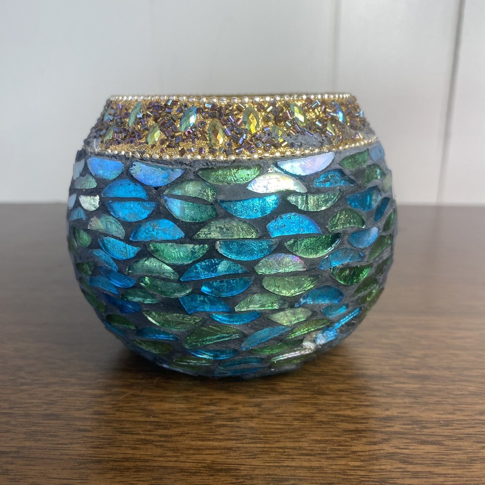 Green, blue and gold glass mosaic candle holder bowl. Dimensions: 4” W x 3” H, top hole opening 2.75” W.