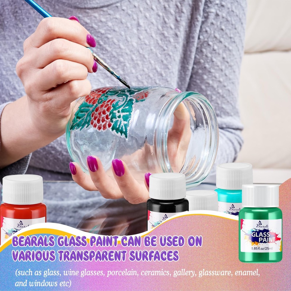 Bearals Glass Paint Included: --18 Vibrant colors glass paint(Bottle of 0.85oz/25ml) Great for a variety of surfaces. Include: glass, wine glasses, windows, light bulbs, ceramics Premium Quality: We use better ingredients to make this glass paint. The creamy consistency and high pigment make your paintings more silk and the stained glass paint glides on smoothly, dry quickly and keep your artwork vivid. Safe & Non Toxic: Conforms to ASTM D-4236 and EN71, our stained glass paint is non-toxic and completely safe to use. 18 Vibrant Colors: Our glass paint comes with 18 bright glass colors in 25ml / 0.85fl.oz bottles, offering vivid color options to your artwork. And this glass paint set can better meet your needs for glass painting. Wide Application: Bearals glass paint is not only used for glass painting, can also be applied on wine glassed, windows, ceramics and other transparent surfaces. Perfect Gift Choice: This glass paint is suitable for kids, students, adults or for beginners and artists who love glass painting. Packed with an exquisite box, this stained glass paint can be also used as a gift for birthdays, parties, school, and other occasions.