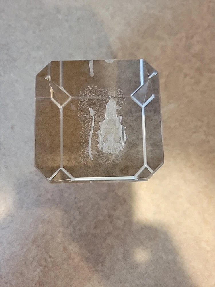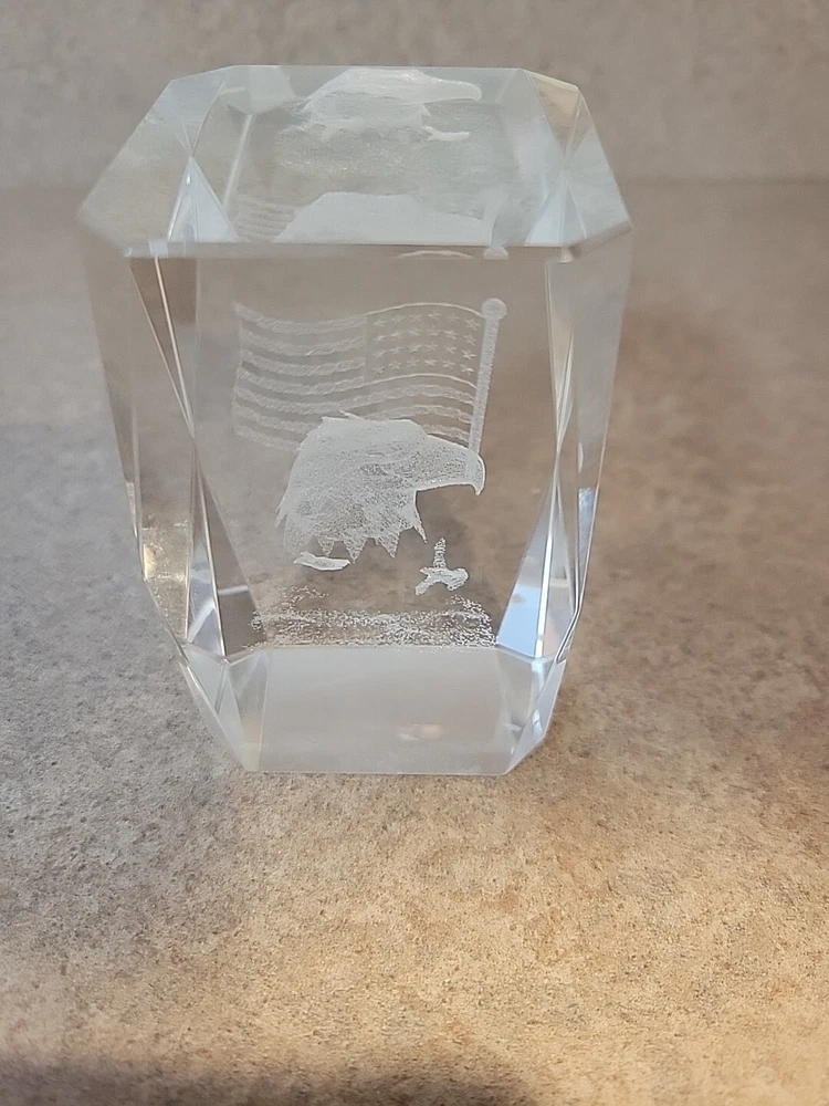 This is a clear glass paperweight with a 3D laser etched eagle and American flag design. It is a patriotic and collectible item that would make a great addition to any desk or display. The unit quantity is one and it is made in China. The brand is Glass and it is not handmade.