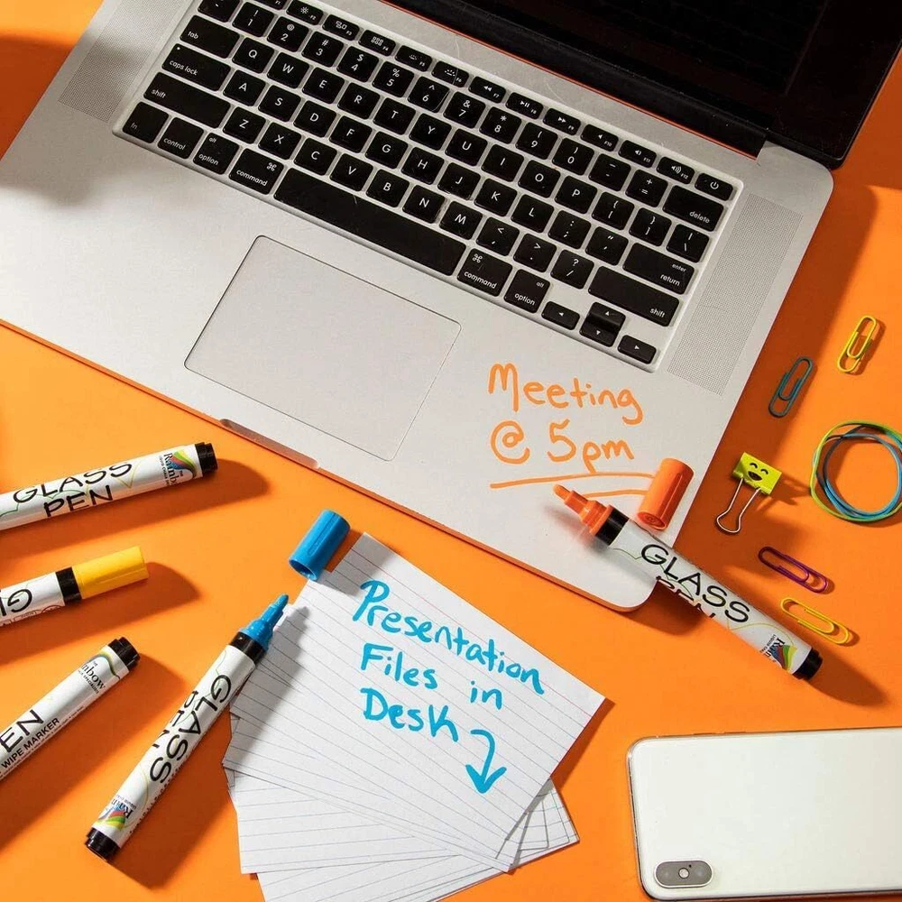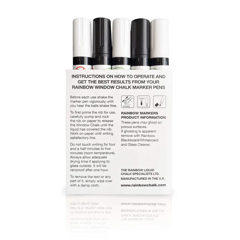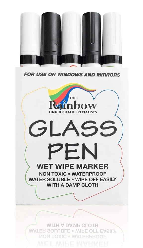 PAINTERS MARKERS When it’s time to brighten up your windows or write messages on mirrors, use the Glass Pen to add a rainbow of eye-catching colors to your stunning designs! These pens feature a reversible nib to be long-lasting and work on a wide variety of surfaces to be suitable for every occasion and any room. Simply pick up a Glass Pen and pump the tip to get the ink flowing so you can draw, color, and decorate to your heart’s content. MULTIPLE SURFACES These pens were specially designed to glide across glass surfaces to create vibrant designs and calligraphy, but did you know they can be used for so much more? Use the Glass Pen to decorate wine glasses at a party, so everyone knows which glass is theirs or hand them to your kids and let them draw on your windows for some fun, structured playtime! You can also use these pens on kitchen, bedroom, and bathroom windows and mirrors, glass signs and doors, whiteboards, and car windows. FOR EVERY OCCASION Bring life to every party and dazzle your guests with beautiful swirling designs and messages created using the Glass Pen. Use them to decorate signs for bridal parties, weddings and anniversaries, write happy birthday or graduation messages on car windows, draw mandalas on bathroom windows, or paint snowmen, ornaments, and mistletoe on windows during the holidays. RICH PIGMENTS Available with a 5mm Narrow or 15mm Wide Jumbo nib, the Glass Pen can create flowing lines or bold paint strokes. Choose from one of our 10 popular colors: white, black, red, orange, yellow, green, blue, pink, violet, and brown. ADVANCED FORMULA The ink used is carefully created using a water-based formula that is resistant to light mist and rain while being easily washable with a damp cloth. Non-toxic and safe to use in enclosed spaces and near children, the Glass Pen is environmentally friendly and allows you to decorate every inch of glass and window space with fun, playful designs! WINDOW PAINT MARKERS: Write, draw, and decorate any glass surface with a rainbow of long-lasting colors MULTIPLE SURFACES: Arts and craft pens for glasses, mirrors, window panes, marker boards and more (Note: Surfaces must be clean & dry for Glass Pen to write smoothly) FOR EVERY OCCASION: Indoors and outdoor pens for birthdays, graduation, anniversaries, and weddings ADVANCED FORMULA: Non-toxic, water-based ink that is safe to use around children and enclosed places RAIN RESISTANT & WASHABLE - Durable enough to resist light rain showers but still be removable by wiping with a damp cloth. INSTRUCTIONS TO START- Active new pen on a scrap piece of paper. Rapidly press 30+ times to release the liquid inside. (Do Not pump tip while writing, this will cause excess ink to drip or leak.) TIPS COME OUT EASILY- Designed with easily reversible tips for flipping over or replacing, if the tip comes out do not worry, simply put it back in and keep writing. (replacement tips sold separately) CLEAN AND DRY SURFACE - Works best on clean, dry surfaces. For window glass, drinking or wine glasses, apply when the glass is dry & free of condensation for smooth writing and to prevent droplets.