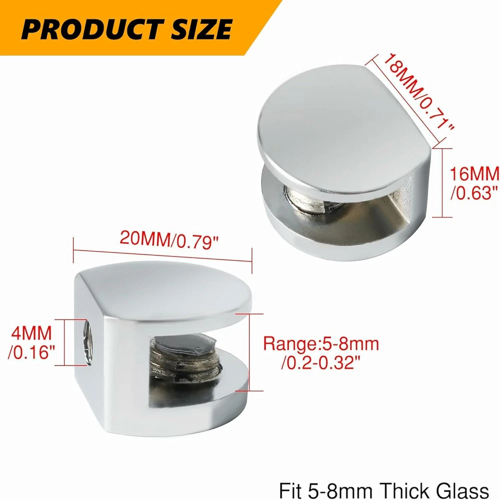 Item Dimensions: 1 x 0.8 x 0.64 inches Finish Type: Polished Chrome Model Number: BL3008-4P Size: Fit 5-8mm Thick Glass gtin13: 705354014924 Color: Polished Chrome Number of Shelves: Does not apply Item Depth: 1 inches Style: Polished Chrome Item Length: Does not apply Item dimensions L x W x H: 1 x 0.8 x 0.64 inches Item Width: Does not apply UPC: 705354014924 Brand: Does not apply Mounting Type: Wall Mount Material Type: Metal Type: Does not apply Material: Metal Item Height: Does not apply Finish Types: Polished Chrome
