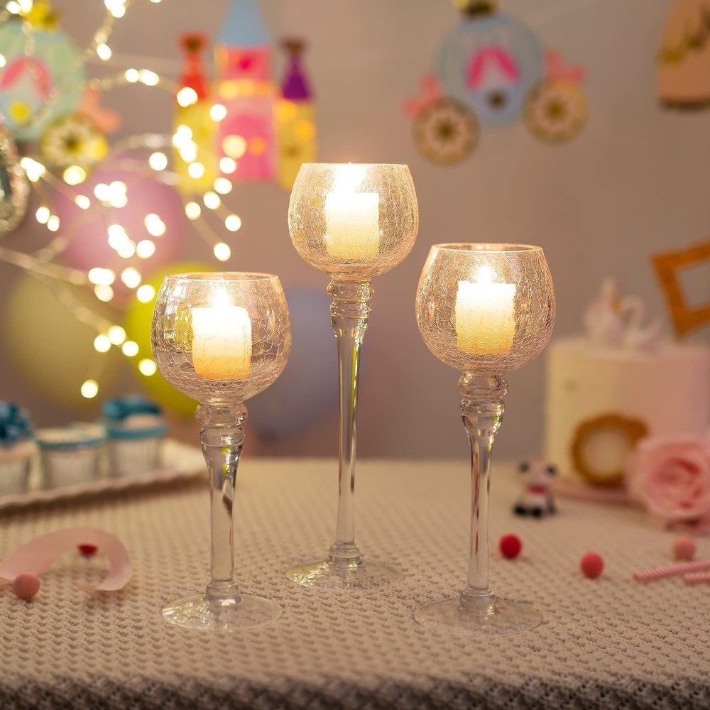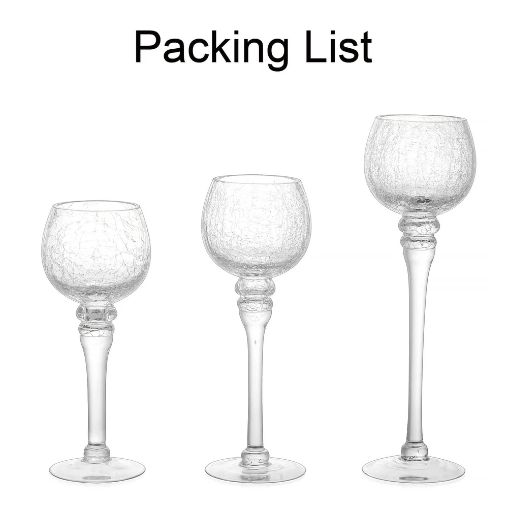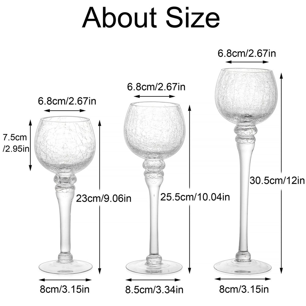 Glass Tealight Candle Holder: Clear Votive Holders 9/10/12 Inch Tall Long Setm Floating Candle Holders for Christmas Dining Table Centerpiece Wedding Party Set of 3 Product Details Color: Clear Size: 1 Set (3 Pcs) Brand: Inweder MPN: OYBT102I UPC: Does not apply EAN: Does not apply Color: Clear Material: Glass Brand: Inweder Product Dimensions: 3.15"L x 2.67"W x 10.04"H Finish Type: Polished Color: Clear Material: Glass Brand: Inweder Product Dimensions: 3.15"L x 2.67"W x 10.04"H Finish Type: Polished Item Weight: 3 Pounds Number of Pieces: 3 Theme: Wedding Item Diameter: 10 Inches Mounting Type: Tabletop Manufacturer: Inweder Occasion: Anniversary, Birthday, Event, Home, Wedding And Engagement Item Weight: 3 pounds Item model number: OYBT102I Date First Available: January 11, 2022 Unique Crackle Glass & Gorgeous Looking: Inweder candle holder is made of high High-quality crackle glass, it is thick and heat resistant. Finished with a brilliant speckled mirror-like surface on the outside, they have a beautiful shine and will highlight any decor. And the candle holder for mantle consists of a long stem, elegant and stylish. It will make your wedding, party, home or other events more gorgeous and appealing. Fits Most Candles & Wide Applications: Inweder long stem candle holders fit many different types of candles such as floating candles, cylindrical candles, LED candles or small tea wax, scented or unscented candles. Or you can also put nothing in the candle holder. Ideal for wedding reception, party decor, home, kitchen, and other events. Besides, this candle holder set is also a perfect gift for yourself and a housewarming. Safe and Sturdy Packaging: Inweder long stem tealight candle holder is carefully packaged with sturdy foam wrap and placed in separate compartments to avoid damage during transportation. If you receive a damaged product, please contact us, we will give you a satisfactory solution as soon as possible. Ideal Size: You will get 3 different sizes of clear candle holders, the tall one is 11.8", the medium one is 10" and the small one is 9". You can put these 3 candle holders together and display them in different ways, or split them apart and display them in different rooms. Tips: Because Inweder glass candle holders are handmade, there will have about 4% in size variation. Service for You: Inweder always specialized in designing high-quality and elegant Wedding and Home Decorations. If you are not satisfied with the product or have any questions please contact us and we will reply to all your inquiry with a satisfied solution.
