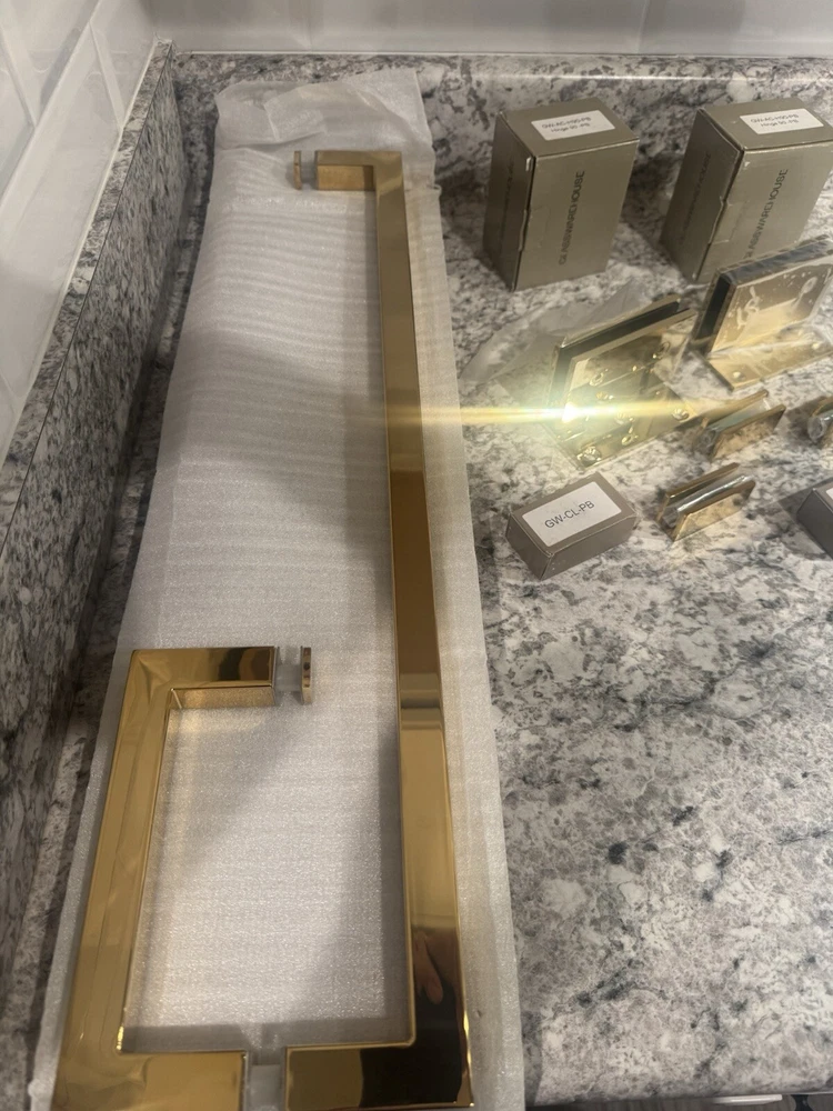 Elevate your bathroom's aesthetic with the Glass Warehouse Shower Door Handle Hardware set. This polished brass collection offers a sleek and sturdy solution for your shower door, featuring a hinged opening mechanism for easy access. The set includes six pieces, ensuring you have all the necessary components for a seamless installation. Designed with both style and functionality in mind, these handles boast a bar type design that provides a secure grip. The durable polished brass frame material and finish adapt beautifully to a variety of bathroom decors, making it a versatile choice for your shower enclosure. Experience the perfect combination of elegance and practicality with this top-quality shower door hardware from Glass Warehouse. *Missing one set of three screws for hinge.