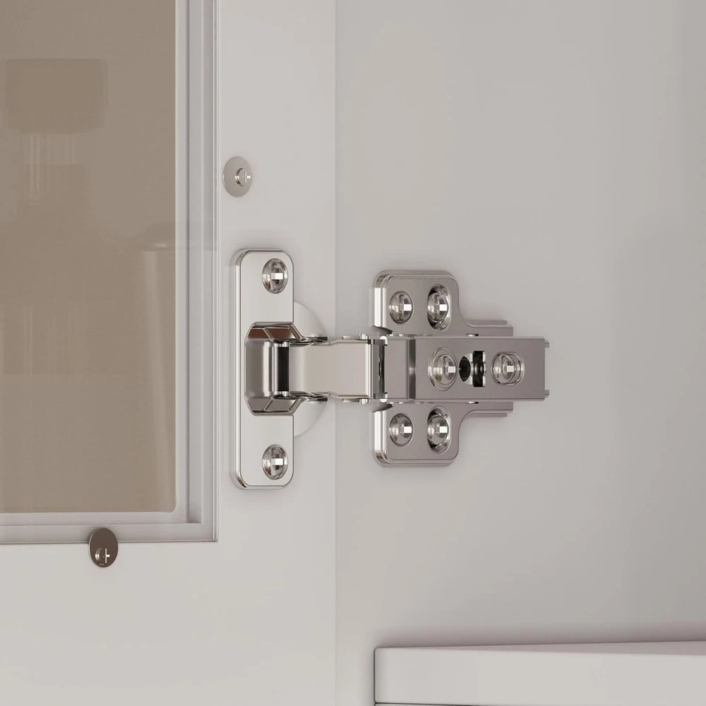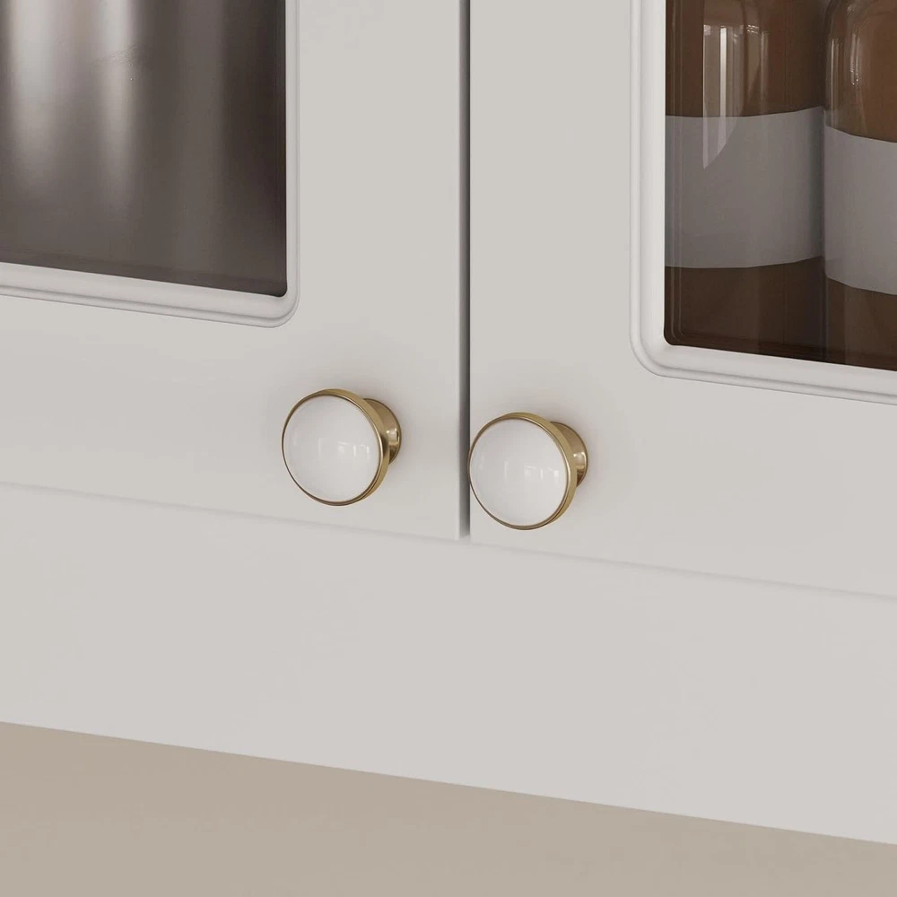 1. This stylish white cabinet with gold accents and glass doors adds elegance to any space. The chic crossed-line pattern gives it a classic look while the adjustable shelves offer versatile storage. Perfect for displaying dishes, decor, or pantry items—functional and beautiful!