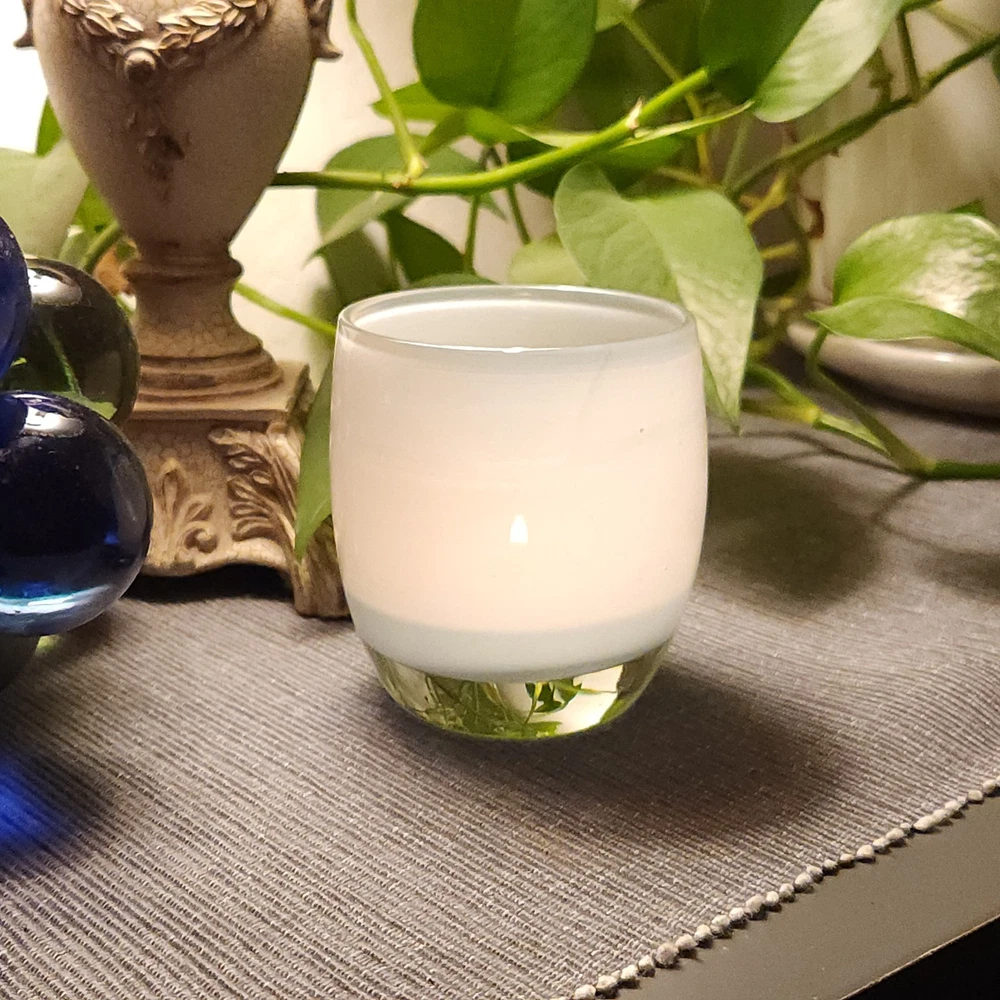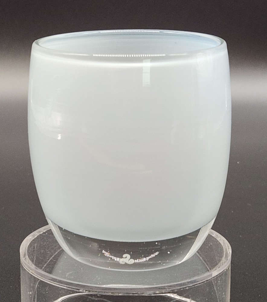This candle holder radiates kindness, literally. Who knew kindness could be so chic and translucent? Add a glow to your life without spilling your coffee. • Hand-blown glass construction • Light blue color with a clear base • Dimensions approximately 3.5" tall • Made in the USA • Durable and elegant design Used but in very good condition. No marks or wax on the inside. No chips or cracks. See photos for details.