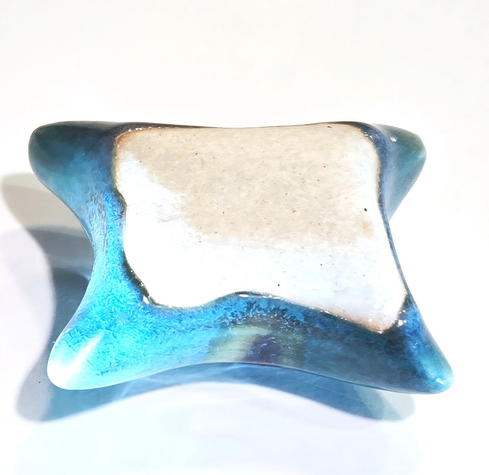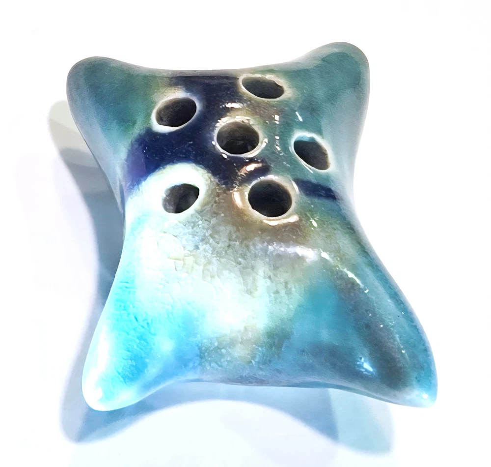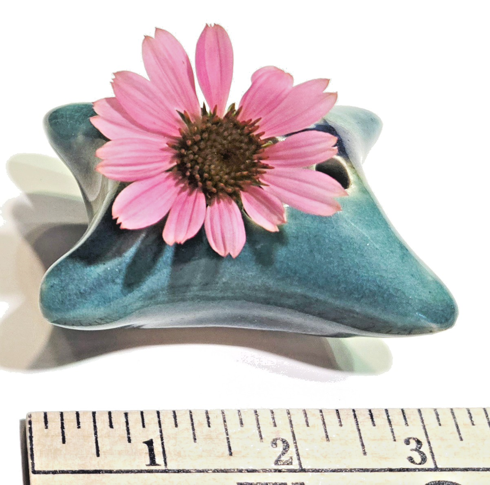 Glazed Pottery Pillow-Shaped Vase Frog Pillow Vase 3”X 2.25” Turquoise w/ Dark Blue + Rust Artisan-made, slight crackle glaze on top with unglazed bottom. Light use, clean, like new condition. Great for displaying small flowers on a kitchen window or next to you at your desk. Enjoy the tender gift of flowers from your child or loved one. Small holes (frog) help hold flowers upright.