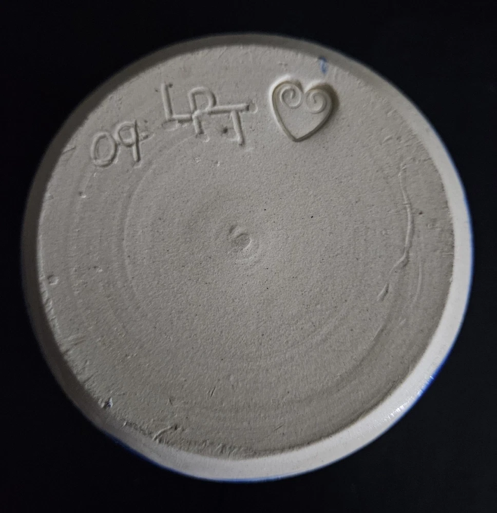 Handmade, hand carved artisan teinket/ keepsake box with lid. 2.5"H x 2.5"W at base. No chips, cracks or damage. Excellent condition. Signed LRT 2009 on bottom.