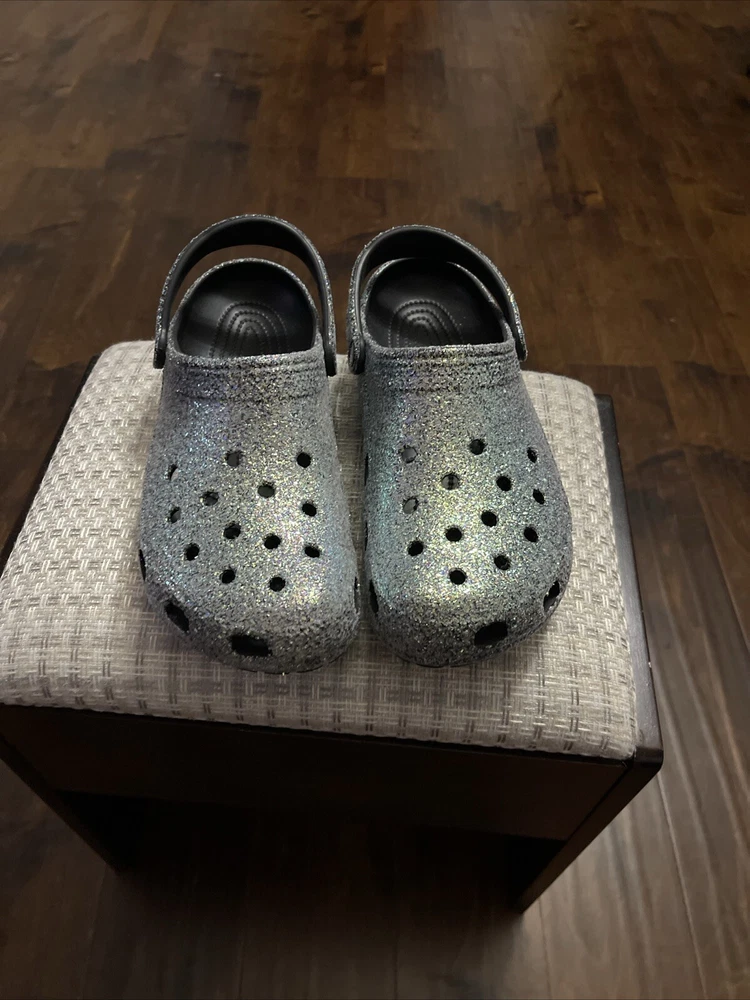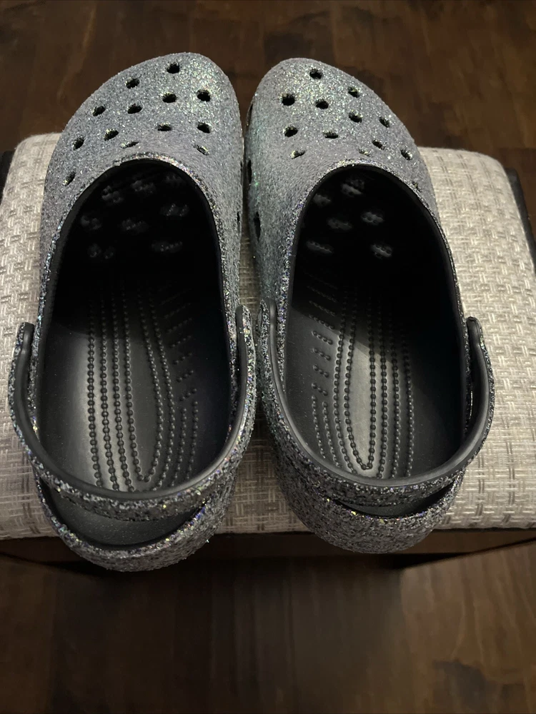 The "Glitter Crocs" are a pair of men's casual clog shoes in a size 11. They feature a glittery design on the rubber upper material, adding a touch of sparkle to the classic Crocs style. Perfect for lounging around the house or running errands, these Crocs combine comfort with a fun and stylish look.