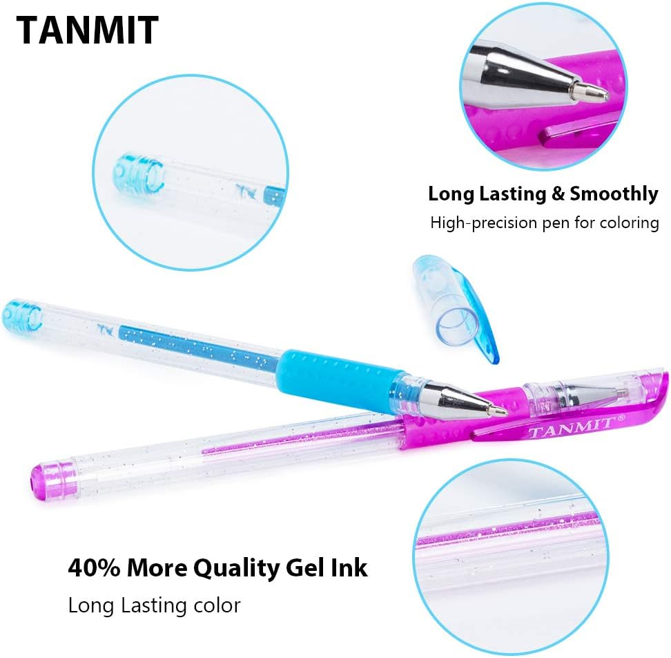 33 UNIQUE GLITTER GEL PENS: Tanmit’ glitter pen set includes 14’ Neon-Glitter and 19 Glitter Pens with glitter effect helps add extra charm for your artwork. Please enjoy sparkly color on ! SMOOTH AND MORE INK: each gel pen writes smoothly and easy to hold as they come with soft grips. 40% MORE INK for long last when writing, drawing, scrapbooking, sketching, crafting, doodling, art designs and journaling. FINE TIP & IMPRESSIVE PERFORMANCE: glitter pens have 1.0mm fine tip which can easily produce perfect lines for for Home-Made Invitations, Making Greeting Cards, DIY Decor & Letters to Friends & Family. BRIGHT COLORS & NON-TOXIC: coloring gel pens has a full spectrum of distinctive colors. Acid-free Non-Toxic and safe for skin. So they are allowed for children over 3 years old to create ornaments on skin. SUITABLE GIFT SET: artist gel pens make everybody happy and can not only be used for painting, but also at work and in everyday life. PLEASE keep the caps tight and lay down pens after using. QUALITY COLORED GEL PENS and’ spirograph pens - will make your dream come reality! ●You Need more colors for your adult coloring books, Zentangles, Mandala Coloring, School Projects. ●You want a surprise of the coloring effect which normal colored pens could not create. ● Use these’ draw pens to create rich and bright drawings, writings, to add ornaments to crafts.