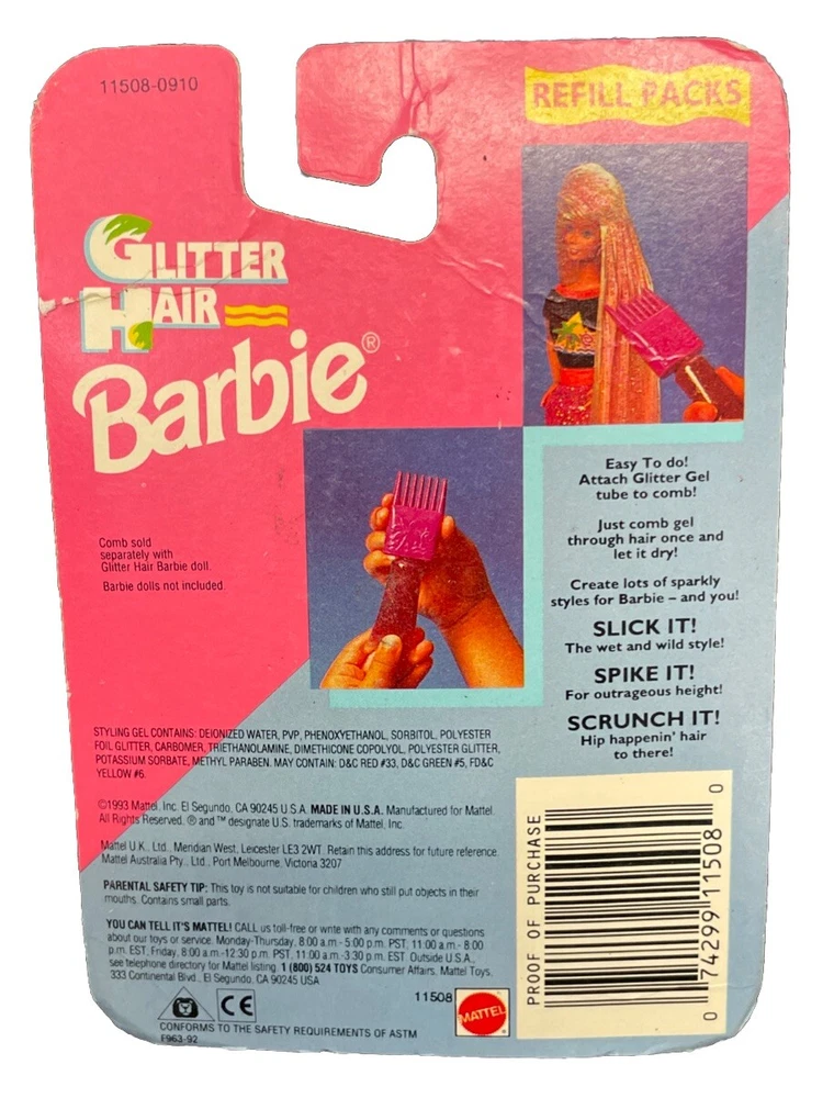 Handmade:NoCountry/Region of Manufacture:United StatesUnit of Sale:Single UnitPersonalize:NoSigned:NoYear Manufactured:1993Original/Licensed Reproduction:OriginalDoll Age Group:YouthMaterial:GelNumber of Pieces:1Series:Glitter HairSet Includes:AccessoriesCharacter:BarbieBrand:Mattelgtin13:0074299115080Vintage:YesUPC:0074299115080MPN:11508Occasion:All OccasionsPackaging:Original (Unopened)Antique:NoType:Glitter