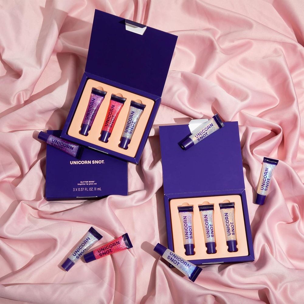 Glitter Lip Gloss - Sparkly Lip Shine - Stocking Stuffers for Women, Gifts for Teen Girls - Vegan & Cruelty-Free Non-Sticky Formula Gloss Glitter Makeup - Original Set of 3 High-Shine Lip Gloss Set: Unicorn Snot Glitter Boss Lip Gloss delivers a high-shine finish for bright, gorgeous lips. This sparkly lip gloss provides a smooth, moisturizing texture that doesn't feel sticky. Silky Smooth Feel: Elevate your lip gloss game with our cake-scented lip gloss! Enhanced with a sweet taste, this holographic lip gloss provides high shine for plumper looking lips. Shine On-the-Go: Unicorn Snot Glitter Boss comes in convenient tubes that easily fit into your wallet or bag. Quickly add a touch of sparkle and shimmer anytime, anywhere - perfect for raves, festivals and parties. No matter where you go, you will bring a flash of light! Easy Application & Removal: Apply the lip gloss directly on bare lips for a shimmering effect, or layer it over your favorite lip color for added gloss and flair. Enjoy long-lasting wear worry-free, and when it's time to remove the magic, effortlessly use a cotton pad and makeup remover. Our Unicorn Snot Lip Gloss ensures a clean removal, leaving no sticky residue behind. No Unicorns Harmed: Rest assured, our Lip Glosses cause no harm to unicorns or any animals. Unicorn Snot Glitter Lip Gloss is 100% Vegan & Cruelty-Free. Product Description The video showcases the product in use. The video guides you through product setup. The video compares multiple products. The video shows the product being unpacked. Glitter Boss Lip Gloss Merchant Video Add to Cart Add to Cart Add to Cart Add to Cart Add to Cart Customer Reviews 4.6 out of 5 stars 7,870 4.4 out of 5 stars 1,679 4.3 out of 5 stars 474 4.5 out of 5 stars 1,098 4.5 out of 5 stars 25 Price $14.99 $ 14 . 99 $9.99 $ 9 . 99 $13.99 $ 13 . 99 $19.99 $ 19 . 99 $18.00 $ 18 . 00 What it does Face & body glitter Sparkly lip shine Metallic liquid lipstick Protects skin from sun Hydrating facial mist Best for Festivals, parties, & raves Festivals, parties, & raves Festivals, parties, & raves Festivals, parties, & raves Refreshing dry skin Vegan ✔ ✔ ✔ ✔ ✔ Non-Irritating ✔ ✔ ✔ ✔ ✔ Glittery / Shimmery ✔ ✔ ✔ ✔ ✘ Scented ✘ ✔ ✘ ✔ ✘ Dimensions 6.0 inches x 11.0 inches x 4.0 inches. Weight: 3.7 oz Specifications Color Glitter Multi-Pack Item Form Liquid Product Dimensions 11 x 6 x 4 inches; 3.7 ounces Country of Origin China Skin Type All Finish Type Glittery Shipping: Shipped from the USA. Fast delivery within 2–3 days. Payment: PayPal, credit card, bank transfer. Returns: 30-day free return – we cover the shipping cost. Quality: Made in Europe/USA/China. No customs fees. VAT invoice on request. Feedback: You’ll automatically receive positive feedback after payment.