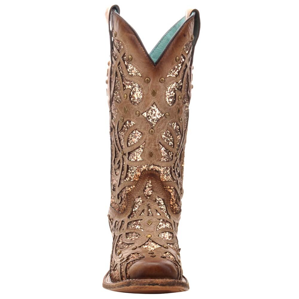 Glitter Tooled Inlay Square Toe Cowboy Boots Product Details Leather upper Dual pull tabs Glitter underlay Cushioned footbed Leather outsole Corral Boots are a symbol of modernization, handcrafting supreme quality boots. Featuring a beautiful and intricate glitter design with embroidered pattern throughout the leather boot. Saddle up for fashion, the dual material overlay add an element of prestige, perfect for those night outs in the town. Strut with confident as you embody these cowboy boots with any of your outfits. Additional Details Color: Brown Occasion: Casual Gender: Womens Age: Adult Brand: