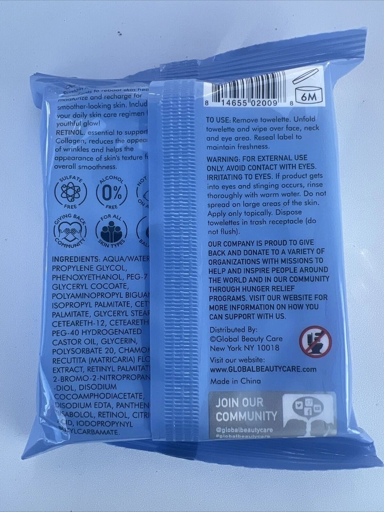 Features: Retinol Brand: Global Beauty Care Formulation: Cleansing Cloths Country/Region of Manufacture: China Gender: Women Body Area: Face Product Line: Beauty Care Type: Cleanser Size: 25 Cloths Modified Item: No gtin13: 814655020098 Volume: 25 Wipes UPC: 814655020098 Custom Bundle: No Expiration Date: 6 month after opening Skin Type: All Skin Types Size Type: Full Size