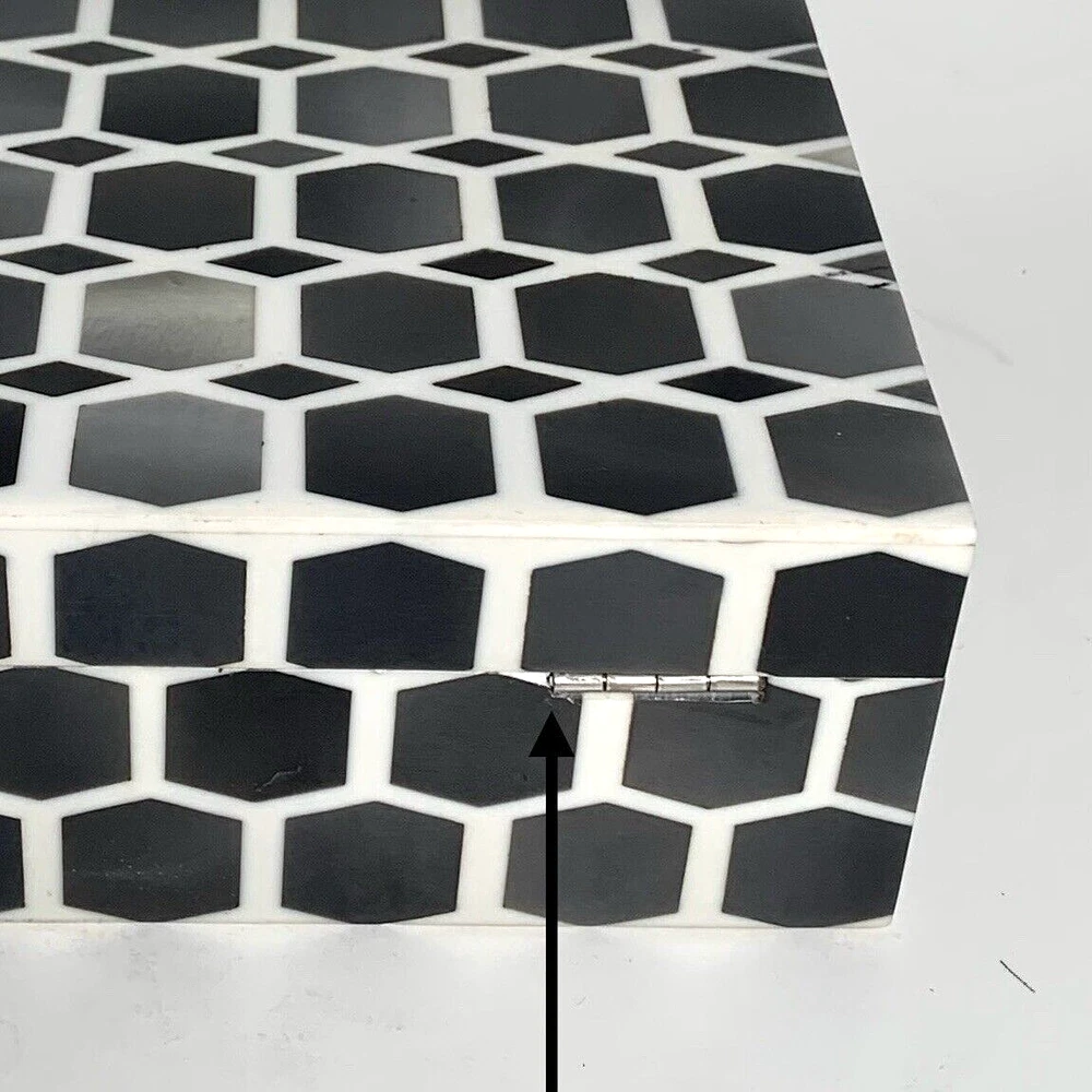 Global Views Storage-Trinket-Keepsake Box Substantial Wooden Inside Inlaid Bone and Resin Black, Grays & Cream Silver toned secure latch and hinges 6" Square A few shallow surface scratches on top. Several tiny chips along edges, on one corner and at base of back right hinge None obviously noticeable. ***I've pointed out a few in close-up photos*** Note: Vintage and pre-owned items will almost always show some signs of usage and wear. I try to describe each item as accurately as possible. ***Please view and enlarge all images for detail and condition verification*** I will gladly combine shipping when feasible. Please contact me for rates if purchasing multiple items. My goal is to provide excellent customer service. If you have any concerns upon receipt, please contact me immediately.