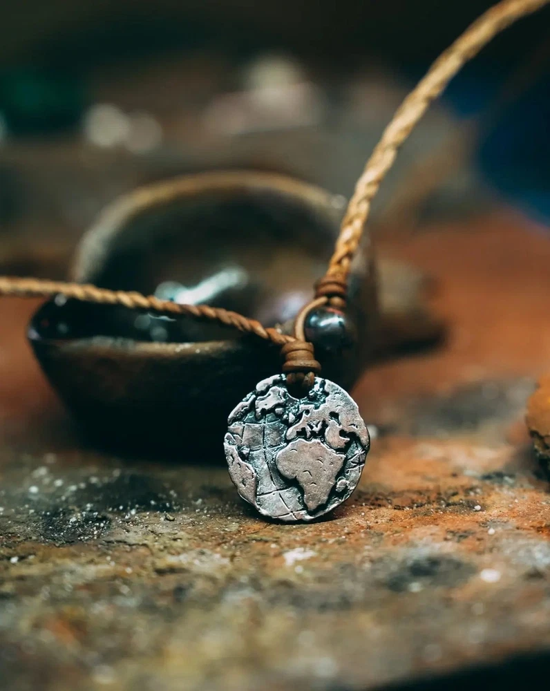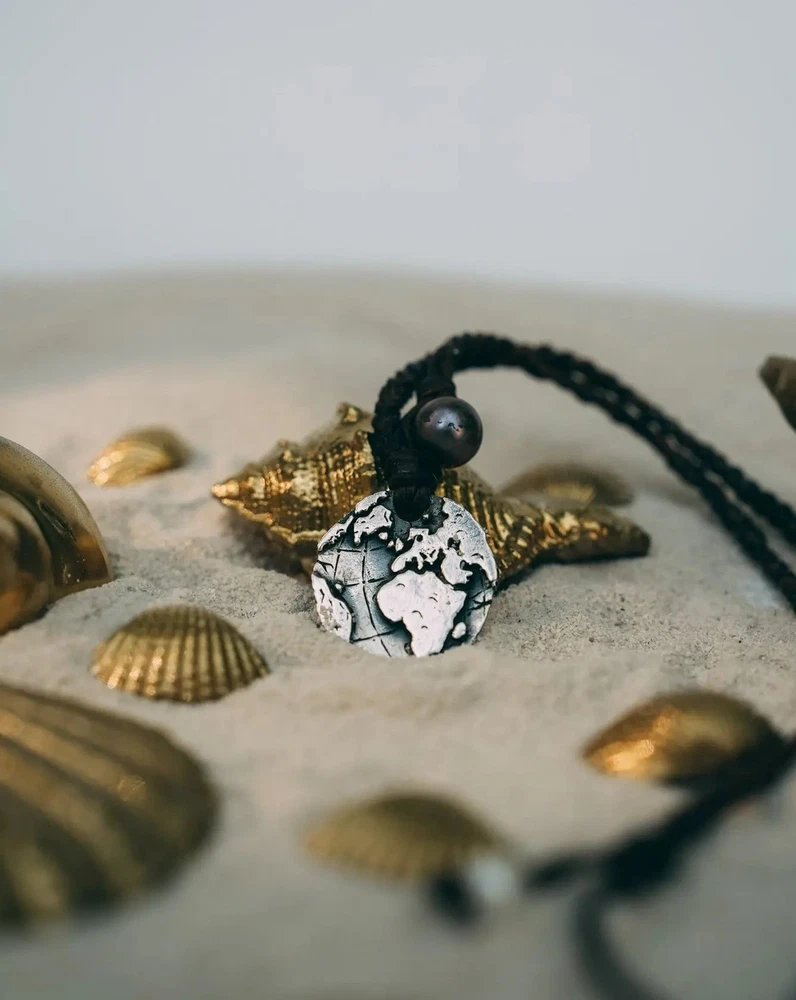 Globe Coin Necklace Navigate life's adventures with confidence wearing the Globe Coin Necklace. Crafted Premium 925 Silver, Leather & Authentic pearls, it is an accessory that complements any outfit and never needs to be taken off. - 925 Silver - Premium Black Pearl - Two white pearls in back for size adjustment - Authentic Braided Leather Chain Each piece is handmade to last a lifetime.