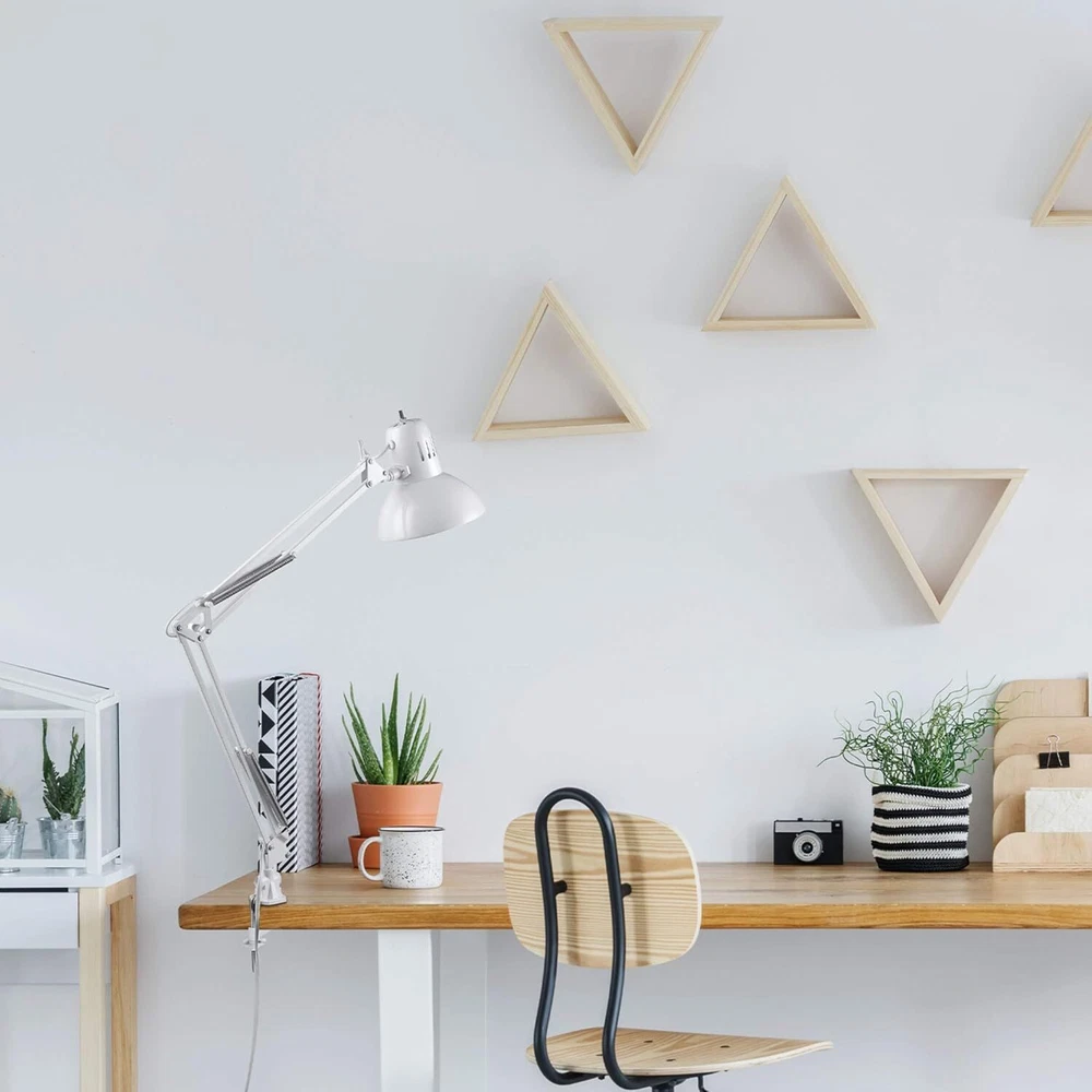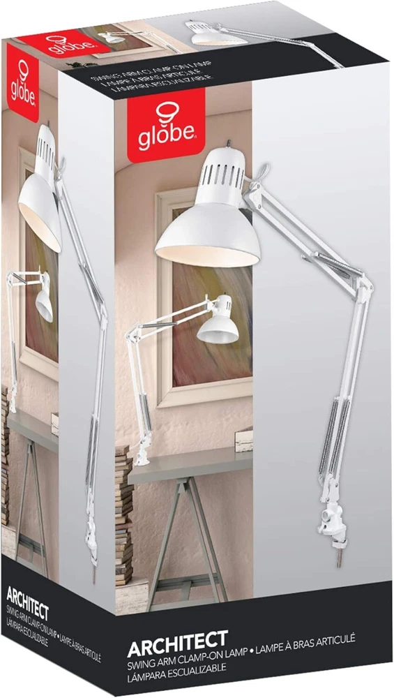 Globe Electric 52847 31.5 Inch Swing Arm Clamp-On White Desk Lamp with Product Details Finish Type: Glossy Base Material: Metal Bulb Base: E26 Product Dimensions: 21"D x 6.69"W x 31.5"H Item Weight: 1.9 Pounds MODERN ESSENTIAL: designed to illuminate blueprints and drafting papers, the Architect Lamp has been around since the 1920's but it has become a modern essential item for your home with exposed structural and architectural elements and a glossy white finish VARIABLE MOUNTING: the moveable metal clamp allows you to mount this lamp on any surface (up to 2" wide) such as a desk, bedframe, or counter while keeping the lamp upright and easy to use - a 6 foot (1.8 meter) cord gives you the length you need to reach any space BULB REQUIREMENTS: 1x E26/Medium Base 60W Bulb (sold separately) ADJUSTABLE: the spring-loaded arm and easily adjustable lamp head help direct the light wherever you need it the most ON/OFF ROTARY SWITCH: conveniently located on the top of the lamp shade for quick and easy use