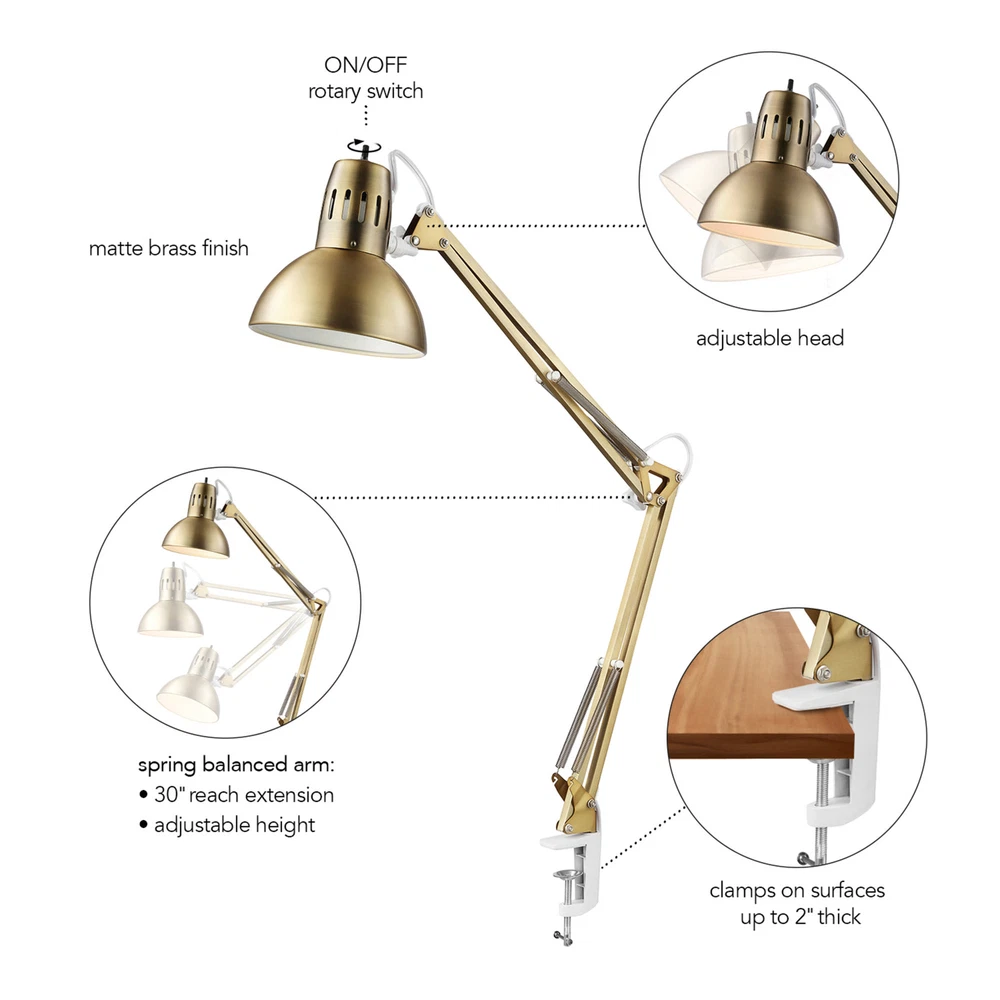 Powered by Frooition All Categories Globe Electric 52847 Architect 33" Tall Swing Arm Desk Lamp Overview Item Description Out of the office and into your home, the Architect Swing-Arm Clamp-On Desk Lamp stylishly adds a pop of color to your loft, dorm room, make-up station, night table, chic home office or child's desk. The moveable clamp lets you place your light on any surface with an edge, essentially a truly multipurpose lamp. Swing-arm task lamps can look right at home any where bright, focused light is needed. They can be clamped onto a countertop, a shelf on the wall or onto floating shelves in your kitchen if space is really tight. The adjustable head and neck can be moved without interfering with the wiring, so you always have the perfect light. Features The moveable metal clamp allows you to mount this lamp on any surface (up to 2" wide) such as a desk, bedframe, or counter while keeping the lamp upright and easy to use - a 6 foot (1.8 meter) cord gives you the length you need to reach any space The spring-loaded arm and easily adjustable lamp head help direct the light wherever you need it the most Conveniently located on/off switch at the top of the lamp shade for quick and easy use Constructed from metal Includes a metal shade (1) 60 watt maximum medium (E26) bulb required Rotary switch ETL rated for dry locations Dimensions Height: 31-1/2" Width: 21" Depth: 6-11/16" Product Weight: 1.9 lbs Shade Height: 6-7/16" Shade Width: 6-11/16" Electrical Specifications Number of Bulbs: 1 Max Watts Per Bulb: 60 watts Bulb Base: Medium (E26) Bulb Shape: A19 Bulb Included: No Why Choose BuildInc? OUR PROMISE TO YOU About Us At Build, we promise to provide the best selection we can, most competitive pricing, and unmatched customer service. Our store has quality home improvement products from trusted manufacturers like Moen, American Standard, Delta, Kraus, Kichler, Progress Lighting, Schlage, Kwikset, Baldwin, Broan, NuTone, Air King, and Rev-A-Shelf. With over 200,000 home improvement products for you to choose from, we have just what you need to get your project done. Fast & Free Shipping We promise to make it our priority to get you your items as fast as we can. We ship from 440 warehouses around the country, ensuring that your product will get to you as soon as possible. We know you're eager to get your hands on your new purchase, we would be too. As a bonus, most items ship for free. Returns We are happy to accept returns of unused or defective items for a refund within 30 days from the date of delivery. For returns outside 30 days, please contact our Customer Service team to go over our options. For full details, please view the Shipping and Payments tab above. To initiate a return simply go to the eBay Returns Portal and submit a return request. We ask that all items be returned with all original components via a traceable method. Once your return is received and processed, we will quickly get your refund or replacement issued. If for any reason you are unsatisfied with your purchase or for product or warranty questions, please contact Customer Service team for assistance. More Items! View more great items! About Us | Shipping | Returns | Contact Us | FAQ | Collections | Special Offers! Powered by Frooition Frooition Frooition | No-js Template | eBay design, eBay store design, eBay shop design, eBay template design, eBay listing design (ver:froo_no_js) This listing is currently undergoing maintenance, we apologize for any inconvenience caused.