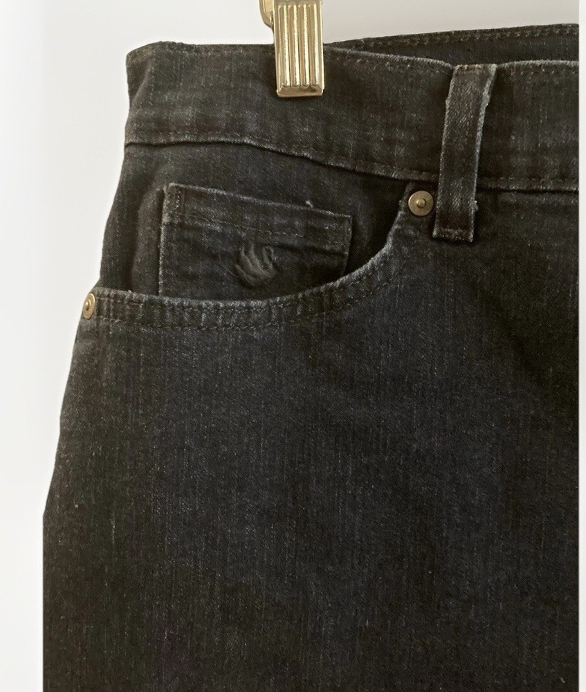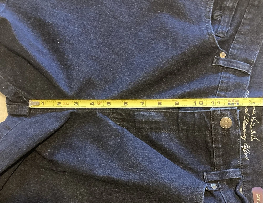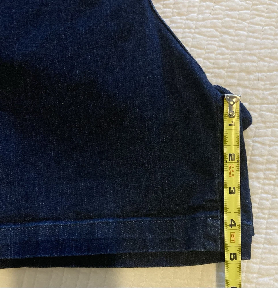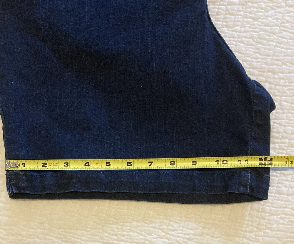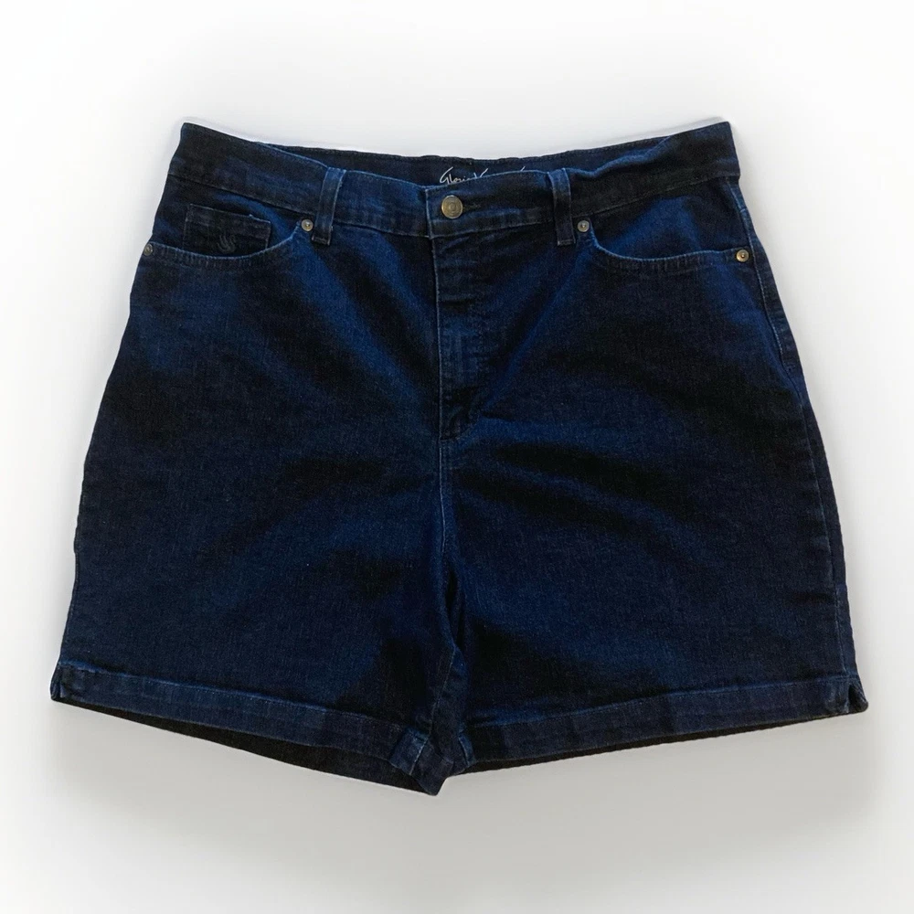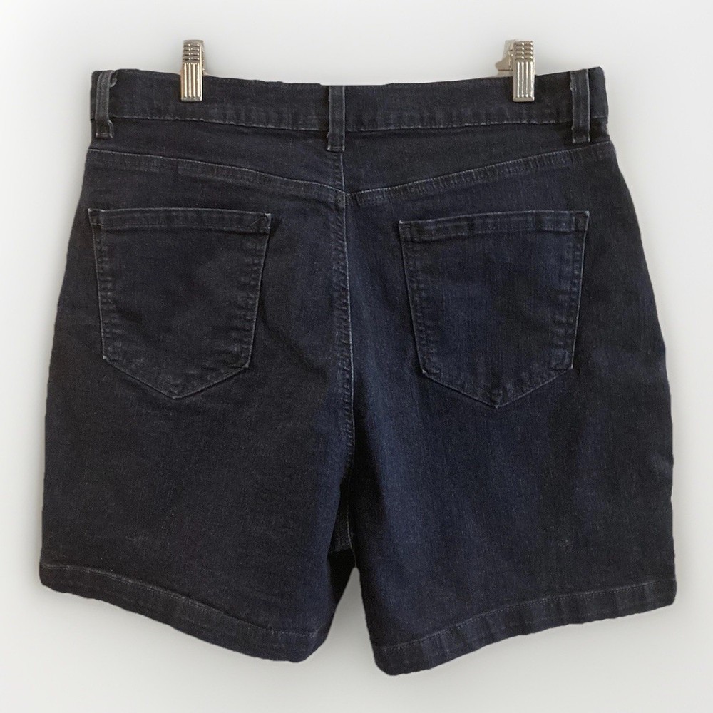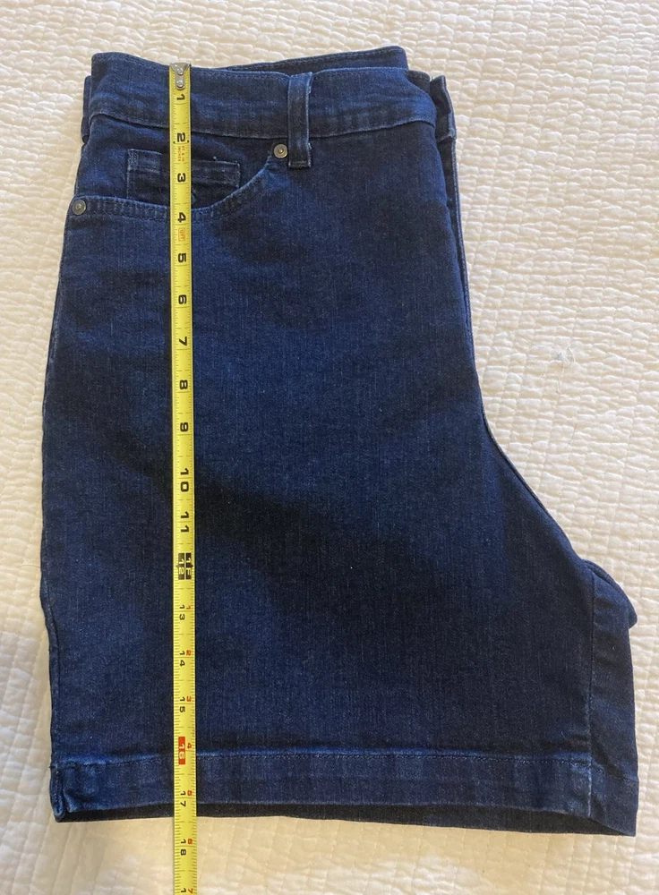 Gloria Vanderbilt Amanda All-Around Slimming Effect Stretch Dark Denim Shorts in size 16. With a solid dark wash and slim fit, these shorts feature a zip closure, flat front, and a high-rise waist for added slimming effect. Made from a cotton blend denim fabric, these shorts are machine washable and perfect for the summer, fall, or spring seasons. The Bermuda style with a 5-pocket design, 5-inch inseam, and 12-inch rise make these shorts a staple piece for your wardrobe. No stains, tears, or rips. Zip and button closure is fully functional. 12” rise 5” inseam 34” waist 17” total length