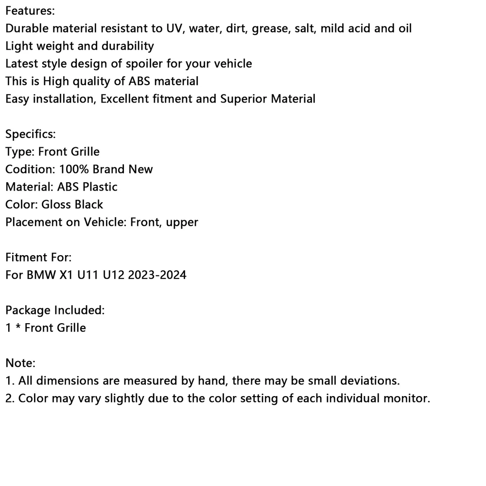 You may also like Gloss Black Front Bumper Grille Grill Fit BMW X2 Series F39 2018-2023 88.85 USD Free shipping Pair Chrome Diamond Grille For BMW E46 Saloon/Touring Facelift 2002-2005 4Dr 61.85 USD Free shipping Front Bumper Grille Grill White Led Light Fit Ford Ranger 2015-2023 T7 T8 42.18 USD 45.85 USD Free shipping 8% off 2PCS Front Bumper Foglight Cover Grill Fit Audi A6 C7 2014-2018 Black Chrome 58.85 USD Free shipping ABS Gloss Black Chrome Front Bumper Grille Fit C-Class Benz W204 C300 C350 08~14 64.85 USD Free shipping Raptor Grille Grill LED Light Wiring Harness Cable Fit Ford F-150 F150 20.85 USD Free shipping Pair ABS Front Fog Lamp Lower Grille Grill Cover Kit For Audi Q5 MK1 2013-17 74.85 USD Free shipping Front Bumper Upper Grill Grille Fit Mercedes R230 SL500 SL600 2003-2006 1 Fin 139.85 USD Free shipping 2PCS Front Bumper Cover Grille Bezel Insert Fit Audi Q5 2018-2022 Gloss Black 74.38 USD 80.85 USD Free shipping 8% off Gloss Black Front Kidney Grill Grille Fit BMW 3 Series F30 F31 F35 2012-2019 48.85 USD Free shipping Front Kidney Grille Grill Fit BMW 2007-2010 E92 E93 328i 335i 2DR Meteor Black 55.85 USD Free shipping 2 Piece Front Bumper Grille Grill Fit Toyota 4Runner TRD PRO 2020-2024 Black 149.85 USD Free shipping Features: Durable material resistant to UV, water, dirt, grease, salt, mild acid and oil Light weight and durability This is High quality of ABS material Easy installation, Excellent fitment and Superior Material Specifics: Type: Front Grille Codition: 100% Brand New Material: ABS Plastic Color: Gloss Black Placement on Vehicle: Front, upper Fitment For: For BMW X1 U11 U12 2023-2024 Package Included: 1 * Front Grille Note: 1. All dimensions are measured by hand, there may be small deviations. 2. Color may vary slightly due to the color setting of each individual monitor. -About US Founded in 2012, VIPJQ have professional development and sales, and are involved in various products, providing customers with various high-quality products. Since its establishment, VIPJQ has always adhered to the service concept of "customer first" and the management concept of "pursuit of quality", and is committed to providing customers with high-quality original designs. We commit to provide you the best innovative, quality products & professional services with competitive prices. We value every customer, and we look forward to providing solutions for your business needs to help your business achieve its goals, please contact us immediately! We are all about you! We are a Japanese seller,but with large warehouse in USA. We are profesional on Auto Parts,Car Parts,Motorcycle Parts,3C,other hot sale items and so on. We aim to provide to customers high quality product and best service. -About Shipment&Returns The item usually will be dispatched within 3 days after you ordered.All are free shipping. And it usually takes 3-10 working days to delivery depends on buyers' address or other majeure on the way. If you are not satisfied with the items and want to return the item,we hope you could message us first,we will give you the return details, we think we could give you the best service to save your time and money.Thank you. -About Feedback&Customer Service If you are enjoy your shopping here,not only enjoy the items but also the service,we are appreciate you could give us a 5-star feedback. If you are not satisfied with the item,before you give us the negative feedback,we hope we could give you the best solution through our commutication. We think we could do it if you give us the chance.Thank you.