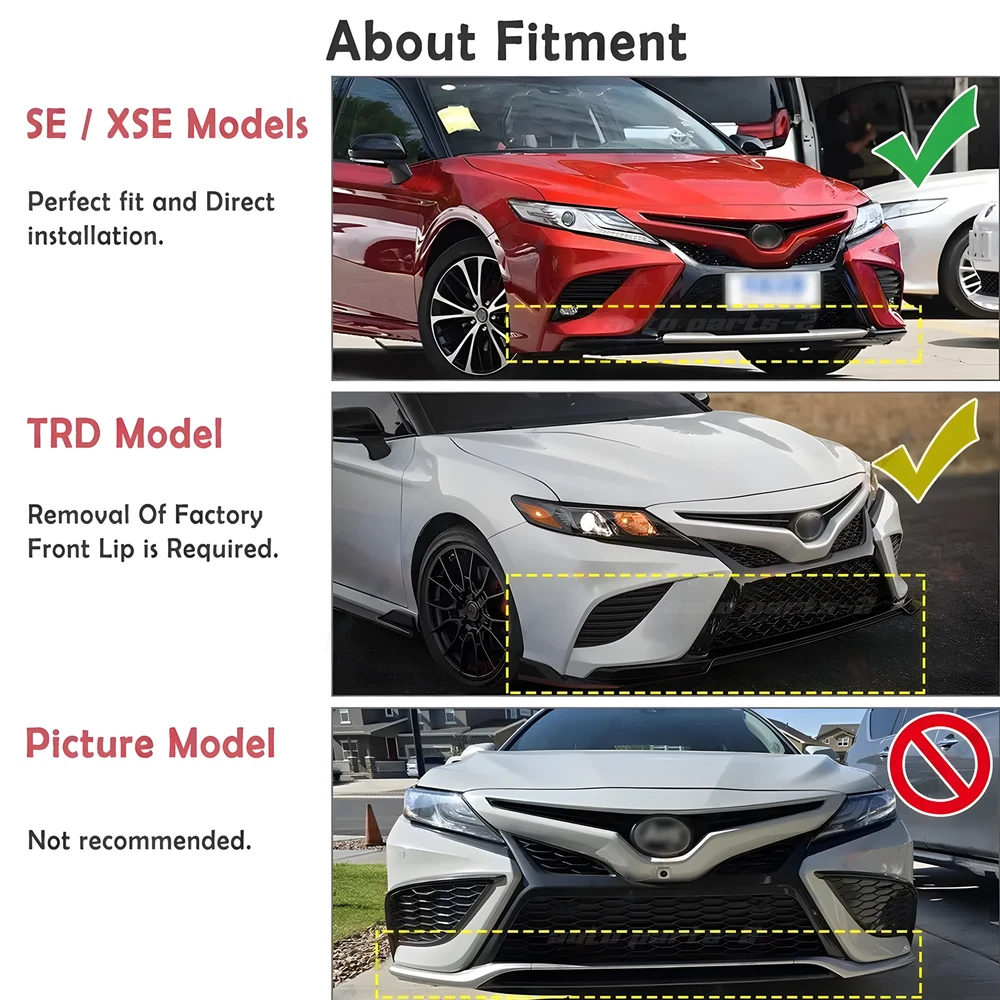 Home Payment Shipping About us Contact us Details Fitment: Compatible Models: Fits 2018-2024 Toyota Camry SE and XSE Models Only. TRD Model: Can also fit TRD Model, but removal of factory front lip is required . 2021-2024 Models: The lip will fit, but may leave a small gap. Extra tape and screws can be used to minimize this. Package Includes: 1 Set of 5 Piece Front Lip Kit with installation accessories as shown in the pictures. Features: Brand New: 100% Authentic V2 Design Front Bumper Lip Splitter Kit at a competitive price. Direct Add-On: Front lip splitter kit with a winglet design; the winglet pieces are detachable and can be painted in different colors easily. Quality Construction: Excellent fitment and quality, made of lightweight and top-grade durable PP material. Upgraded material thickness for enhanced durability. The two winglets are crafted from hard ABS material. Color Finish: The lip kit comes in a painted glossy black color finish . Note: this is aftermarket generic black paint and may not match factory paint exactly. Aesthetic Upgrade: Dramatically improves the sporty appearance of your Camry, adding an aggressive look to the front end. Installation Note: Instructions Not Included: Drilling and the use of self-tapping screws are required for installation. Professional installation is highly recommended. Shipping Policy Payment Method Returns Policy Shipping Policy All orders will be shipped within handling time ( Business Days ) after the payment is cleared. We use Standard / Expedited Shipping Service: all shipments will be with valid tracking number. If you didn't received your shipment within estimated shipping time , please contact us. We will check and offer a good solution to you . Our goal is customer satisfaction! Payment Method We accept multiple payment methods which ebay allowed . For faster service, please update your correct address before sending payment. We do not accept any transaction methods other than ebay. Returns Policy We offer 30 days exchange or return and money back policy If you feel unsatisfied with our product for any reason , please contact our professional customer team within 30 days ,you can choose exchange , return or refund , we will take care of your issue . If the product is defective or damage upon arrival, please contact us immediately don't open dispute , we will spare no effort to offer the best solution . As most of our products are aftermarket car parts, which DO NOT come with instructions.PROFESSIONAL INSTALLATION is highly recommended. Before install your item, please refer to internet or your local Auto parts store for some tips. Buyer assumes all risks for any improper installation and usage. NOTE : Any item that is approved for exchange or return, item will need to be in brand new condition, which means the item is never installed and needs to be kept in original packaging. Fees will be applied for missing parts or damages. We don't accept return if item got used , modification painting or damaged for improper installation. Whatever happens, please contact us. Our goal is 100% customer satisfaction. We will reply you within 24 hours on working days.