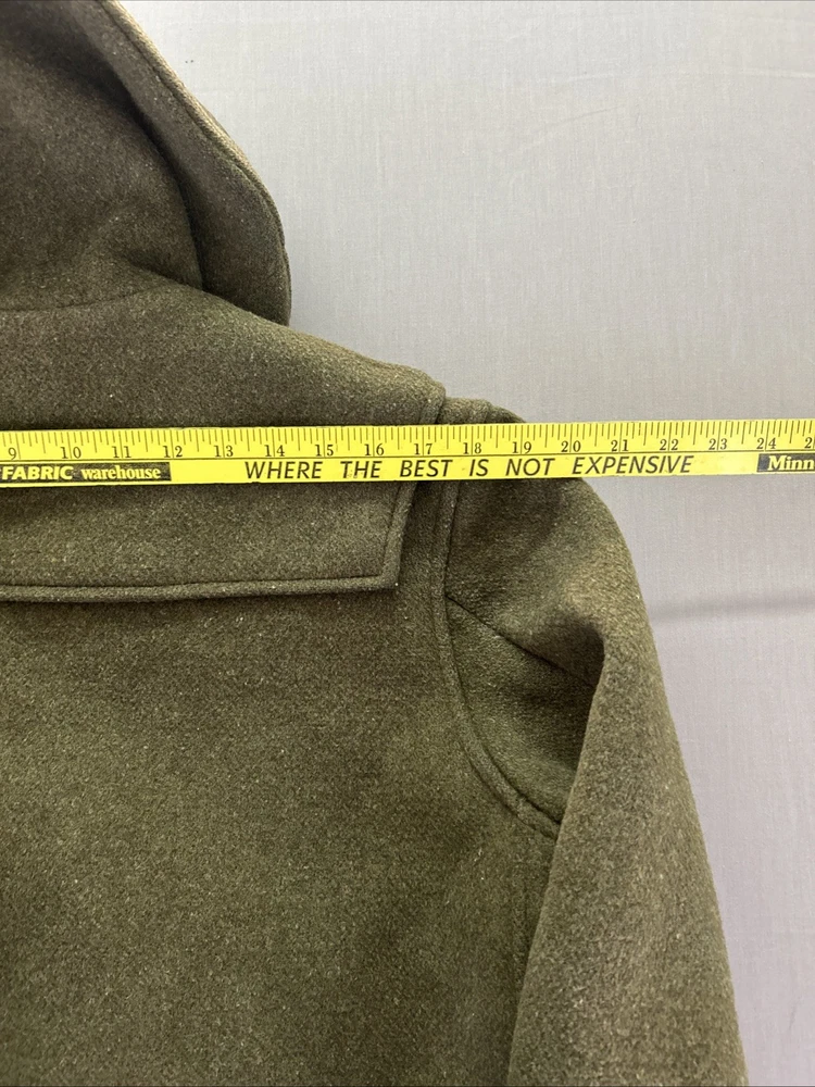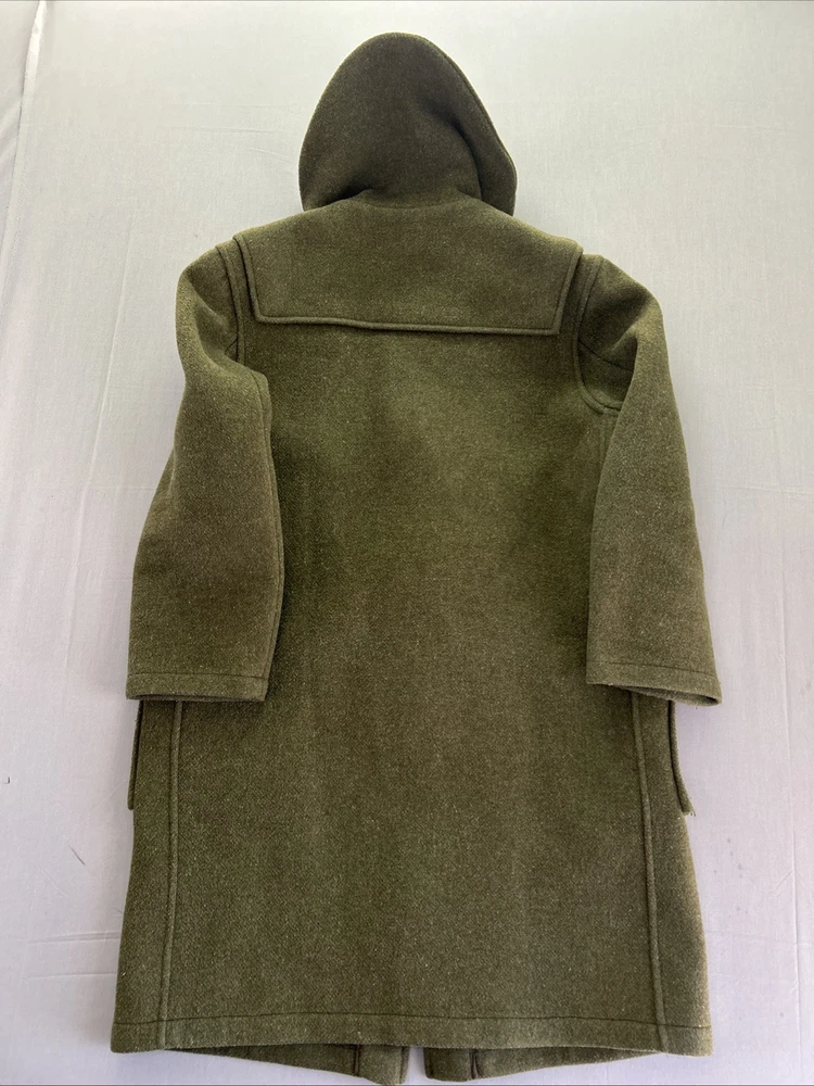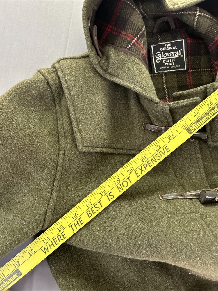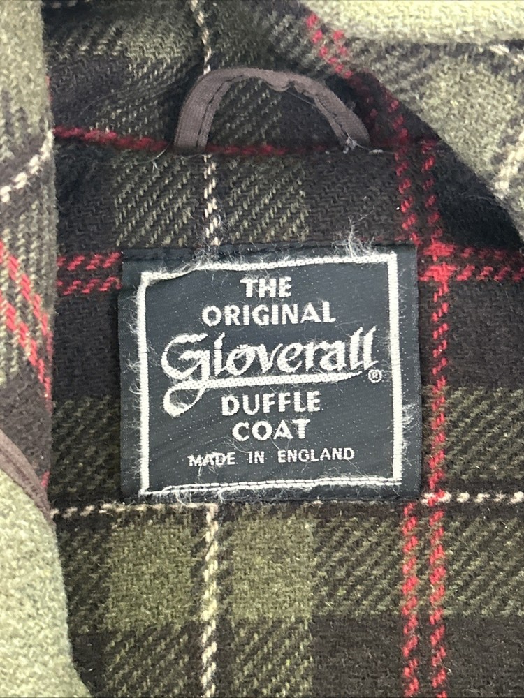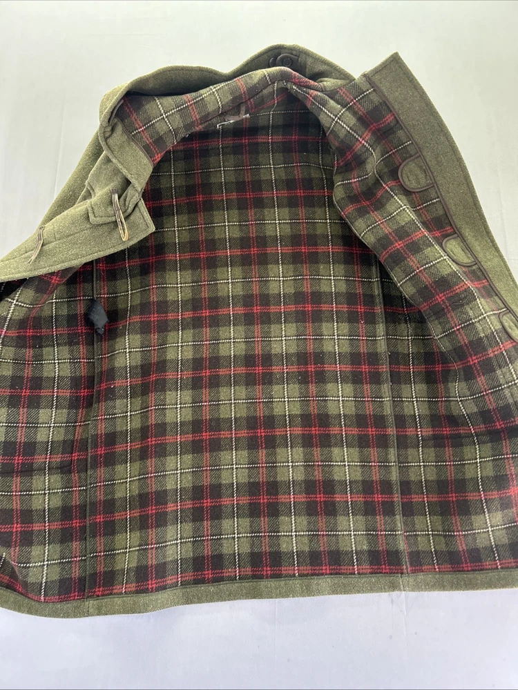 Gloverall “The Original” Duffle Coat – Made in England Classic British heritage outerwear from one of the most respected duffle coat makers in the world. This authentic Gloverall duffle coat features a traditional olive green wool body, wooden toggle closures with leather straps, fixed hood, and signature tartan plaid lining. Made in England. A timeless cold-weather staple with military roots and strong dark academia / heritage styling appeal. 📏 Measurements (Laid Flat) Pit to Pit: 22.5” Length: 39” Shoulder to Shoulder: 18” Sleeve (Pit to Cuff): 14” Estimated Men’s Medium (please compare to a coat you own for best fit). 🧵 Features Heavy wool melton construction Wooden toggle closures Leather toggle straps Two large front patch pockets Fixed hood Plaid tartan lining Made in England 🧼 Condition Pre-owned in good vintage condition. Light general wear consistent with normal use. Toggles and leather straps intact. No major flaws noted. See photos for condition and measurements. Ships next day, excluding Sundays.
