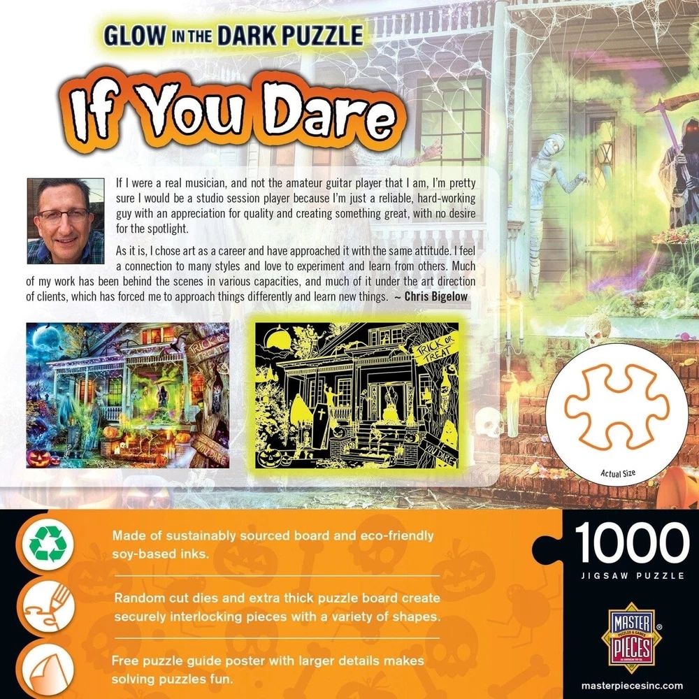 Come by and trick or treats... if you dare! Dont be afraid of the dark, the scariest house on the street will glow in the dark for you and has doors wide open for brave trick or treaters tonight. The moon is full and is shining down, lighting the way for those with enough courage. Do you dare? Glow In The Dark Jigsaw Puzzle 1000 Piece If You Dare Halloween Theme Come by and trick or treats... if you dare! Dont be afraid of the dark, the scariest house on the street will glow in the dark for you and has doors wide open for brave trick or treaters tonight. The moon is full and is shining down, lighting the way for those with enough courage. Do you dare? Product Attributes: Weight (lbs.) : 1.25 lb UPC: 705988723407 Brand: MasterPieces