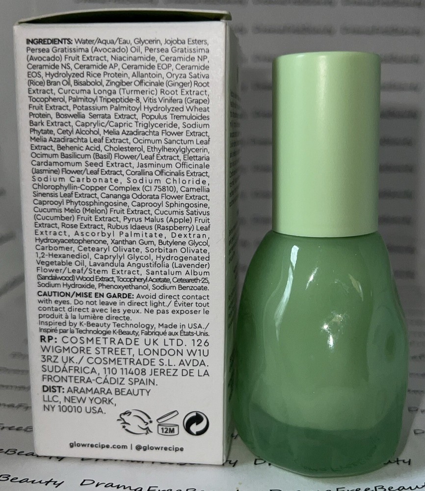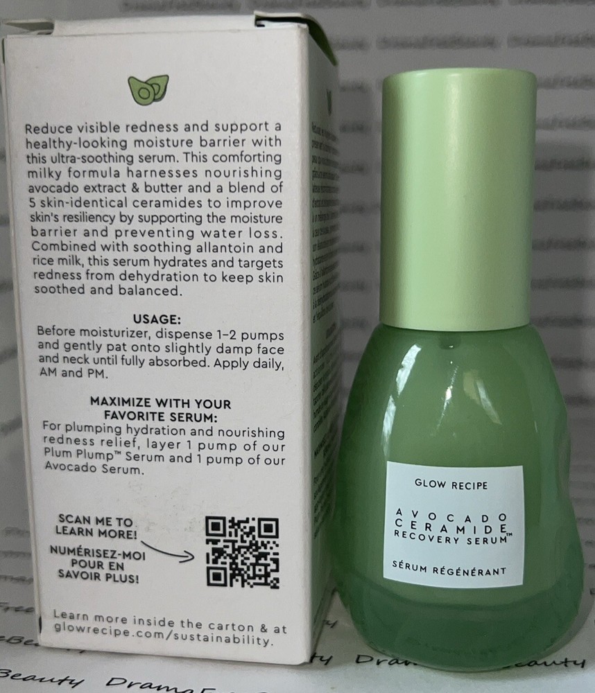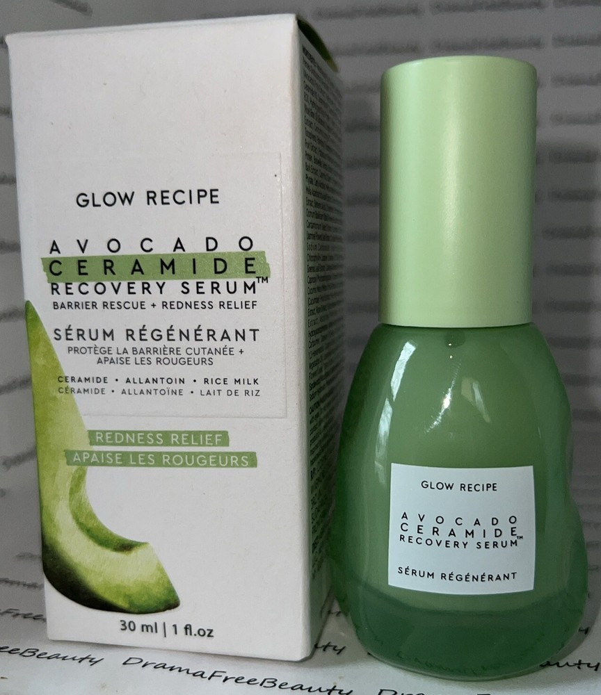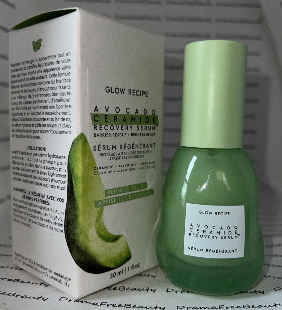 Glow Recipe Avocado Ceramide Recovery Soothing Skin Barrier Redness Relief Serum 30 ml. / 1 fl.oz., Full Size, Brand New in Box Reduce visible redness and support the skin barrier with the soothing and calming Avocado Ceramide Recovery Serum. Formulated to target dehydration, irritation, and redness, this lightweight milky texture wraps sensitive skin in a healing layer of actives to restore skin to its natural, healthy state. This innovative recipe is created with a blend of powerful plant-based ingredients such as nutrient-rich avocado extract + butter, strengthening ceramides, and calming allantoin and rice milk to help strengthen and recover irritated, compromised skin.
