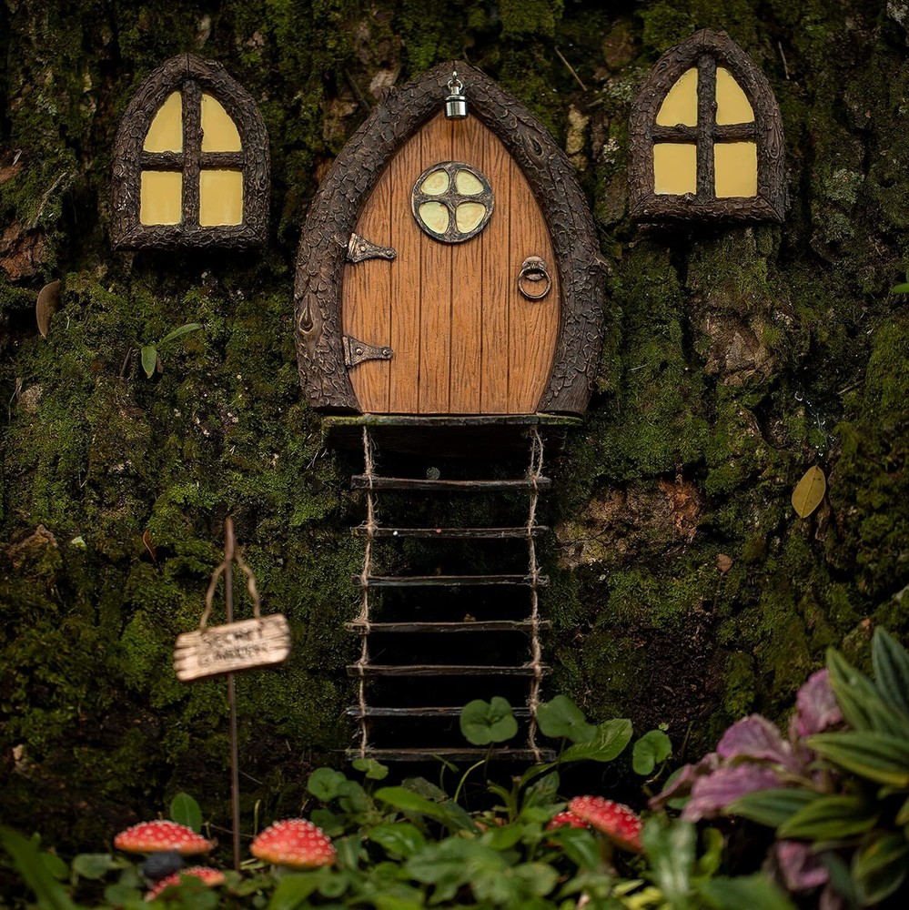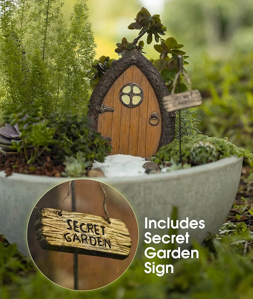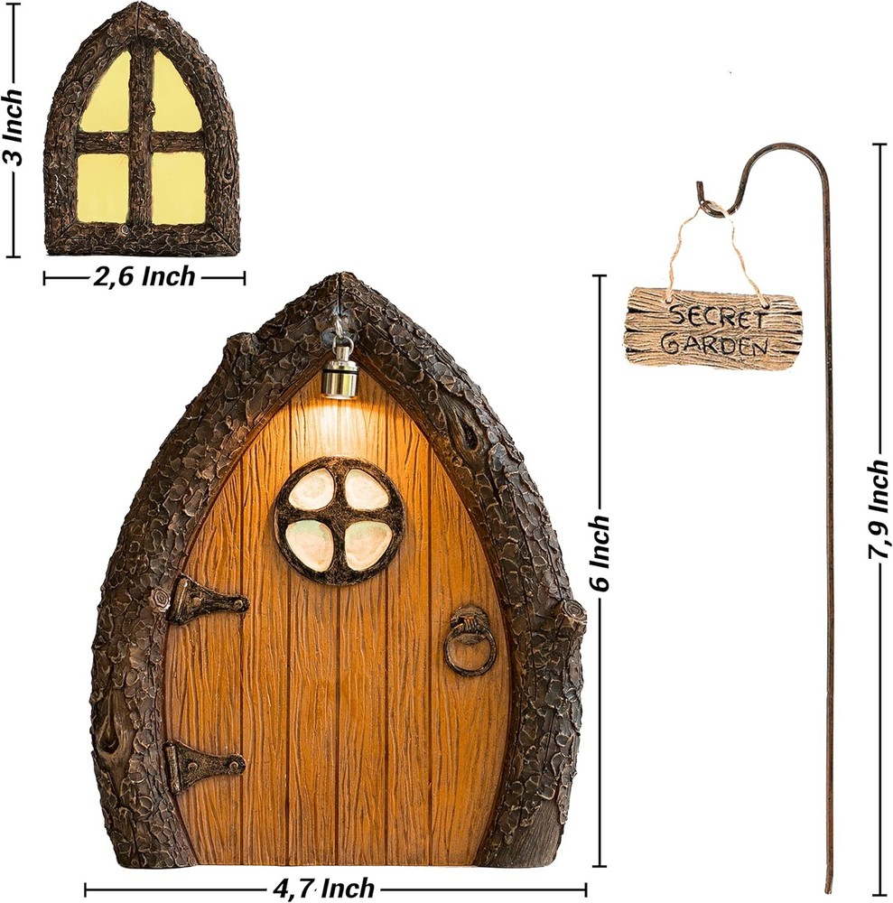 MAGIC FAIRY DOOR KIT: Welcome the fairies, gnomes and pixies in to your garden with a fairy door and windows! It looks great attached to a tree trunk, in a fairy garden, a pot on the patio, terrariums or your kids’ room as a mini fairy door tooth fairy entryway. Spend some time in nature and create beautiful memories with your loved ones with our fairy wooden door and windows Quality guaranteed: Your new fairy door set is made of weather resistant frost proof polyresin, and can be displayed both indoors and outdoors during all seasons. Hand painted with non toxic and ecofriendly paint, and the windows and lantern glow in the dark so there's no solar batteries to change. Easily attach this secret fairy door to any surface using the keyhole slot and easy setup screws So many fairy door ideas: Build magical doorways for the fairies to come to your world. Attract all gnome and fairy folks in your DIY garden by complementing it with other supplies such as figurines, glitter, led lights, steps, mini pots and planters, bird baths, miniature furniture, gnome figures, plants, sculptures, fairy houses and other Irish or princess accessories. This fairy door windows kit is the perfect decoration Best friend fairy gifts: This enchanted fairy door and windows are the perfect gift for fairy lovers and kids. Enjoy the gardening experience with your little one with this kit, it is designed to nurture their creativity, expression and learning as they build a fairy garden around it. GIVE BACK: Fairies’ job is to heal and protect the environment. You can help them! We have partnered with the NGO OneTreePlanted and are giving part of our proceeds to plant trees in the Amazon forest Glows in the dark: This outdoor fairy door is beautifully hand painted and sculpted with realistic details and a natural woodland look, and a Secret Garden sign. It includes two glow in the dark windows which will collect sunlight during the day to give your garden a whimsical look at night. It looks absolutely magical nestled at the base of a tree or hidden in the bushes for the little ones to find