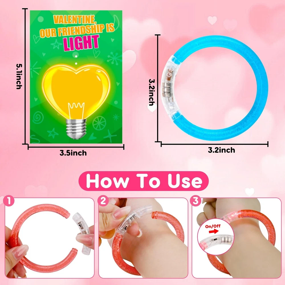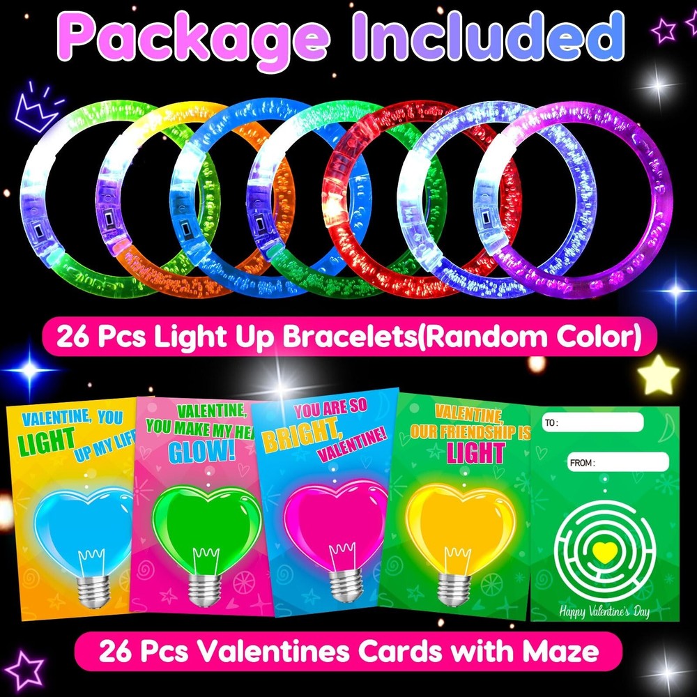 Thremhoo 26PCS Glow in the Dark LED Bracelets Valentine Day Cards for Kids School Classroom Funny Light Up Valentines Exchange Gifts for Toddler Boys Girls Valentine’s Party Treat Stuffers Fidget Bulk Product Details Color: Colorful Material: Plastic Brand: Thremhoo Theme: Love Item dimensions L x W x H: 1 x 1 x 1 inches Occasion: Valentine's Day Manufacturer: Thremhoo Age Range (Description): Kid Product Dimensions: 1 x 1 x 1 inches Item Weight: 1.23 pounds Country of Origin: China Manufacturer recommended age: 3 years and up Perfect Valentines Gifts for Kids ClassroomOur Valentines day gifts for kids includes 24pcs LED light up glow in the dark bracelets, 24pcs valentine cards and twisty ties. Flashing LED lights create a fun atmosphere for kids valentine party. Pick suitable colors for different friends. Great Valentines day exchange cards for kids classroom! Amazing Light Up Grow BraceletsOur glow in the dark party favors LED bracelets have different colors which are delivered randomly. The light-up part is super-cool with 3 button batteries. Light up in the dark ,enjoy the glow party glow time with flashing of the glow bracelet. Best class Valentines day gifts for kids that bringing more fun on Valentine's Day! High Quality Glowing Valentine ToysThe LED party bracelets made of high quality PVC Material, non toxic, non-flammable, non- radioactive. Great valentines day party suppliers, valentines day goody bags stuffers, valentines day gifts cards for kids classroom. More fun & less pressure! Great candy alternative for toddler boys girls in Valentines,valentine exchange greeting cards for school class classroom, valentines treats. High Quality Glowing Valentine ToysThe LED party bracelets made of high quality PVC Material, non toxic, non-flammable, non- radioactive. Great valentines day party suppliers, valentines day goody bags stuffers, valentines day gifts cards for kids classroom. More fun & less pressure! Great candy alternative for toddler boys girls in Valentines. Perfect Valentines Day Glow Party GiftExchange fun light up bracelets can be a hit on Valentines Day for both boys and girls. Sparkling lights, full of atmosphere, suitable for kids party favors, valentines exchange cards, classroom prizes, school party supplies gifts, valentines treat bags, valentines boxes for kids, party favors for kids 3-5 4-8, goodie bags for birthday party, Glow in the dark LED bracelets.