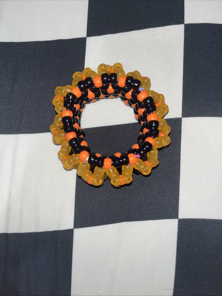 Orange and black partail glow in the dark UFO cuff. made with pony beads, and rainbow elastic string. Put up to the light and turn off the light to see it glow. 100% hand made by me. if you buy thanks for really helping me out!
