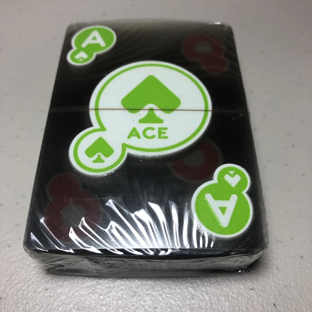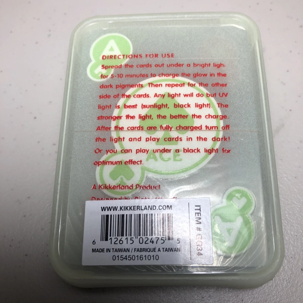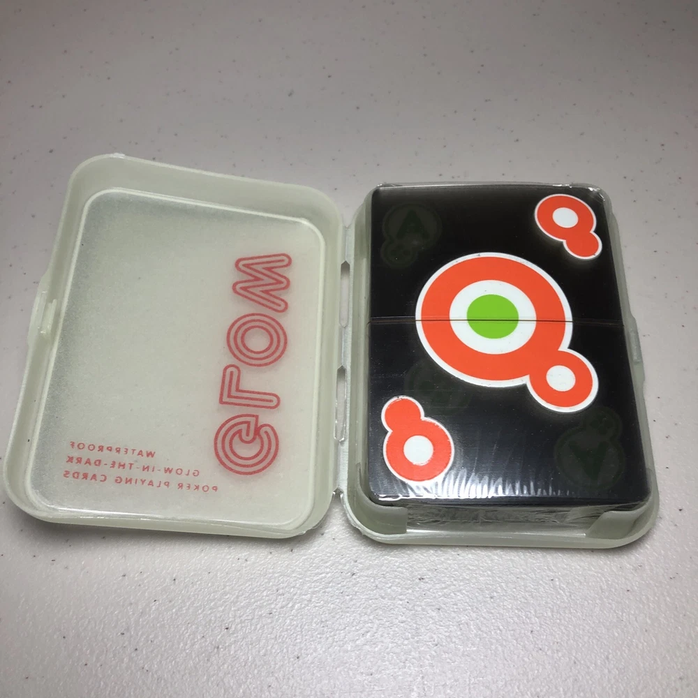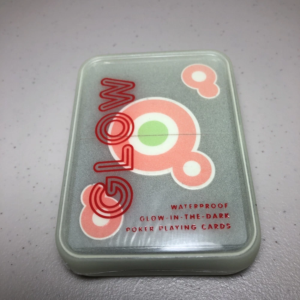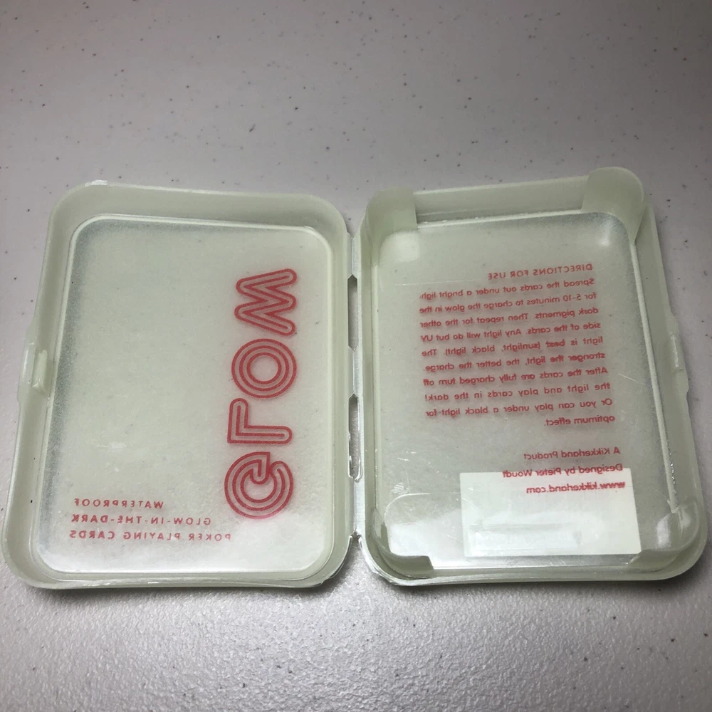 Glow in the Dark Waterproof Poker Playing Cards With Case, Kikkerland, New Sealed Deck is sealed in plastic and comes in a plastic case. Directions are printed on the case. The case has some shelf wear, light scuffs and scratches, but it opens and snaps closed properly. Cards are waterproof and glow in the dark, poker size. The cards are plastic and are see-through except for the circles where the suits and numbers are printed.
