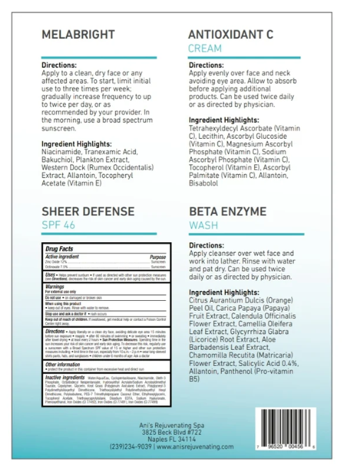 Skin Brightening Kit - Advanced Radiance Solutions Transform your skincare routine with our Skin Brightening Kit , meticulously designed to provide advanced solutions for enhancing skin luminosity and evenness. Includes: BETA ENZYME WASH Enzymatic cleanser combining botanical extracts such as Sweet Orange, Papaya, Calendula, and Aloe Vera for gentle yet effective cleansing. Enriched with 0.4% Salicylic Acid, Pro-vitamin B5 (Panthenol), and Allantoin to soothe and hydrate the skin. MELABRIGHT Powerful brightening formula with Niacinamide, Tranexamic Acid, Bakuchiol, Plankton Extract, and Western Dock (Rumex Occidentalis) Extract to reduce pigmentation and boost luminosity. Also contains Allantoin and Vitamin E (Tocopheryl Acetate) for smooth and protected skin. ANTIOXIDANT C CREAM Antioxidant cream with multiple forms of Vitamin C (Tetrahexyldecyl Ascorbate, Ascorbyl Glucoside, Magnesium Ascorbyl Phosphate, Sodium Ascorbyl Phosphate, Ascorbyl Palmitate) to brighten and protect the skin. Enhanced with Vitamin E (Tocopherol), Allantoin, and Bisabolol for soothing and revitalizing effects. SHEER DEFENSE 46 Broad-spectrum sunscreen with 12% Zinc Oxide and 7.5% Octinoxate to protect the skin from UV damage without clogging pores. Key Benefits: Enhances skin luminosity and evenness. Reduces pigmentation and dark spots. Protects against UV damage. Transform your skin with our Skin Brightening Kit and enjoy a revitalized, radiant complexion. Perfect for all skin types seeking improved luminosity and a more even tone.