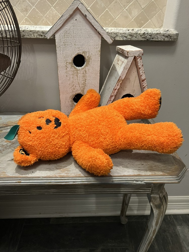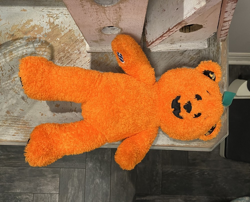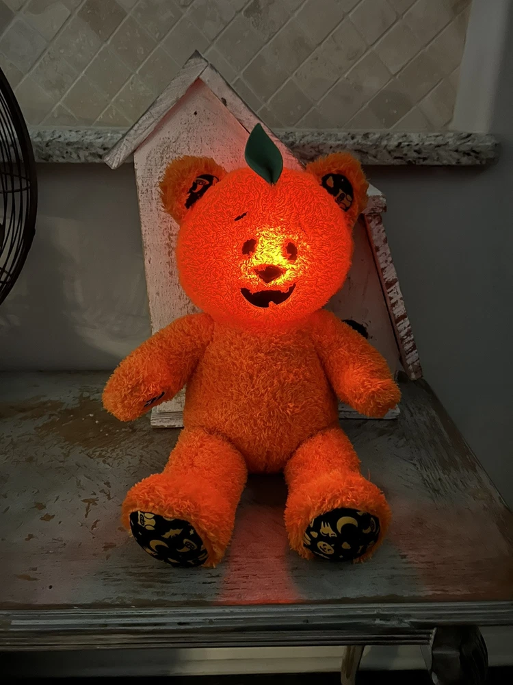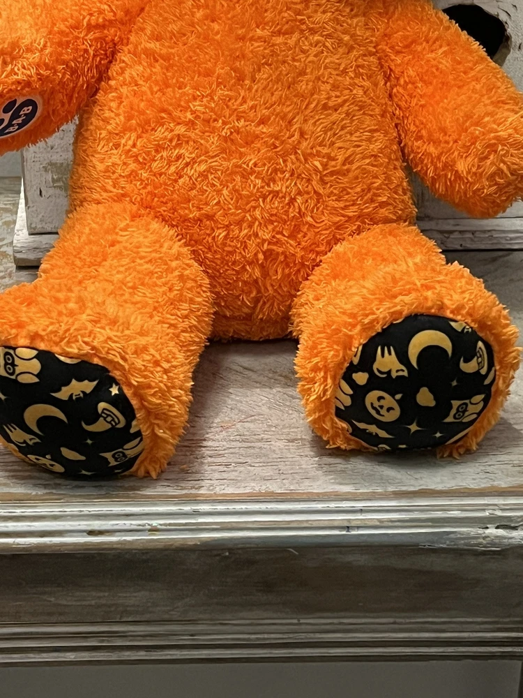 The Build-a-Bear Pumpkin Glow Halloween Teddy Bear is a 16-inch plush bear in orange color, featuring a Jack O Lantern character design perfect for Halloween. This original Build-A-Bear Workshop creation is made of plush material and includes a light-up feature that works. It is a single unit sold, not an antique, suitable for the time period of 2010-2019, and part of the Build-a-Bear franchise. This festive bear is a fun addition to any Halloween-themed collection or as a playful decoration during the spooky season. Will ship without batteries.