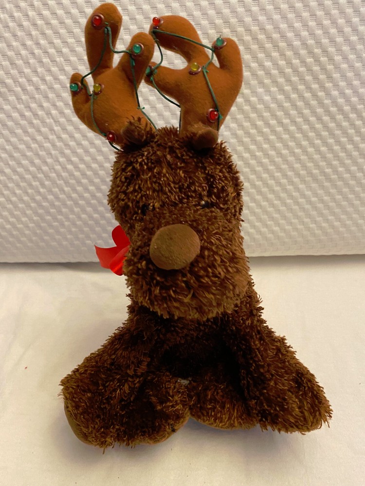 Brown Reindeer with light up antelers plush. Sings jingles bells, head moves white he sings. Great addition to your home for christmas decor. Charming plush reindeer antlers light up as he sings jingle bells and his head dances around. Vintage.