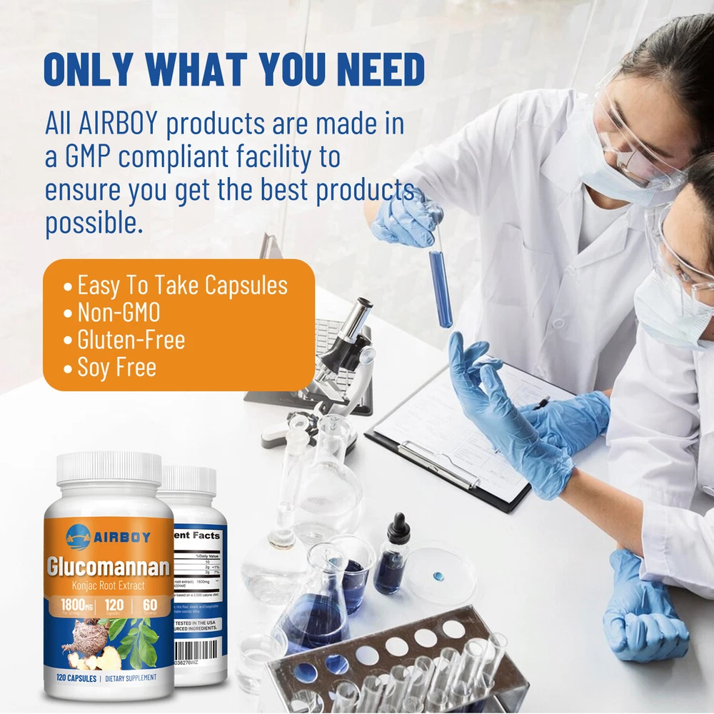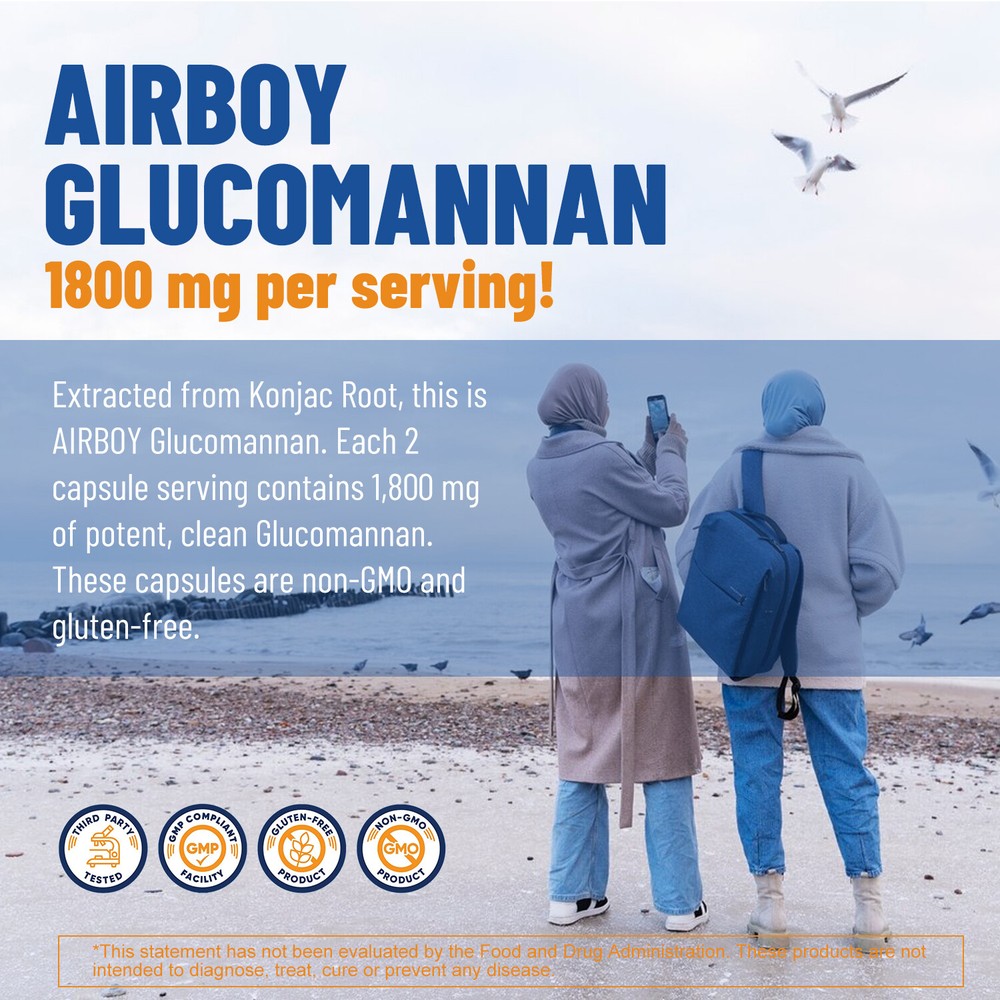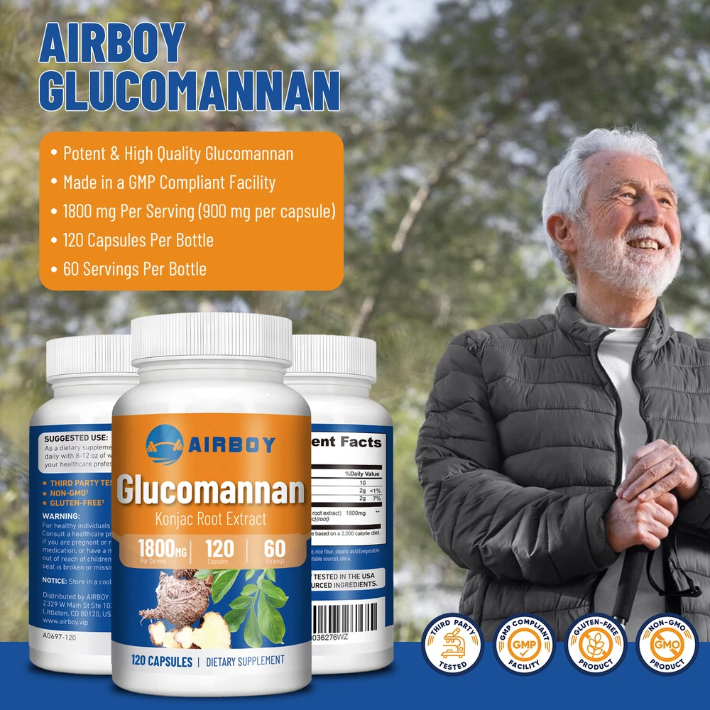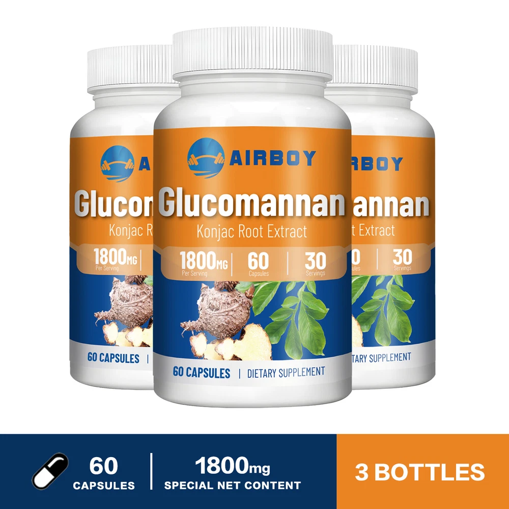 Effects: Weight Loss, Weight Management Ingredients: Glucomannan Directions: Take 2 capsules once daily after a meal. Shipping: Ships within 48 hours on working days. Shelf life: 2 years Description: Airboy offers high quality glucomannan capsules containing 1800 mg of glucomannan each. Glucomannan is a soluble puffed fiber extracted from konjac root that absorbs water and expands in the stomach, creating a feeling of fullness and reducing hunger. Glucomannan can help you lose weight, suppress appetite, reduce fat absorption and calorie intake, making it easier for you to achieve your ideal weight goals. 100% Natural Ingredients: Our products are made with 100% natural ingredients. gluten-free, vegan, non-GMO and sugar-free. Document