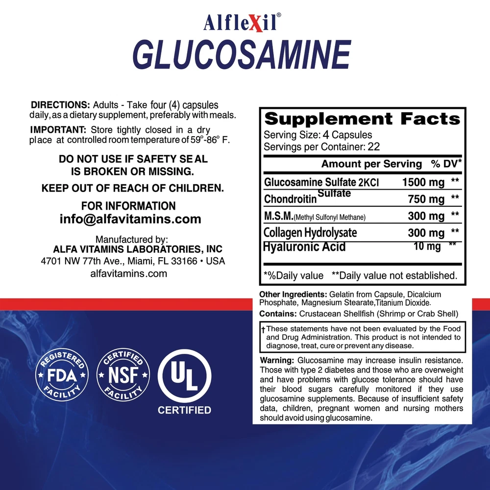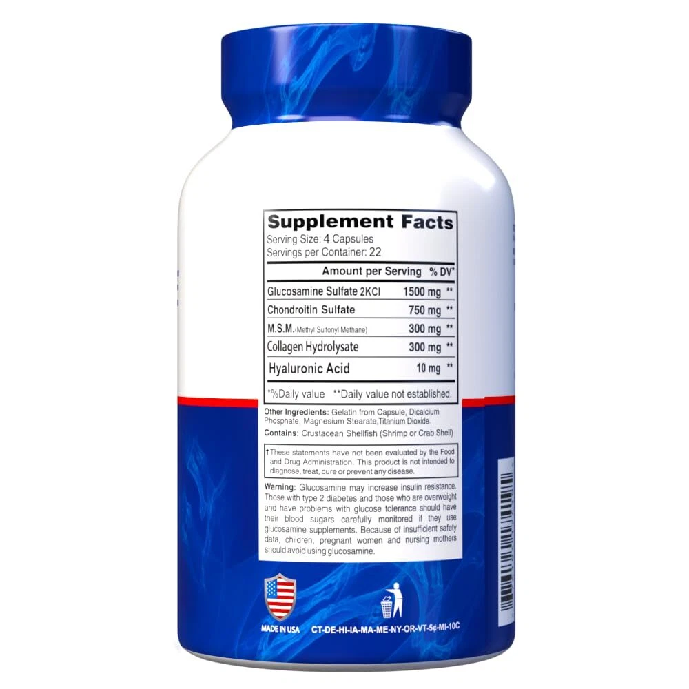 provides glucosamine, chondroitin, collagen and MSM (Methyl Sulfonyl Methane). Daily intake may help support the elasticity and cushioning in joints. Provides Glucosamine, Chondroitin, MSM, and Collagen from a natural source. May help with lubrication and mobility. 🔹ALL THE SUPPORT YOU NEED - Provides Glucosamine, Chondroitin, MSM, and Collagen from a natural source 🔹are small and easy to swallow. Helps support movement and wellbeing. 🔹EXTRA POWERFUL 4-IN-1 FORMULA - What makes really stand out from other joint support supplements is its specially formulated 4-in-1 composition. Apart from glucosamin and chondroitin, it also contains MSM, an organic source of sulfur, as well as extra collagen - which also benefits your skin . 🔹PREMIUM QUALITY MADE IN USA - When it comes to our nutritional and dietary supplements, we make a point of using nothing but the finest quality and natural ingredients we can get our hands on, as well as state-of-the-art production processes and strict quality control. all of our products are sealed together for safety! 🔹ORDER IT NOW, RISK FREE! - At Alfa Vitamins, we stand 100% behind our glucosamine & chondroitin supplements. After all, some of us use them ourselves! If, however, the you receive doesn't live up to your expectations, don't hesitate to us and benefit from our money back policy!