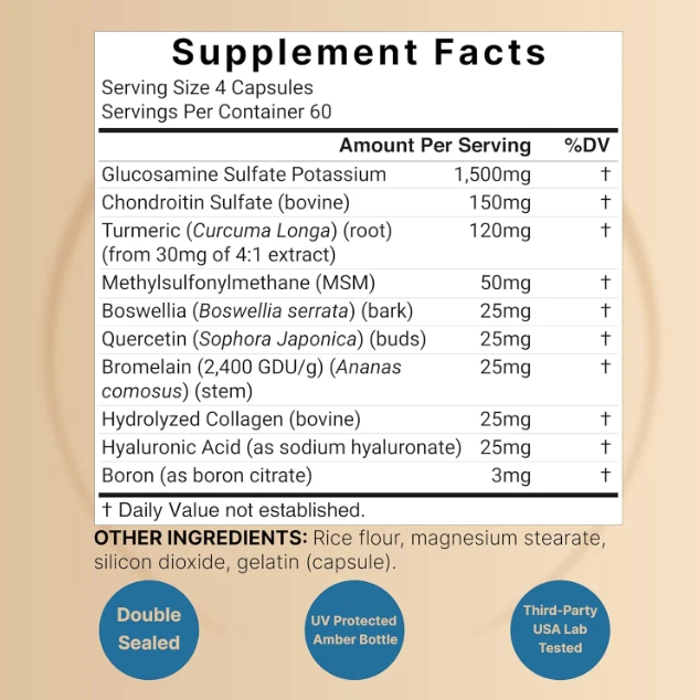 Glucosamine Chondroitin Turmeric MSM Boswellia - Supplement Support Seal for- US Warehouse - FREE & FAST Shipping in US Product Description: These statements have not been evaluated by the FDA. This product is not intended to diagnose, treat, cure, or prevent any disease or health condition. 10-in-1 advanced joint health formula, combines essential joint nutrients that include antioxidants, herbals, minerals, and enzymes, supports joint comfort, mobility, and lubrication. 240 capsules per bottle, provides a 2-month supply that includes 1,500mg glucosamine with chondroitin, turmeric, MSM, boswellia, quercetin, bromelain, hydrolyzed collagen, hyaluronic acid, and boron. Promotes natural joint flexibility and structure, helping combat age-related concerns and signs of discomfort. A complete joint formula that is designed for any lifestyle, helping you stay active, whether you’re jogging, doing chores, or simply want to move with ease. Authentic non-GMO supplements. Contains pure ingredients free of soy, dairy, gluten, wheat, eggs, fish, shellfish, peanuts, and tree nuts. 3rd party lab tested for safety and potency. Feedback: 1.Any question for your order, please contact us in time, we will reply to you within 24 hours and give you a satisfactory answer. 2.If you are satisfied with our products and services, hope to take up your a little precious time to leave feedback reviews for our products.Thanks! 3.Your satisfaction is our effort. Welcome to order again! Have a great day! Our Policy: 100% Satisfaction Guarantee 20% of restocking fee will be charged for return item