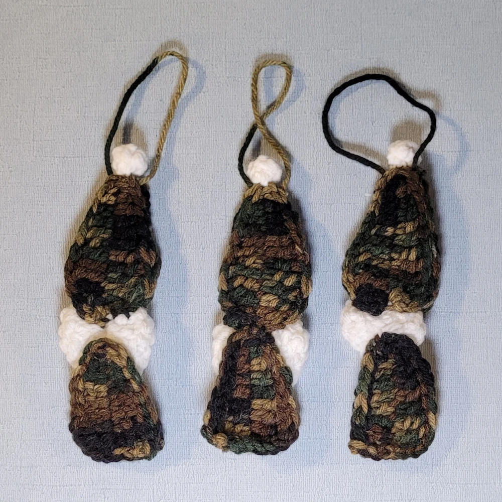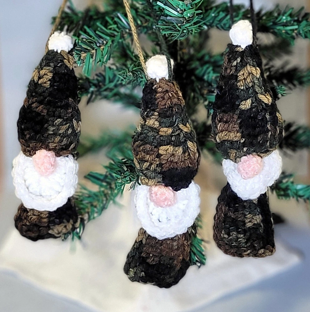 These Gnome Christmas Ornaments Set of 3 are a super-cute addition to your decorations! Handmade crochet from camouflage acrylic yarn, each gnome has a white beard and a pink puffy nose. Each ornament is about 6 inches tall & 2 inches wide, and has a 3 inch hanging loop. They are the perfect size for office decorations, attach to a package as an "extra" gift, or divide up for teachers' or colleagues' gifts. Ready-to-Ship, USPS Ground Advantage. International Shipping as well as expedited shipping are available; please contact me PRIOR to making your purchase (buyer pays in full). Please note-due to the handcrafted, 1-of-a-kind, “imperfectly unique” nature of this item, all sales are final & returns are not accepted. Confirm sizes & color; contact me if you have questions! 15% Bundle Discount when you spend $15 -just add to your cart! Thanks for looking! (Props not included with purchase.)