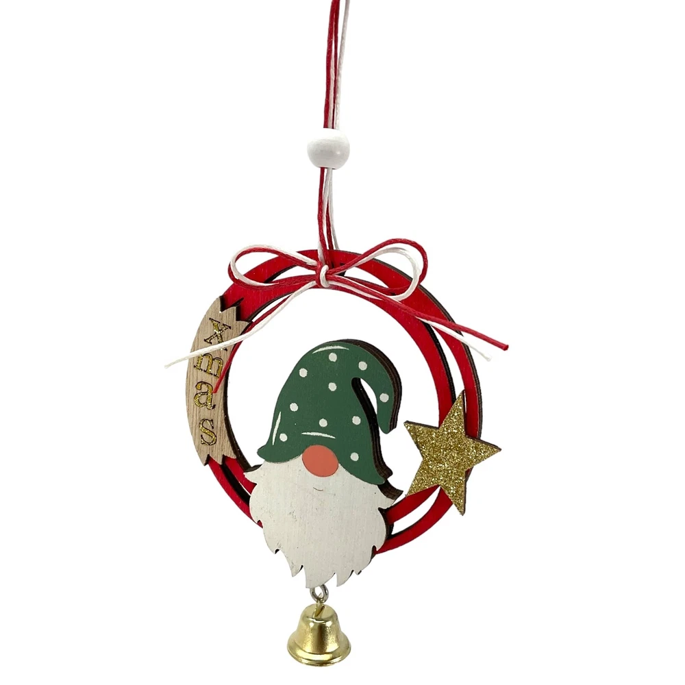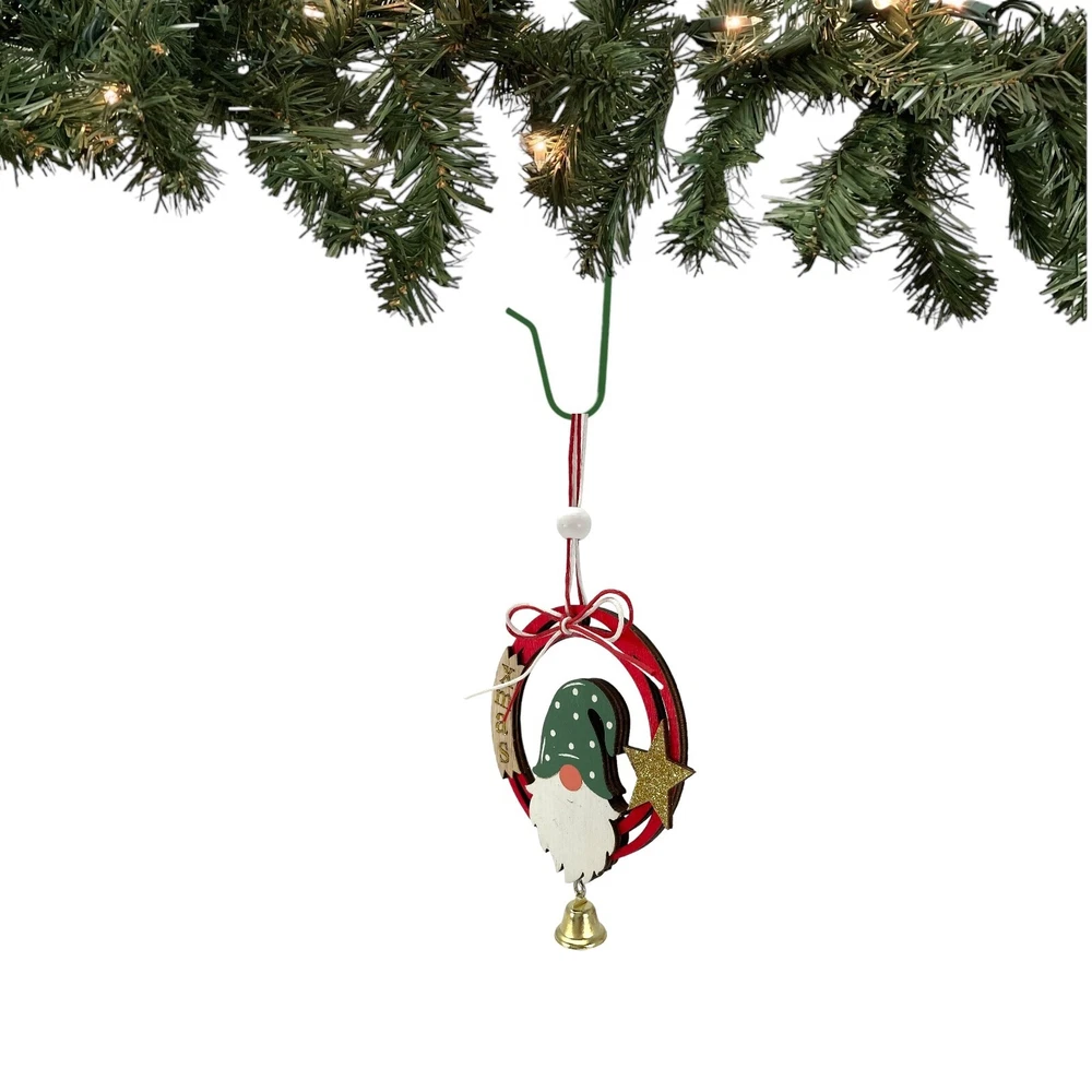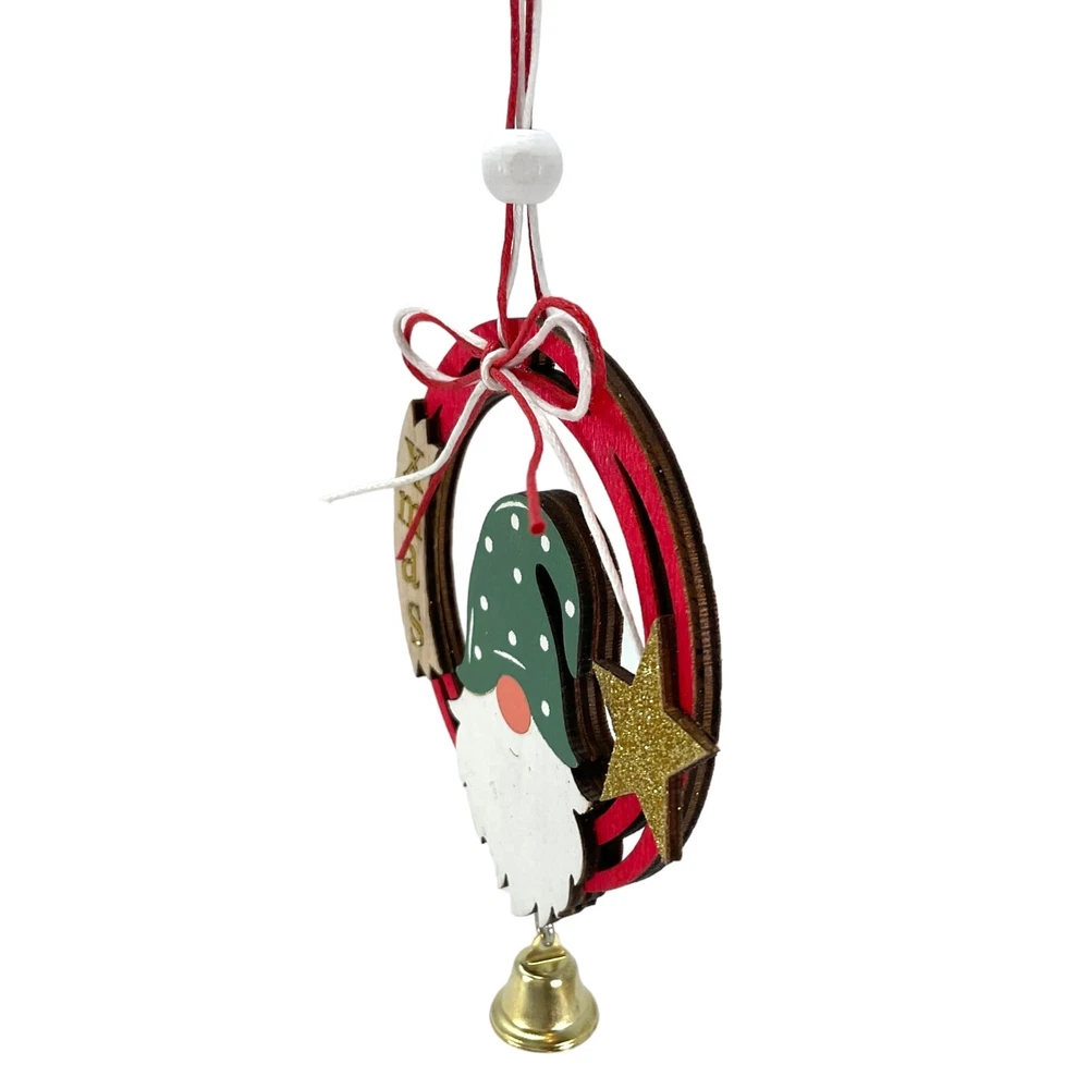 Gnome and Gold Star Wood Christmas Ornament with Hanging Bell 6 Inch